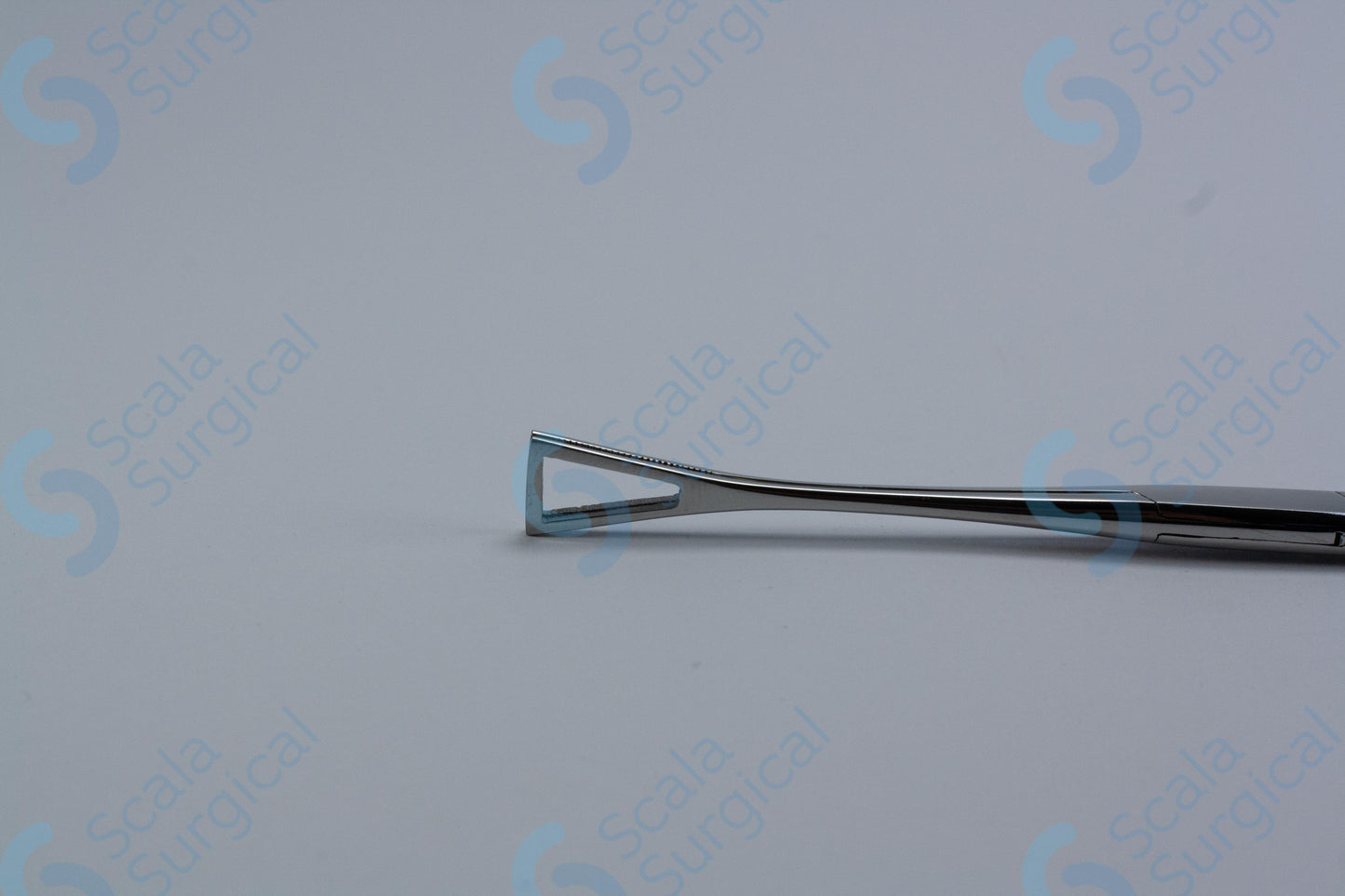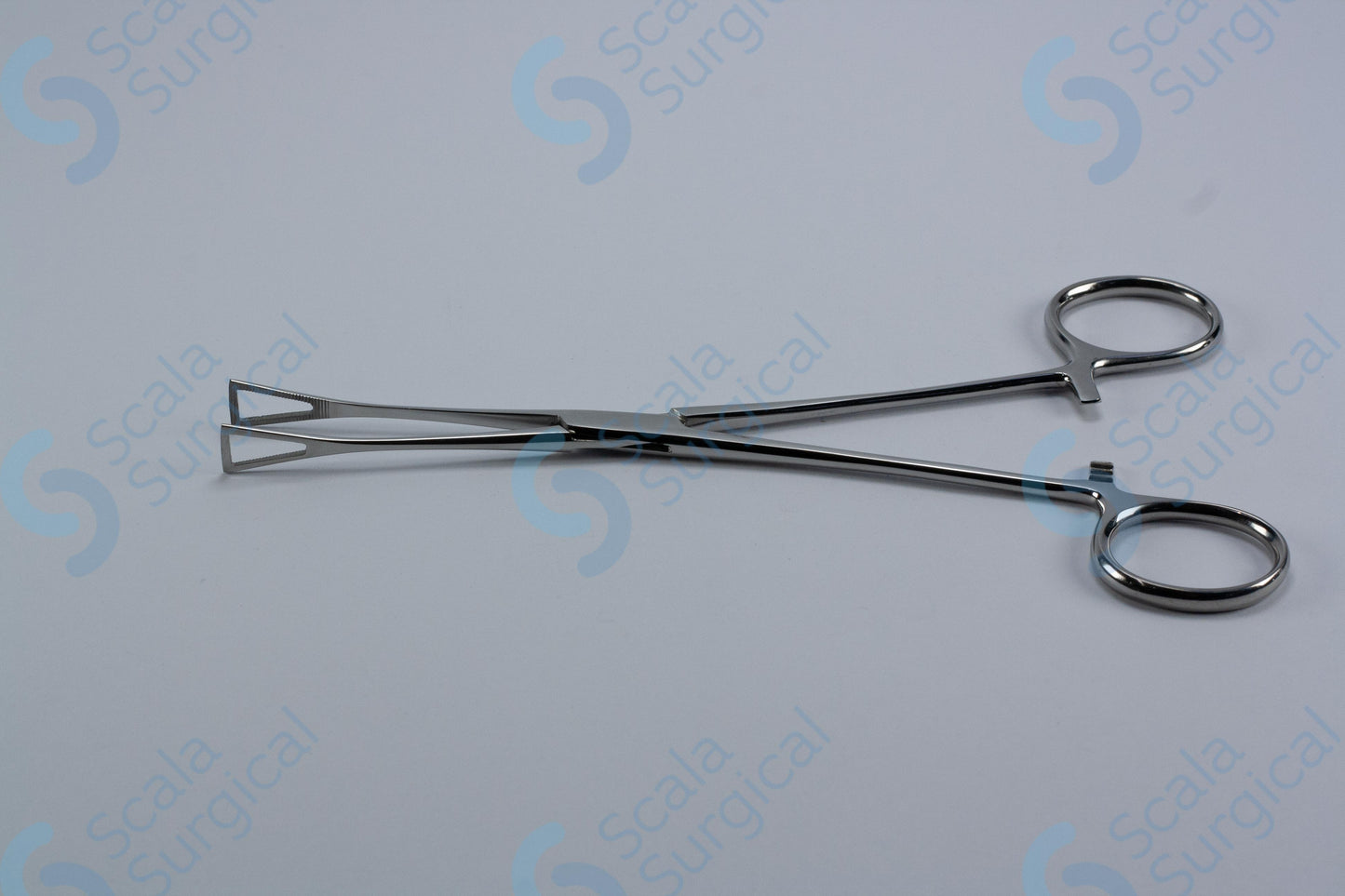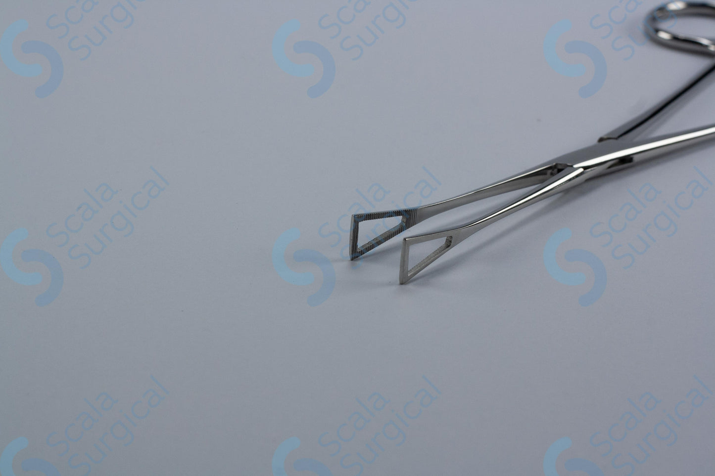 This is a type of surgical instrument used to hold tissue in place during a surgical procedure. The triangular shape of the jaws allows it to hold tissue securely while the horizontal serrations help to grip the tissue. The BJ 152.4 mm measurement refers to the size of the instrument.