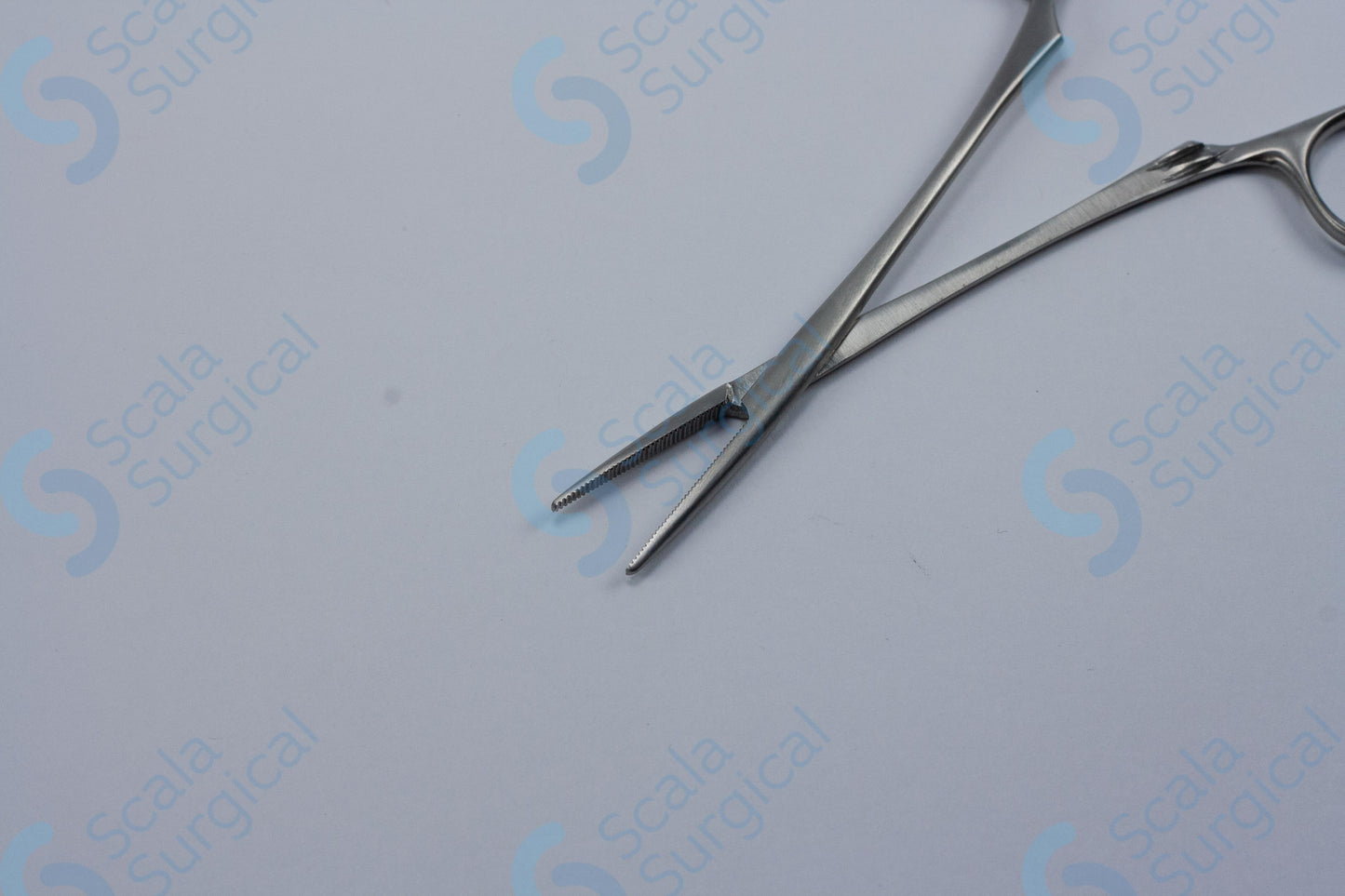 Halsted-Mosquito Artery Forceps are surgical instruments used to clamp and hold blood vessels during surgery. They have horizontal serrated jaws and a straight screw joint, which allows them to be adjusted to different sizes. The 127mm (5 inch) size is a common size used in many surgical procedures.
