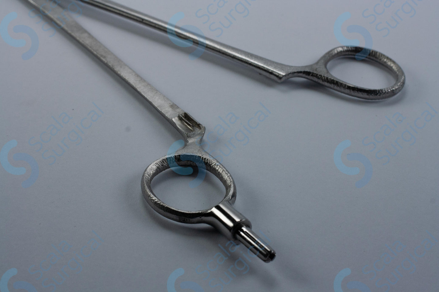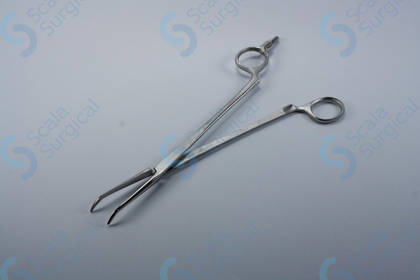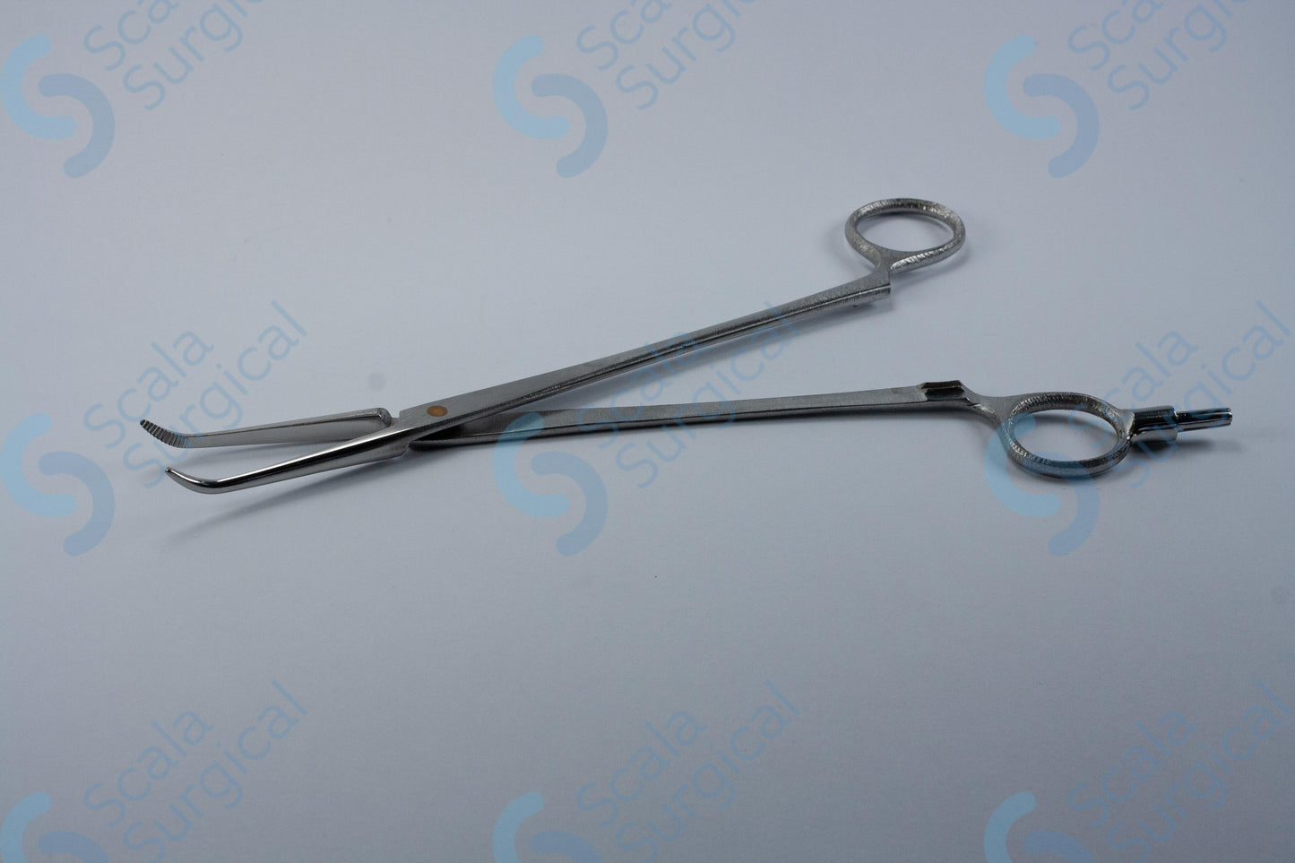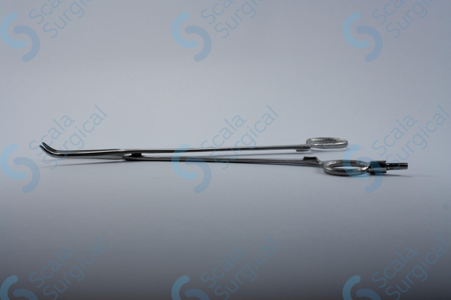 Ritches diathermy blanks artery forceps curved with pin (234mm) (9? inch) are used to clamp and cut tissue during surgical procedures. The forceps have a pin at the tip that is used to create a seal between the tissue and the forceps to prevent the tissue from slipping while the forceps are being used. The forceps are curved to allow the surgeon to reach deeper into the body cavity. The length of the forceps (234mm or 9? inch) is designed to provide the surgeon with the necessary reach during the procedure.