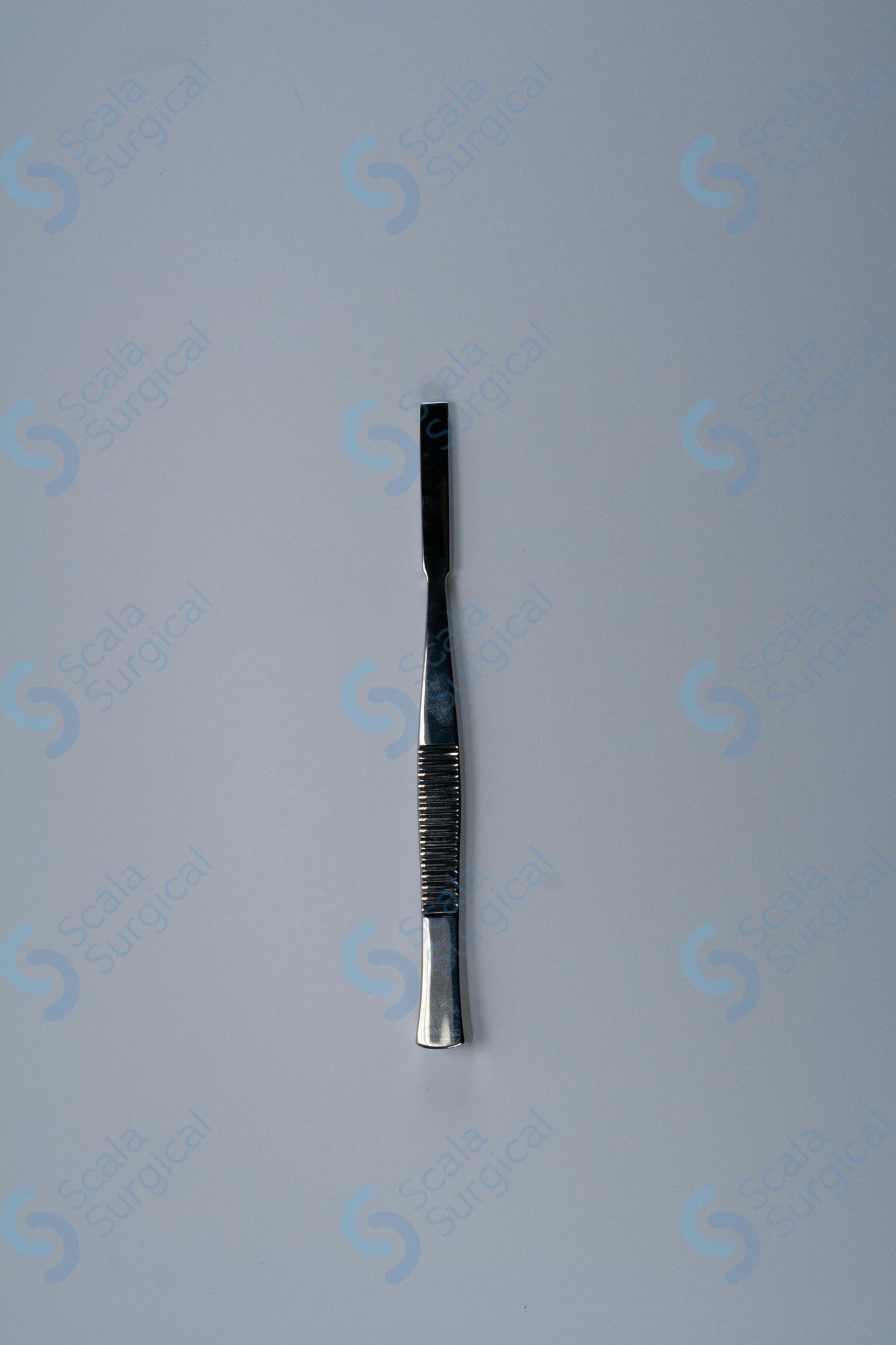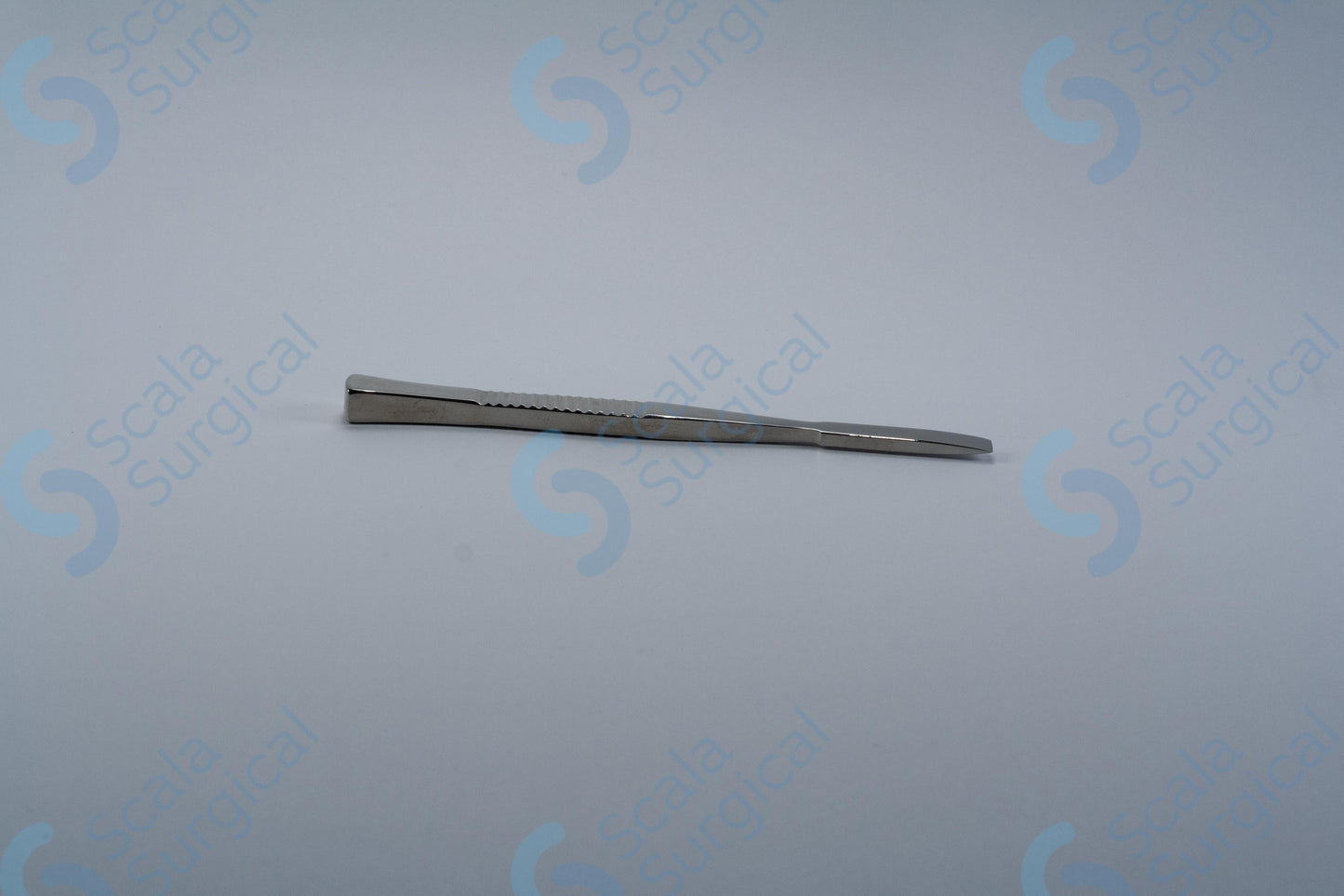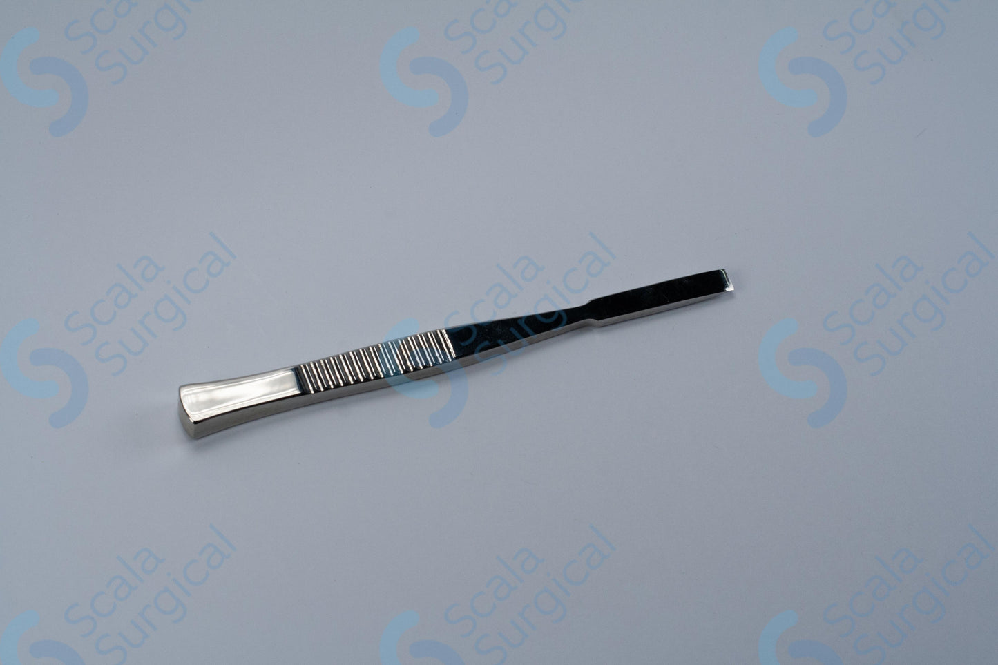 A bone osteotome square grooved handle is a surgical tool used to cut through bone. It has a sharp, square end that is grooved to help guide the osteotome through the bone. The width of the tool is 6mm (139.7mm or 5? inch). It is commonly used in orthopedic surgery to cut through bone for procedures such as joint replacement, fracture repair, and spinal surgery.
