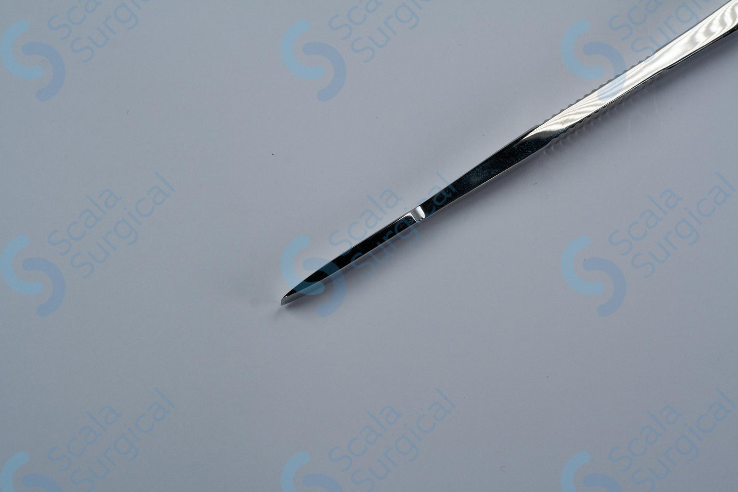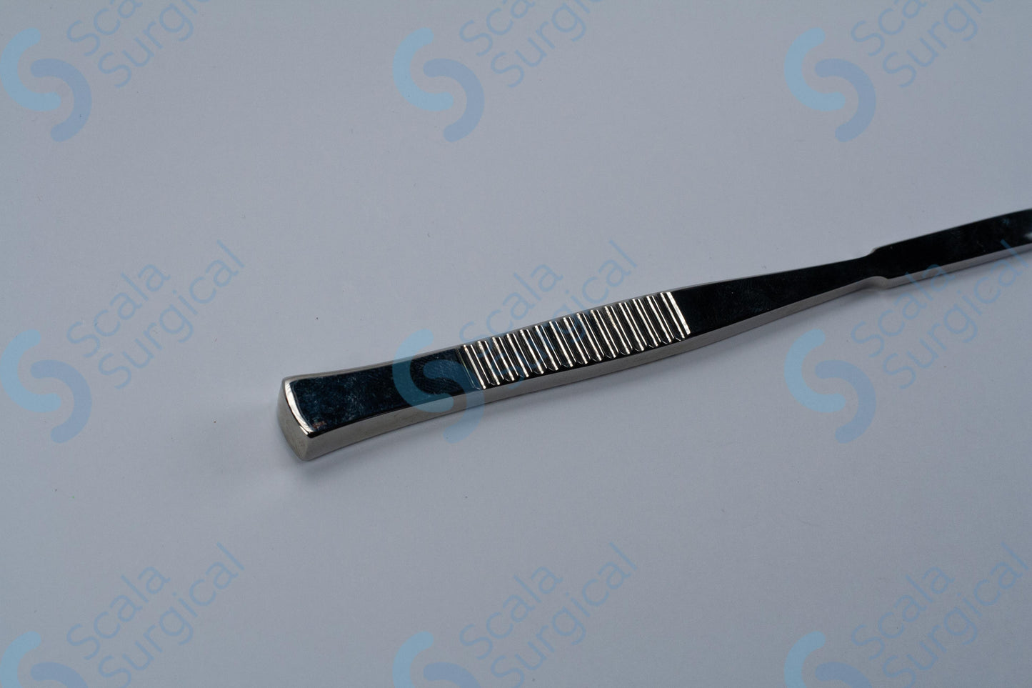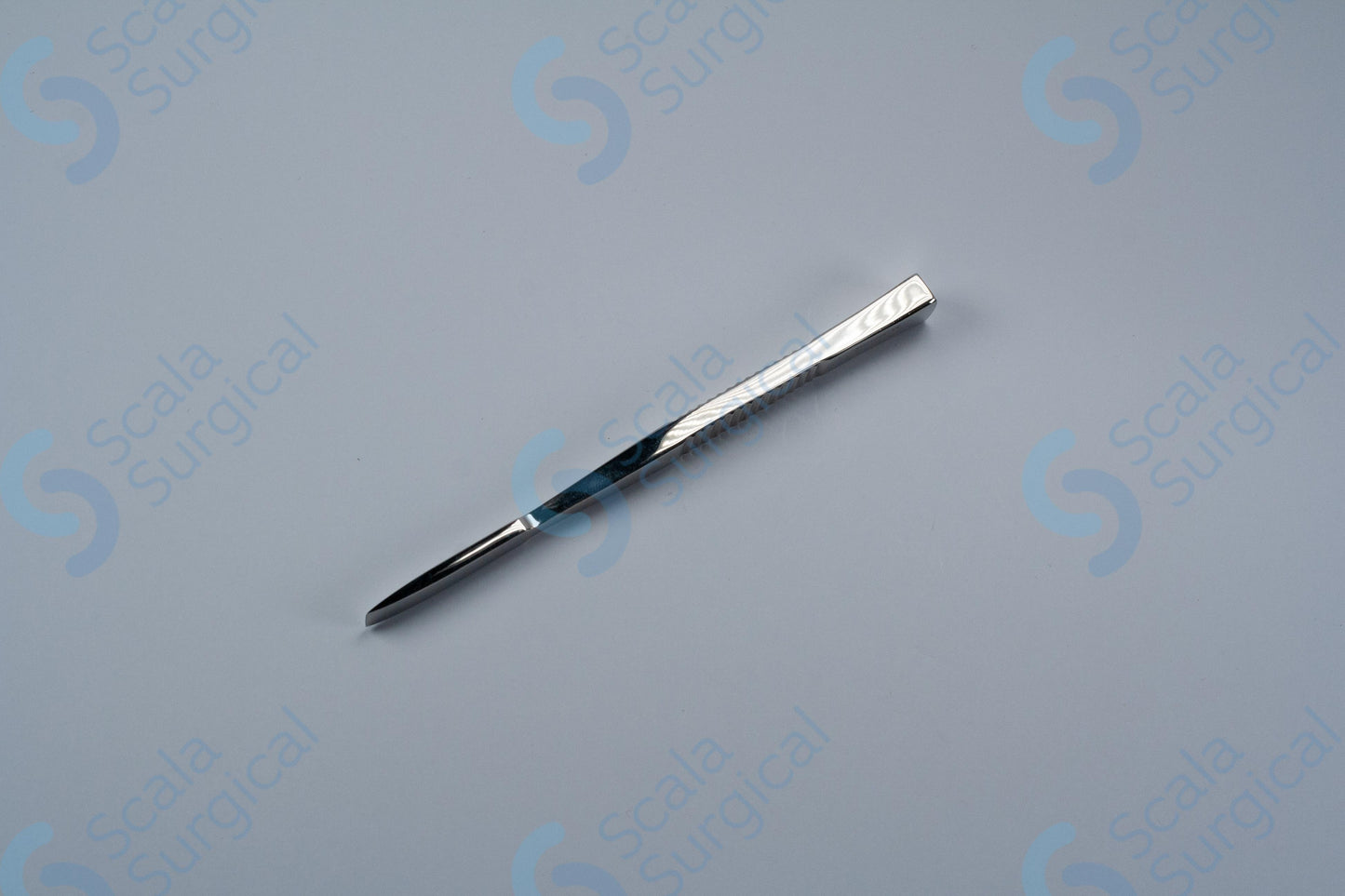 A bone osteotome square grooved handle is a surgical tool used to cut through bone. It has a sharp, square end that is grooved to help guide the osteotome through the bone. The width of the tool is 6mm (139.7mm or 5? inch). It is commonly used in orthopedic surgery to cut through bone for procedures such as joint replacement, fracture repair, and spinal surgery.