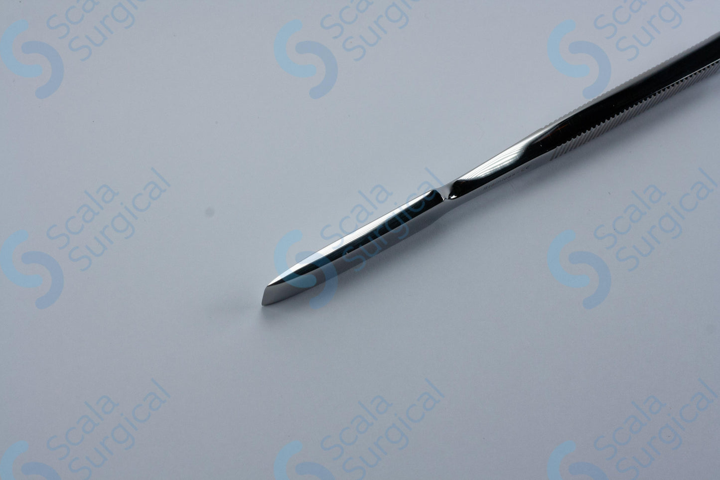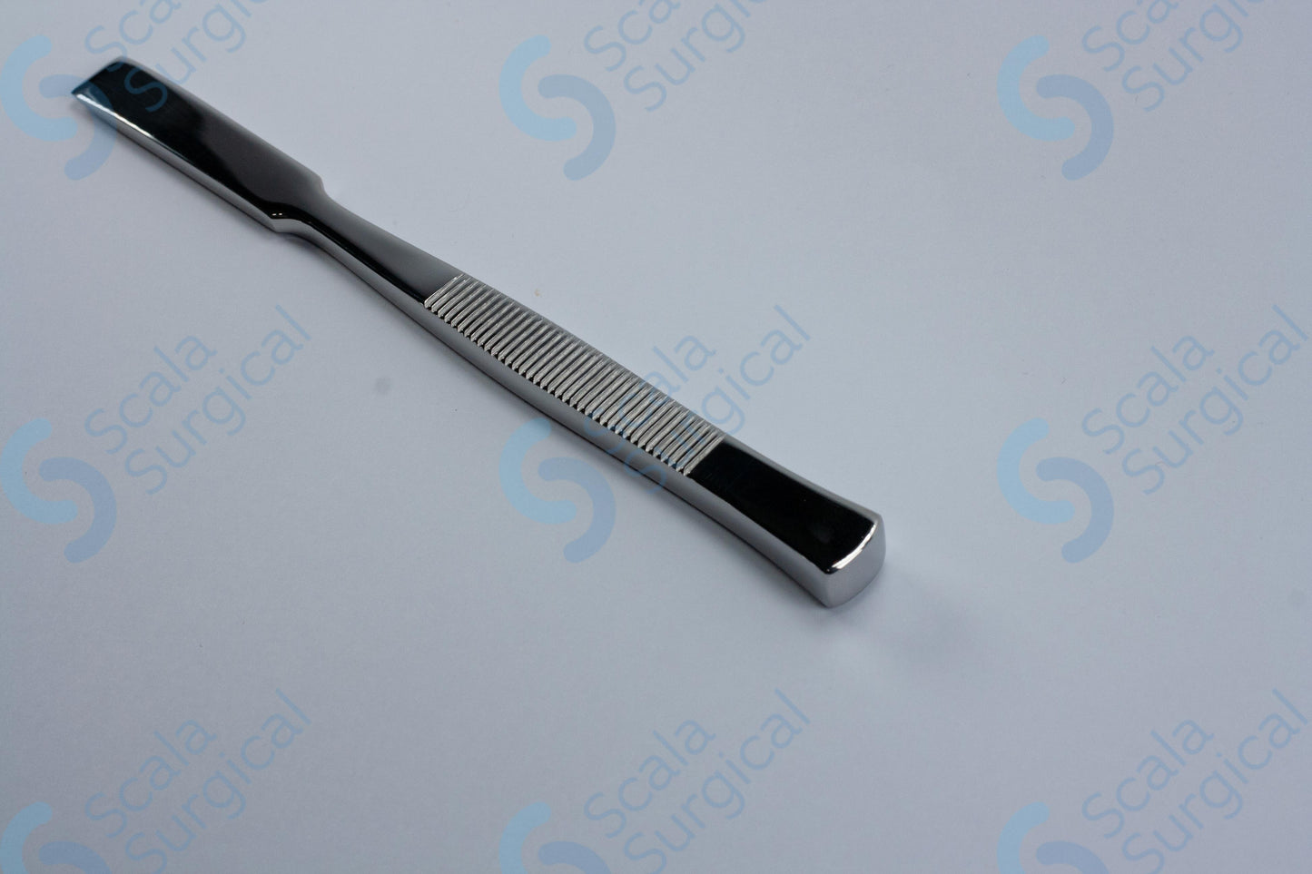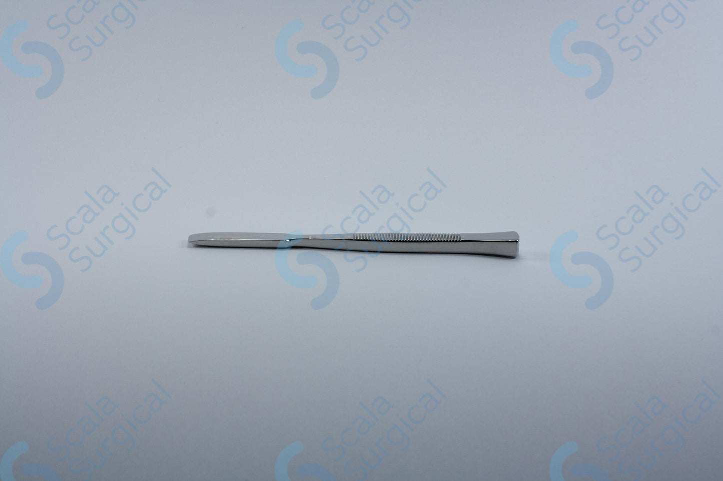 A bone osteotome with a square grooved handle is a surgical instrument used to cut bone during orthopedic procedures. It is typically used for cutting bone for joint replacement, bone grafting, and other bone surgery. The width of the osteotome is 10mm and the overall length is 139.7mm (5? inch).