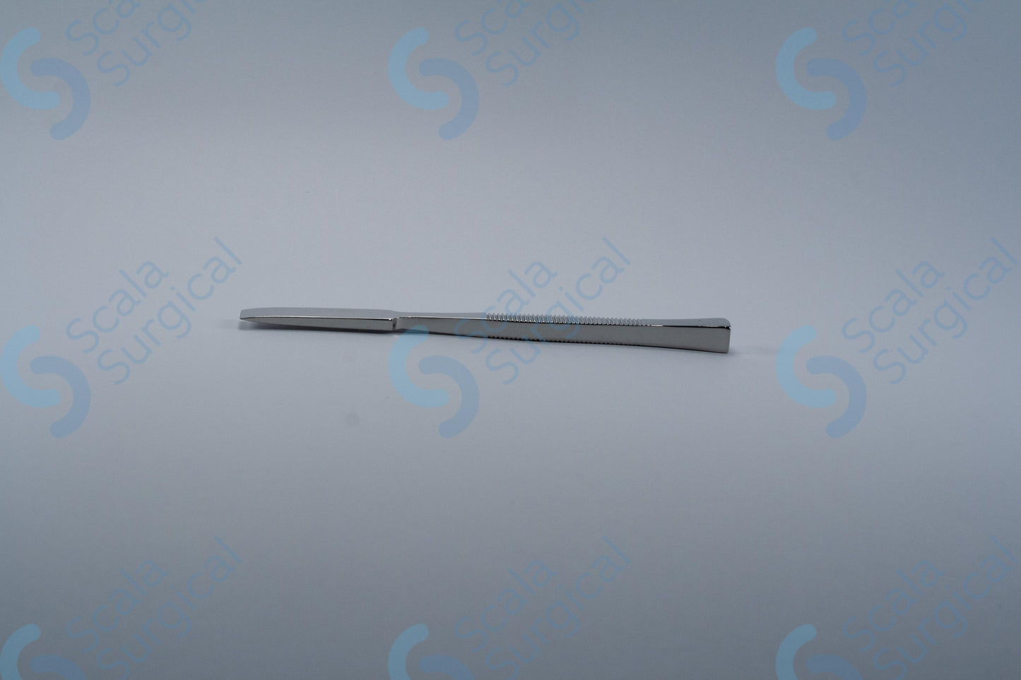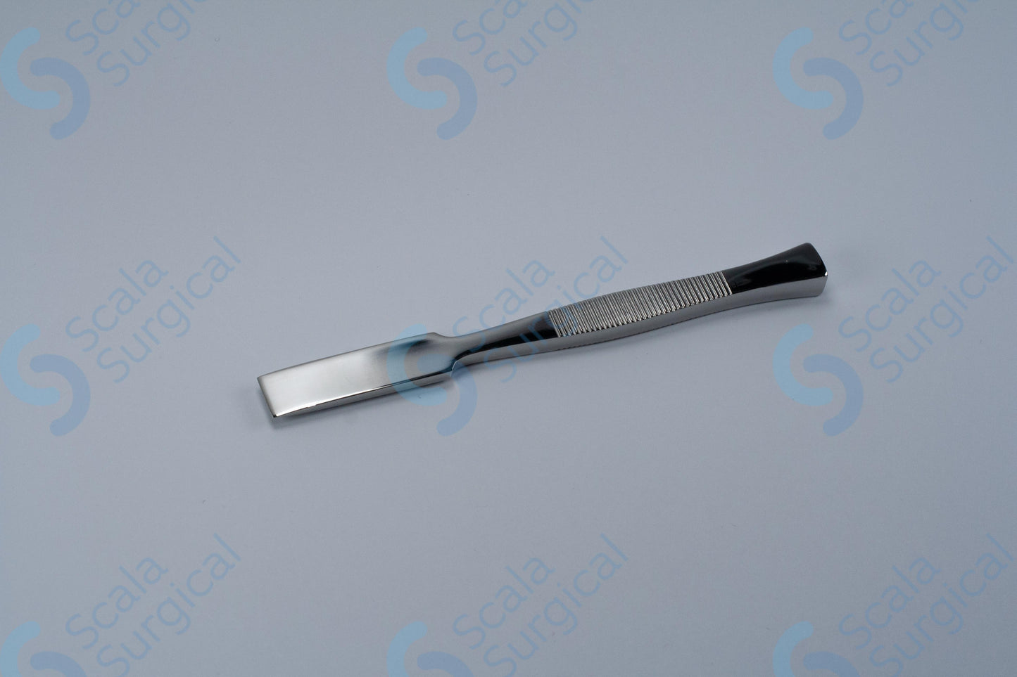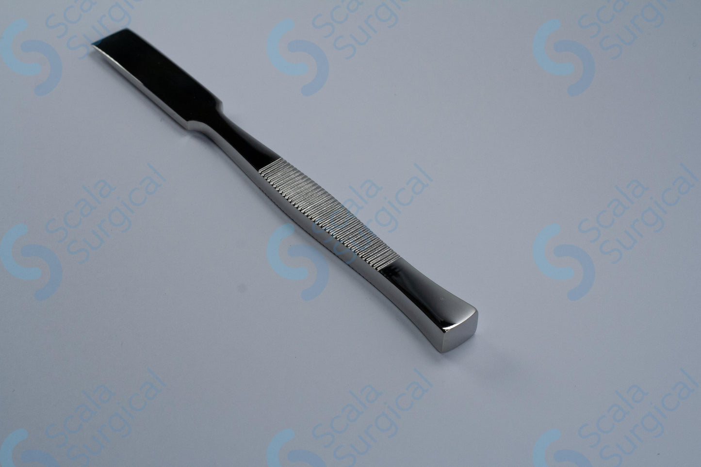 A bone osteotome square grooved handle is a surgical instrument used to cut through bone. It is typically used in orthopedic surgery, plastic surgery, and neurosurgery. The width of the osteotome determines the size of the cut that can be made. The width of this particular osteotome is 12mm (0.47 inches). The total length of the instrument is 139.7mm (5.5 inches).