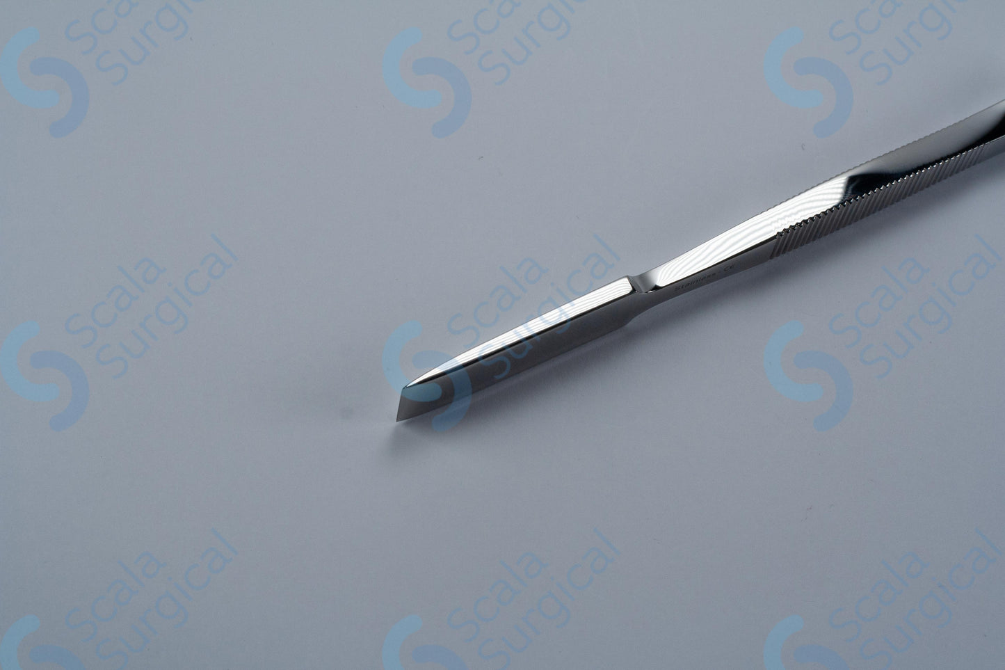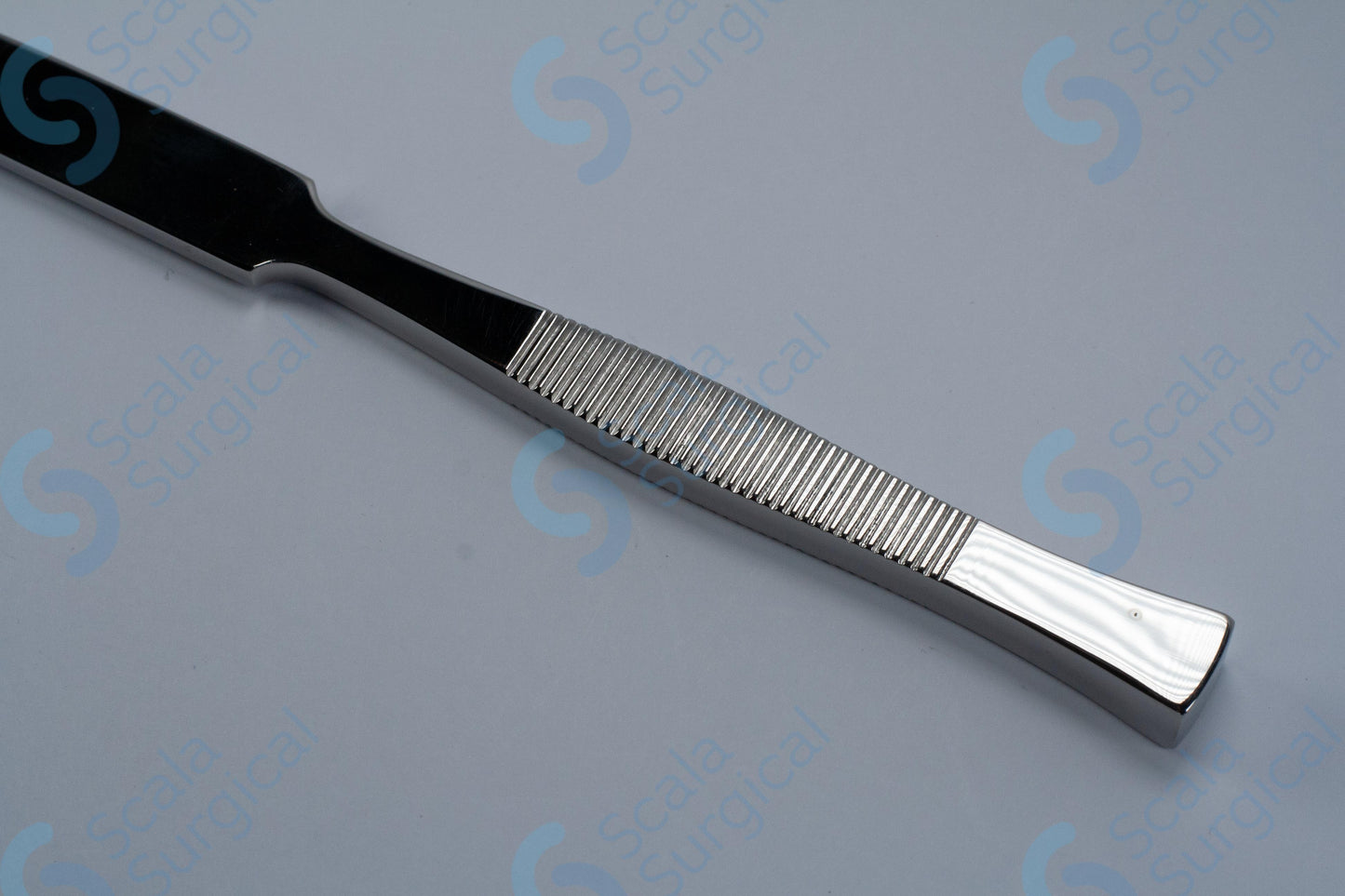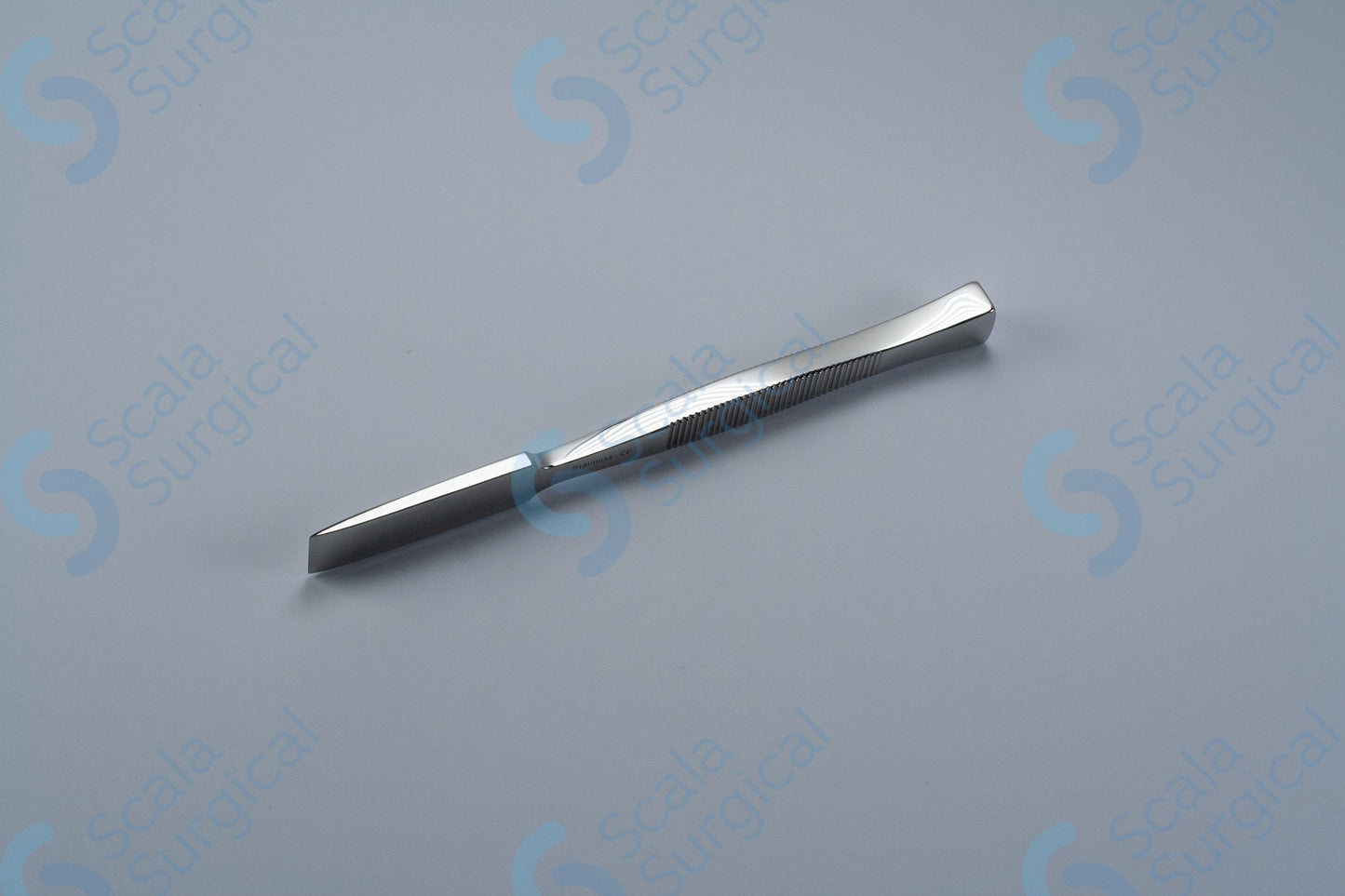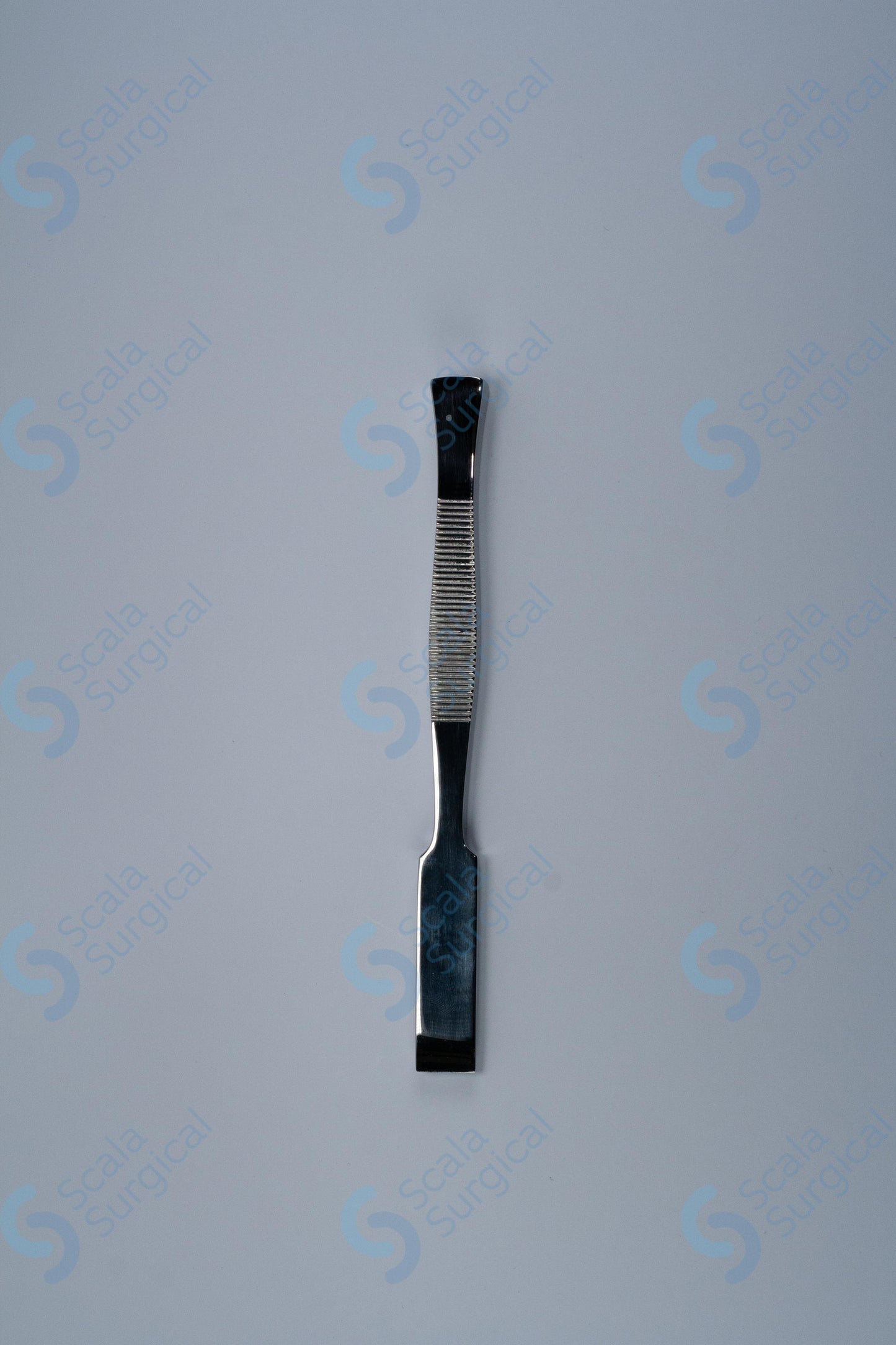 A bone osteotome square grooved handle is a surgical instrument used to cut through bone. It is typically used in orthopedic surgery, plastic surgery, and neurosurgery. The width of the osteotome determines the size of the cut that can be made. The width of this particular osteotome is 12mm (0.47 inches). The total length of the instrument is 139.7mm (5.5 inches).
