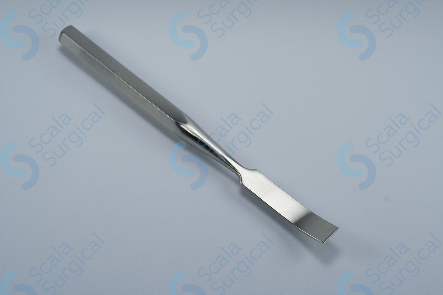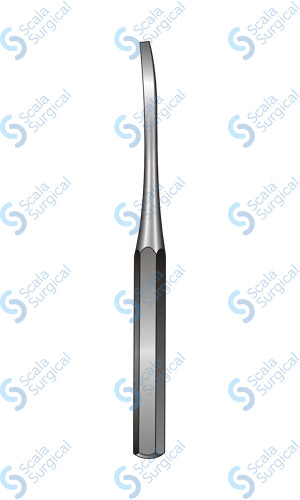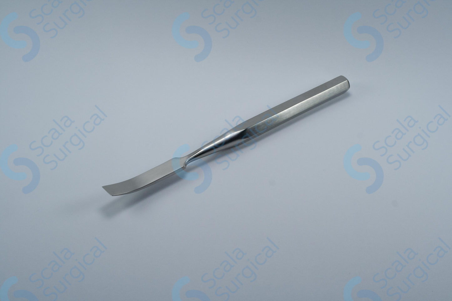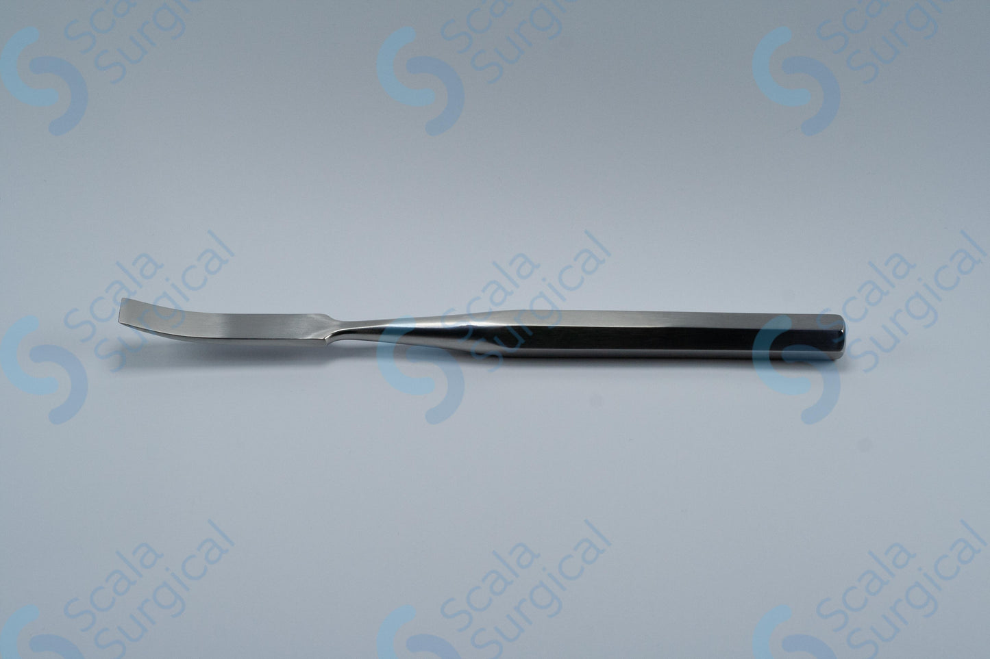 An osteotome is a surgical instrument used to cut or shape bone. The Hibbs Bone Osteotome Curved has a curved blade that is 13mm wide and 241.3mm long (or 9? inches). It is typically used to remove small pieces of bone during joint replacement or other orthopedic procedures.