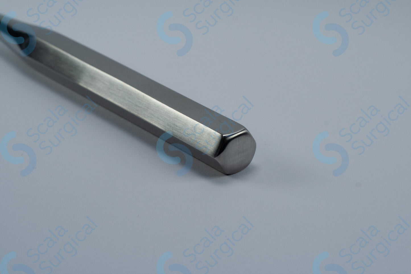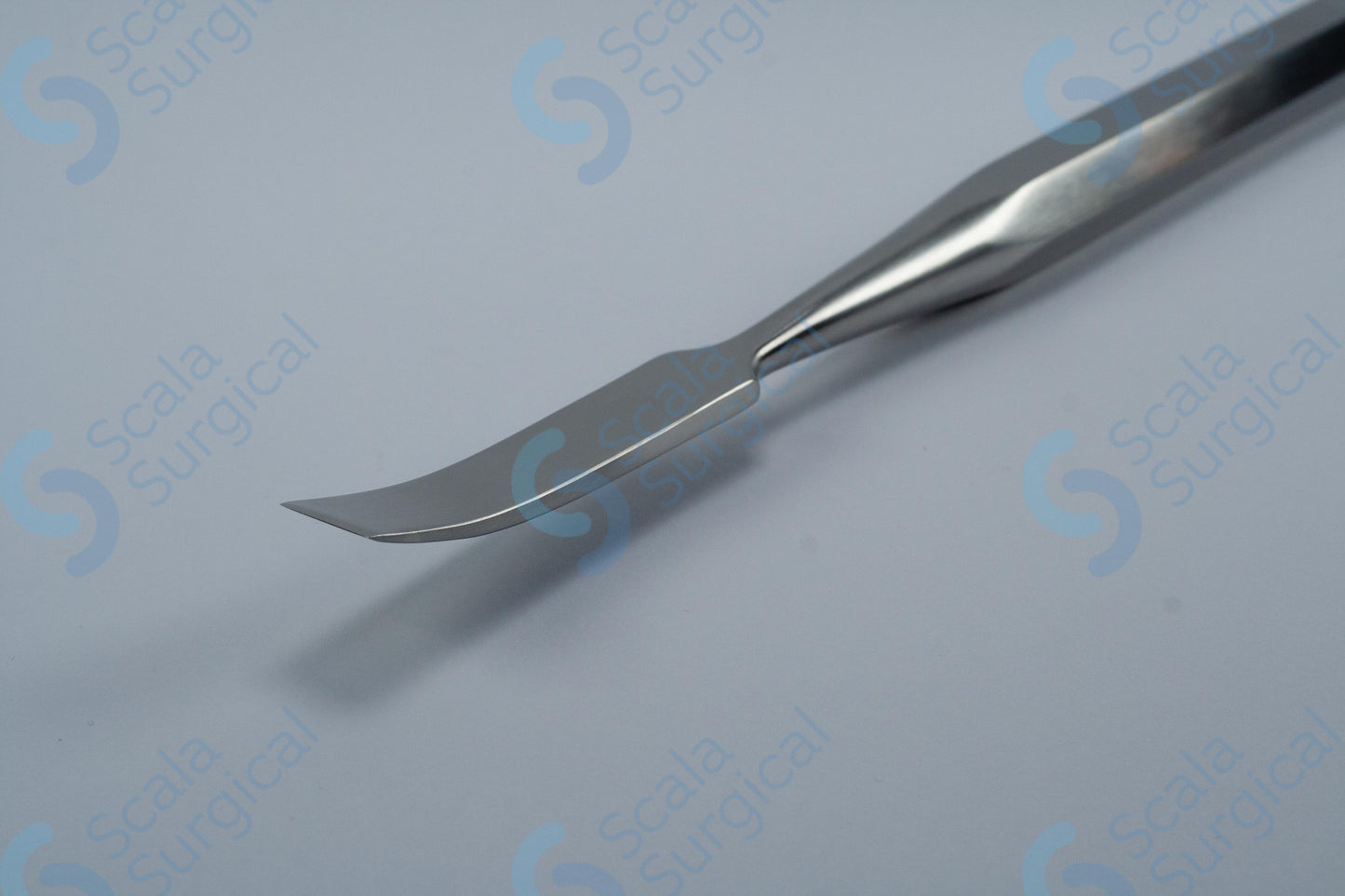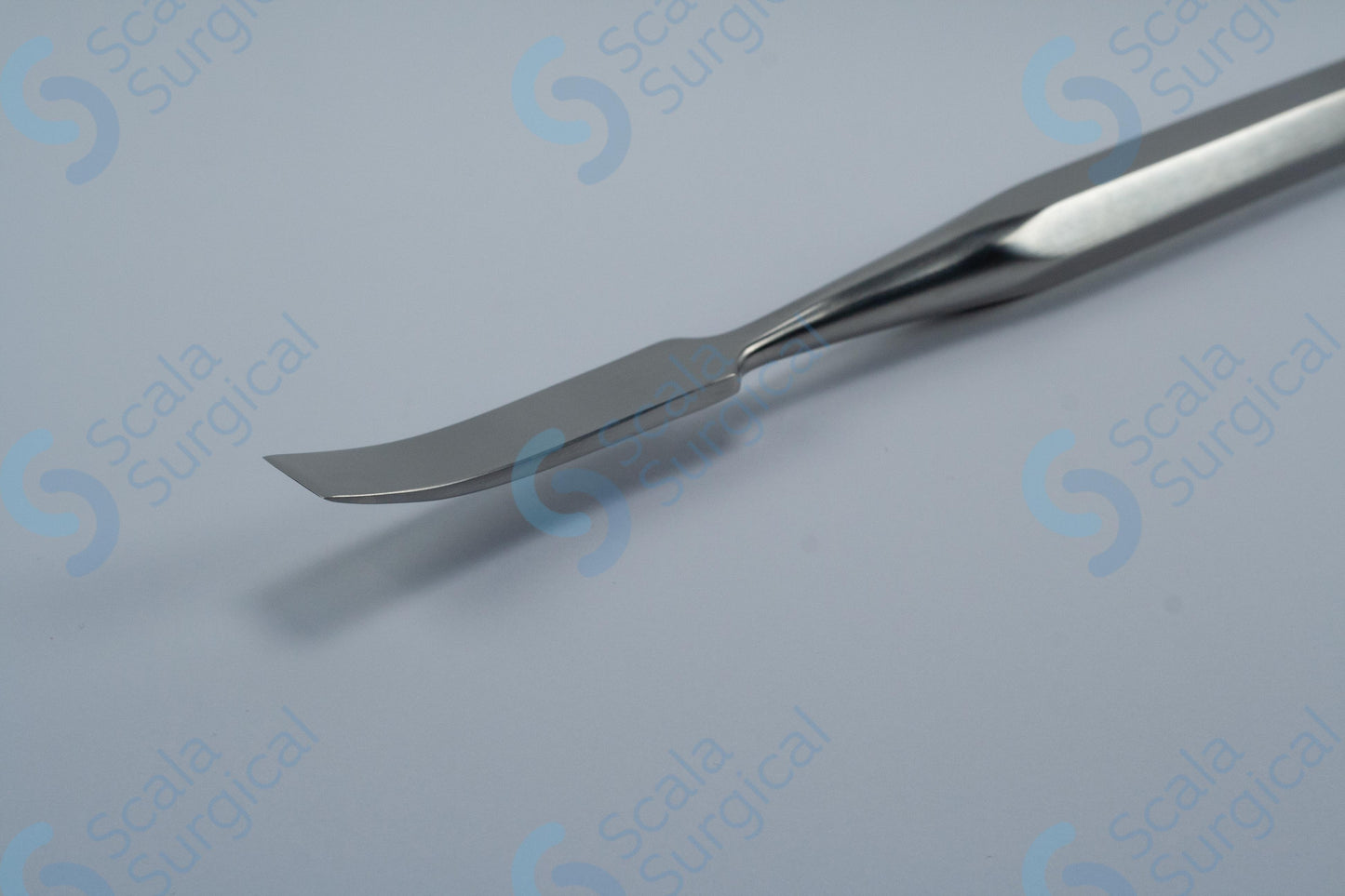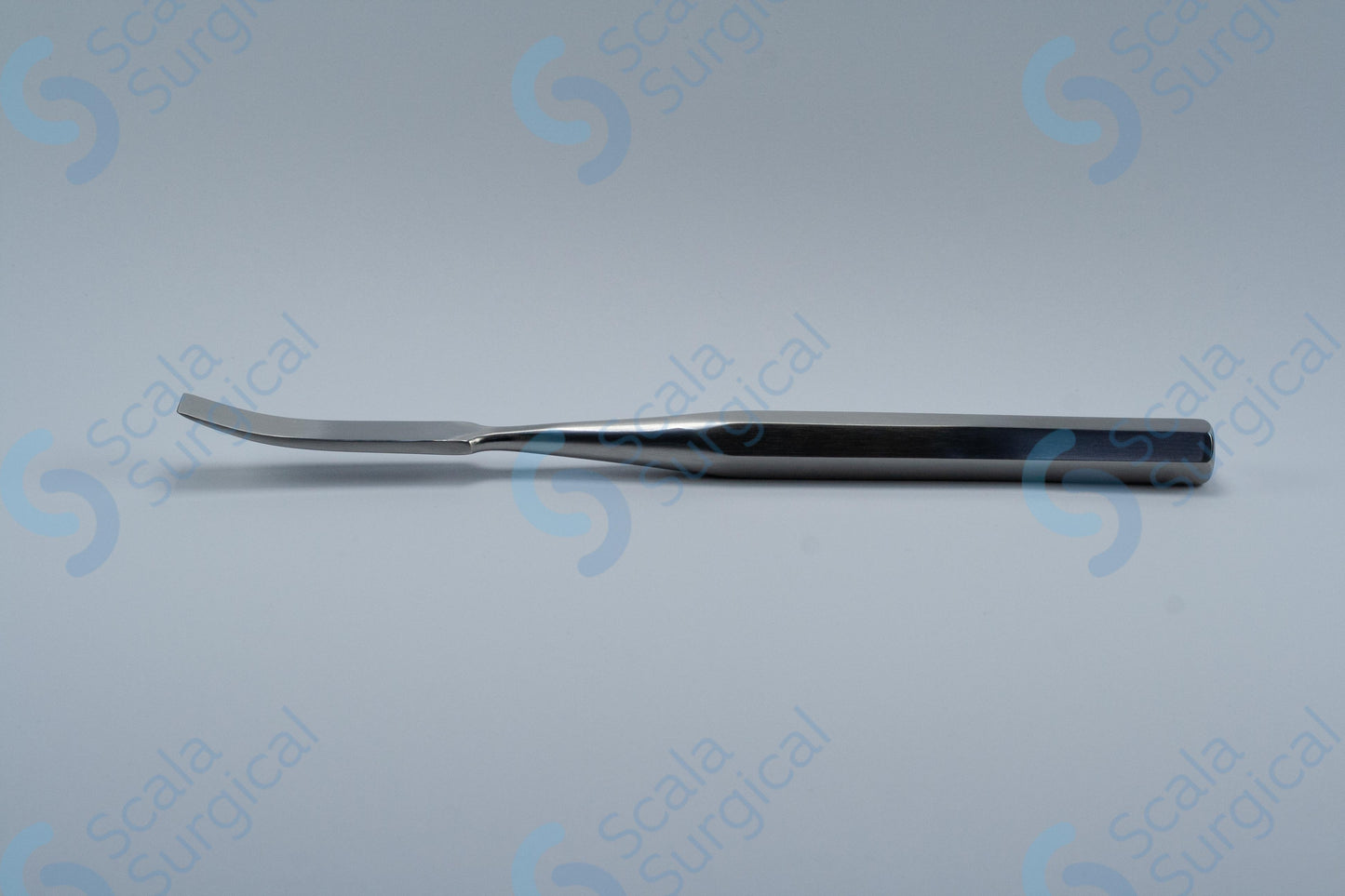 An osteotome is a surgical instrument used to cut or shape bone. The Hibbs Bone Osteotome Curved has a curved blade that is 13mm wide and 241.3mm long (or 9? inches). It is typically used to remove small pieces of bone during joint replacement or other orthopedic procedures.
