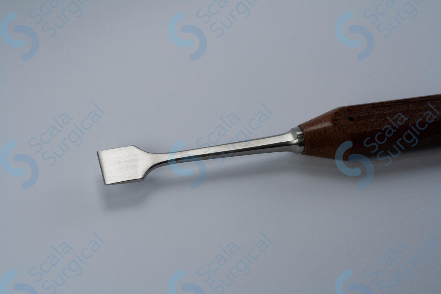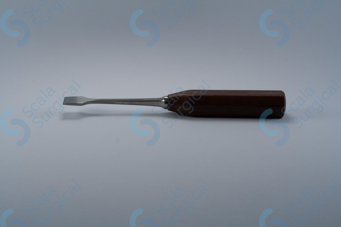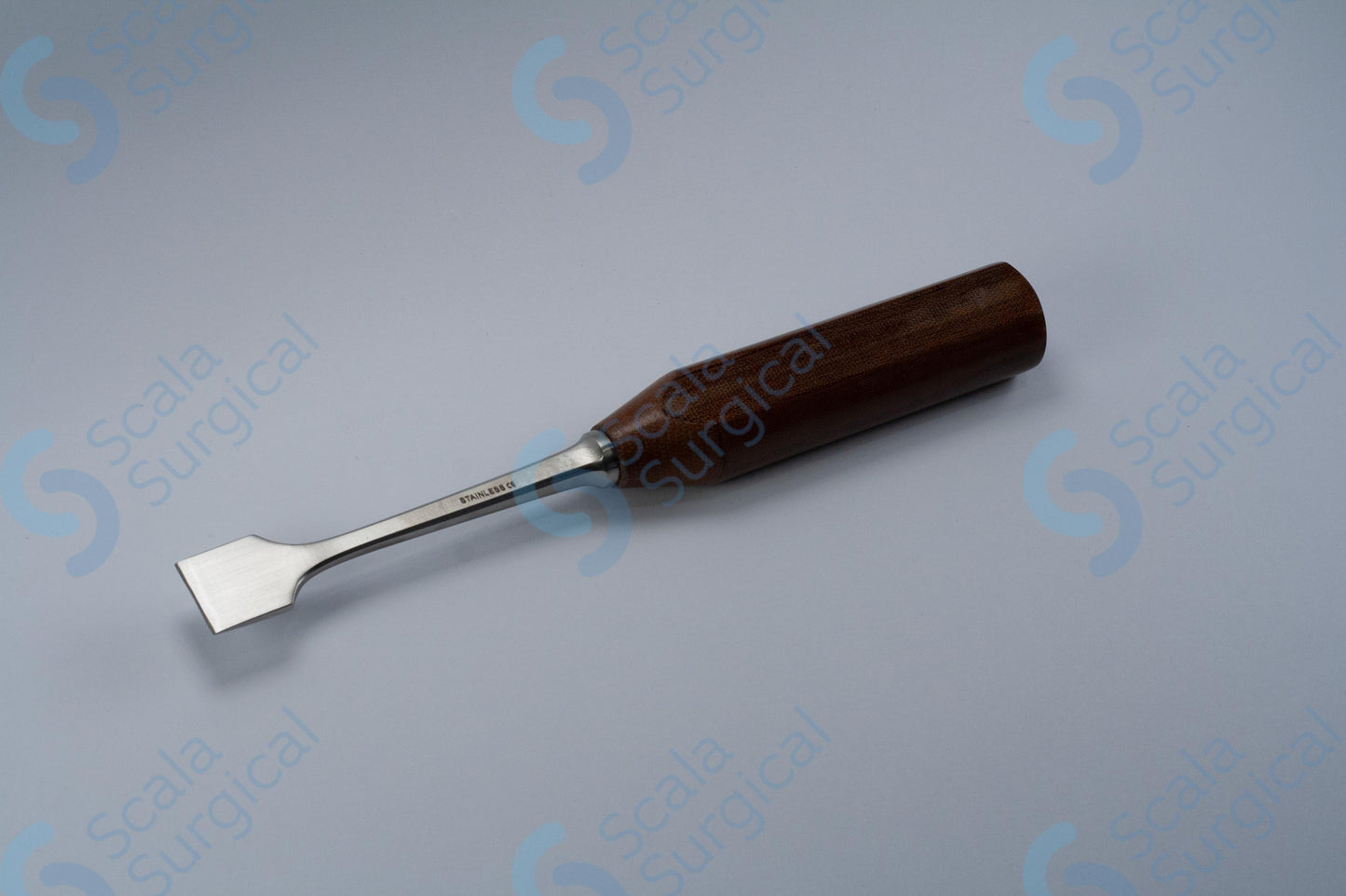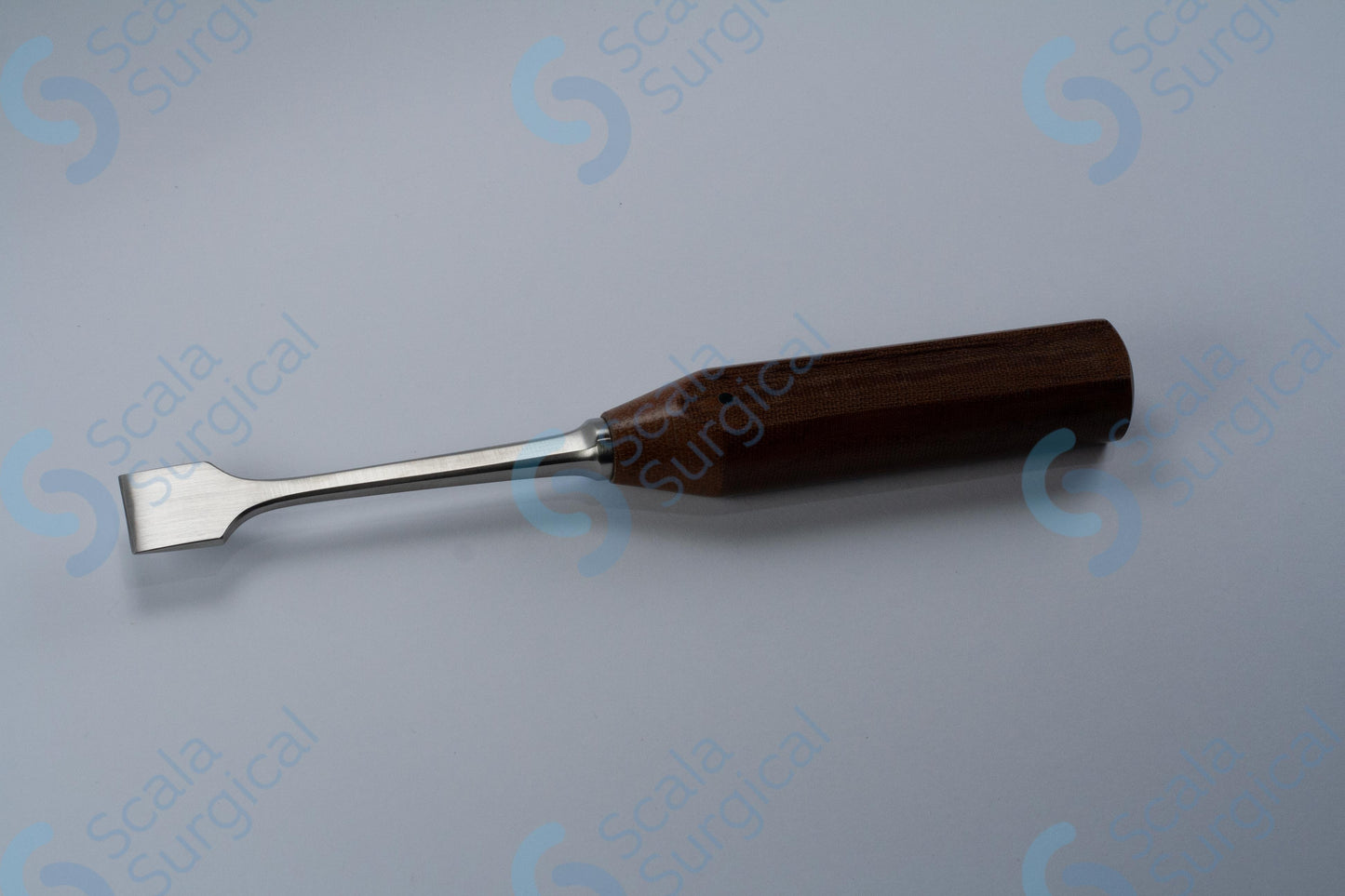 An osteotome is a surgical instrument used for cutting bone. This particular osteotome has a 20mm width and is made of Tufnol, a type of plastic that is durable and resistant to wear and tear. The handle is 222.25mm (or 8? inches) long. It is used to cut through bones and can be used in a variety of surgical procedures.