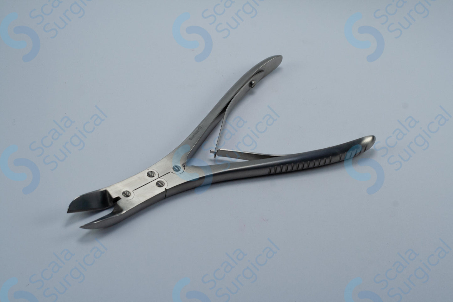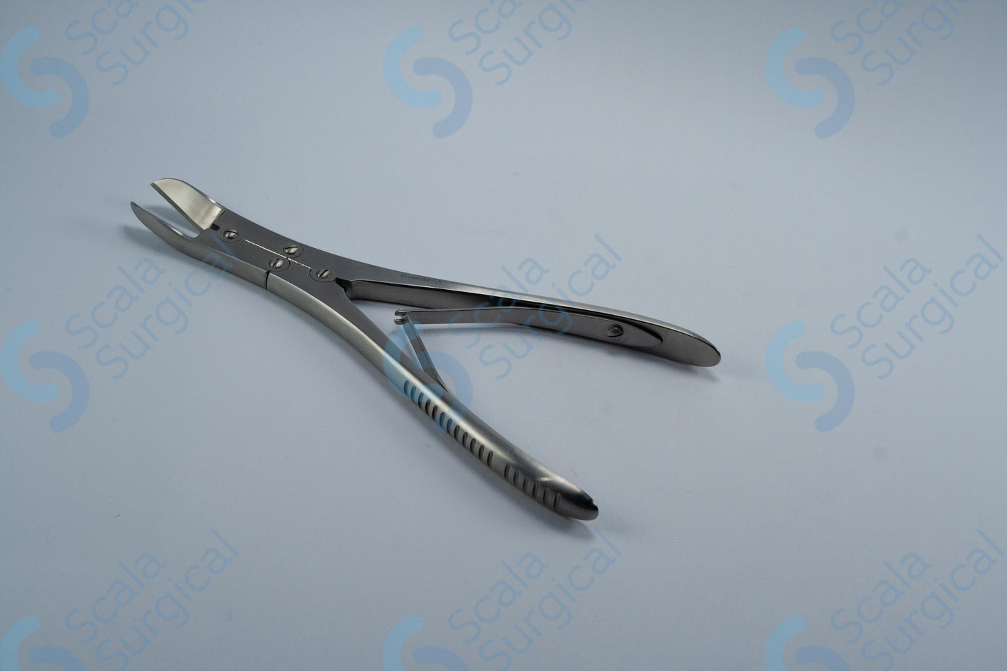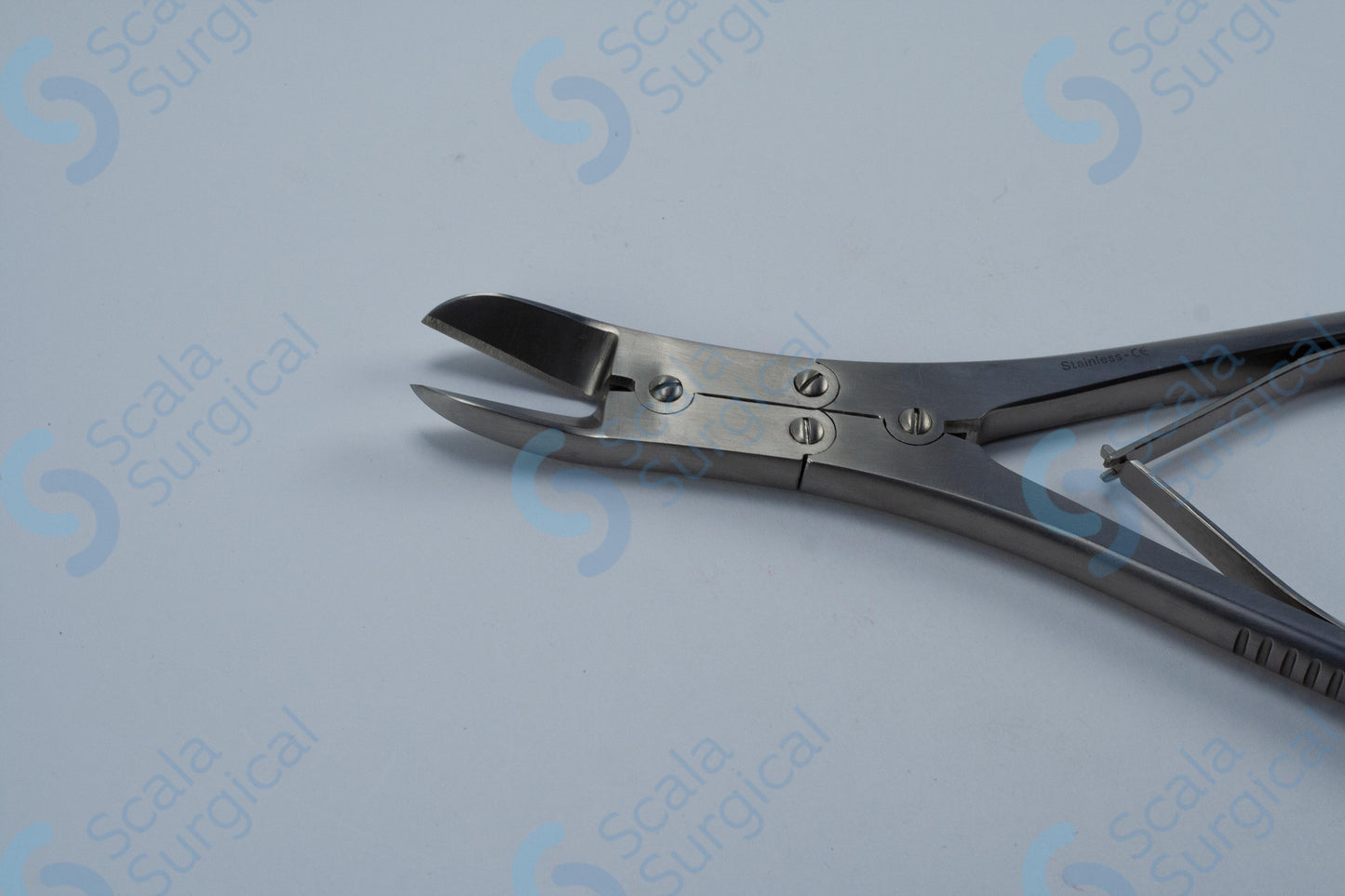 The Ruskin Liston Bone Cutting Forceps Compound Action Handle Curved (203.2mm) (8 inch) is a surgical instrument used to cut through bone. It is commonly used in orthopedic and trauma surgeries to cut through bone in order to gain access to the affected area.