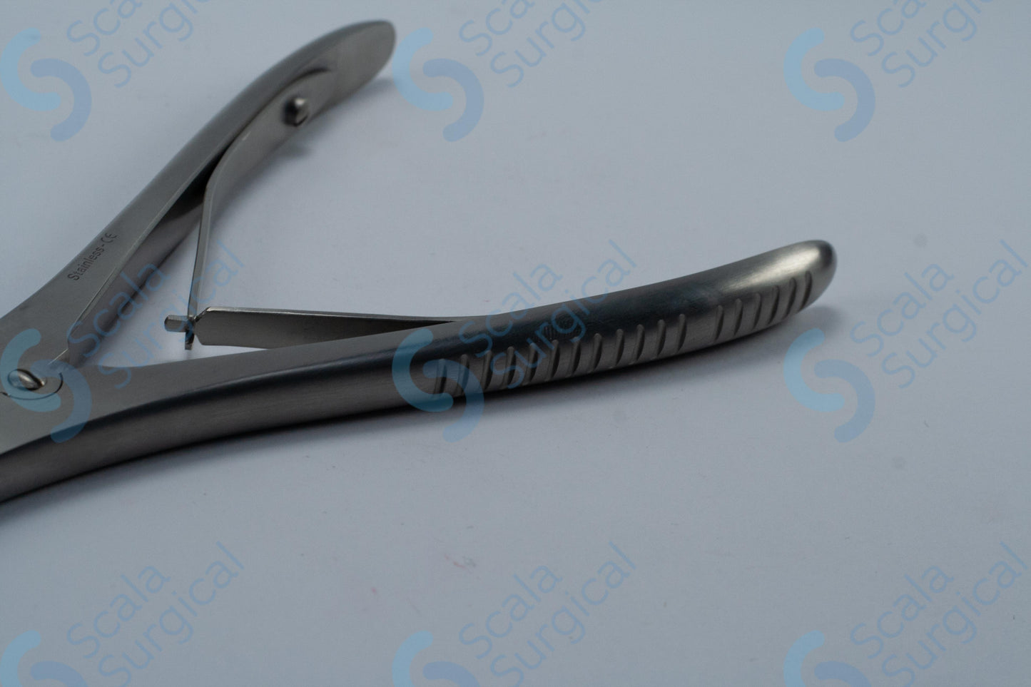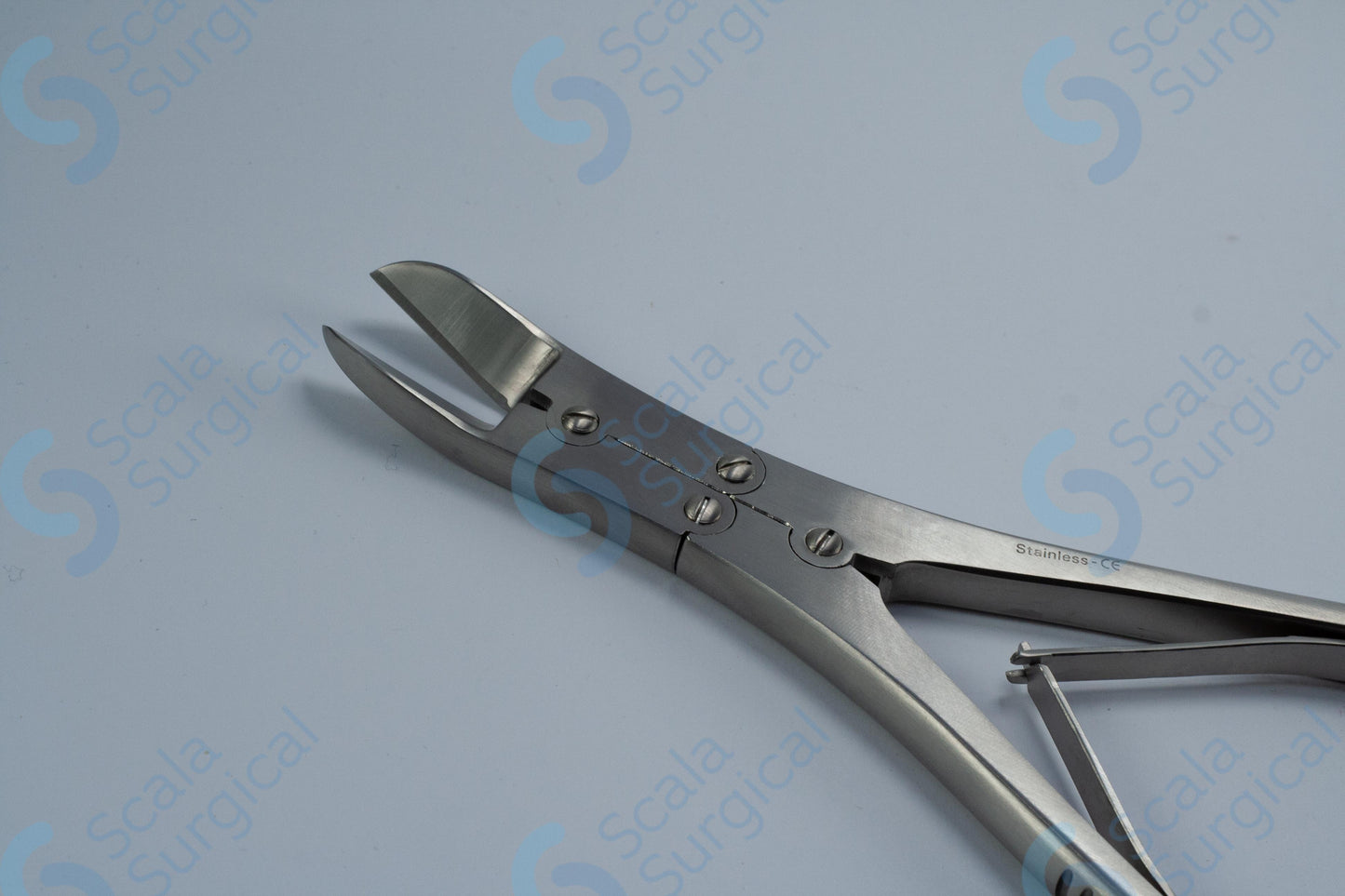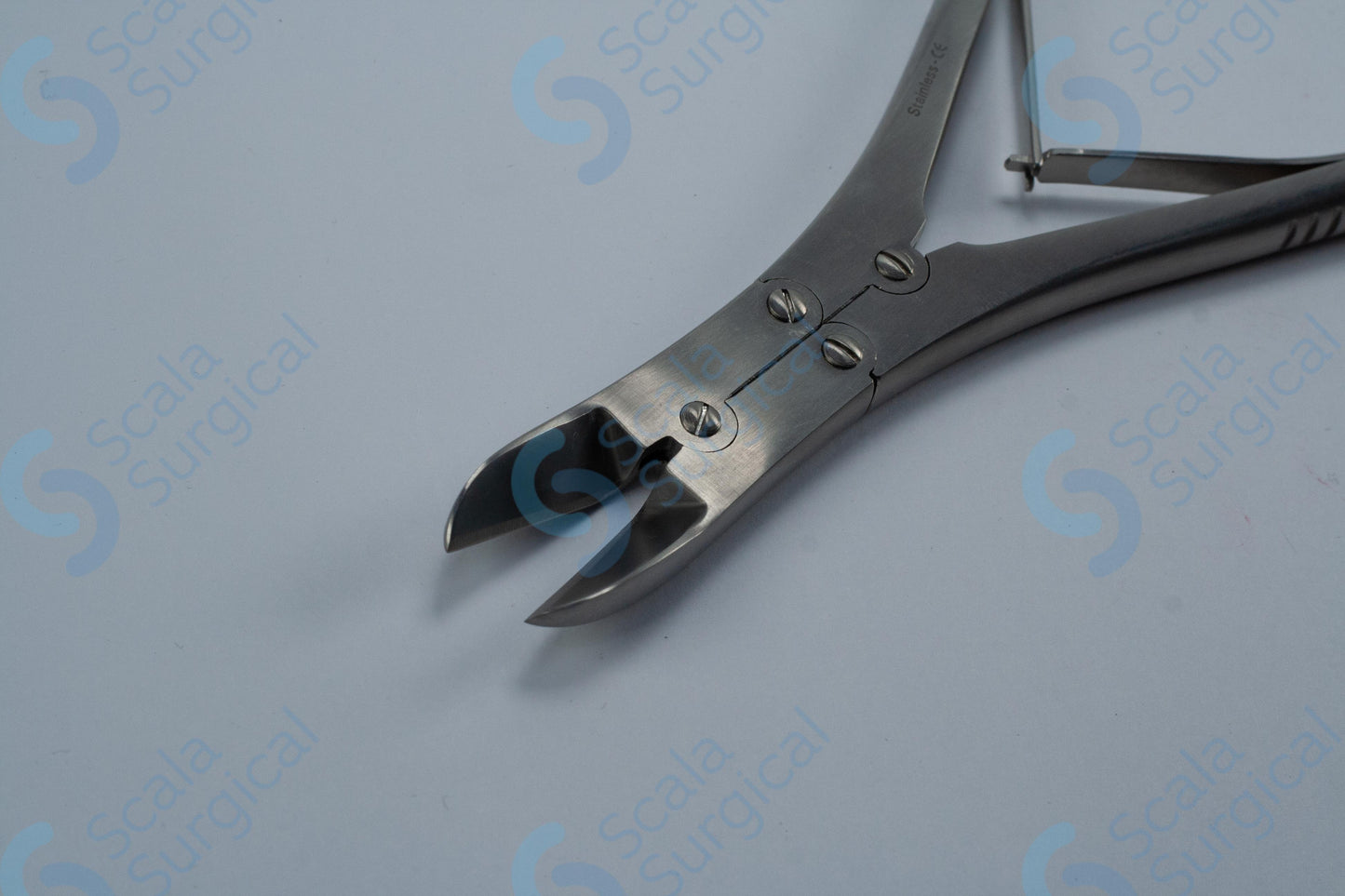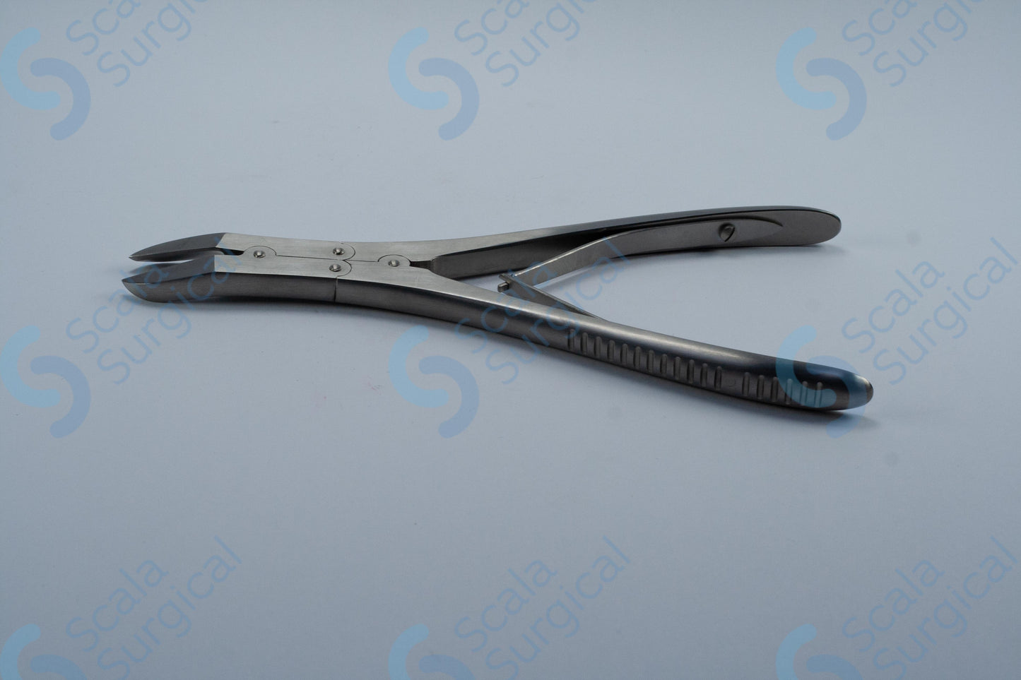 The Ruskin Liston Bone Cutting Forceps Compound Action Handle Curved (203.2mm) (8 inch) is a surgical instrument used to cut through bone. It is commonly used in orthopedic and trauma surgeries to cut through bone in order to gain access to the affected area.
