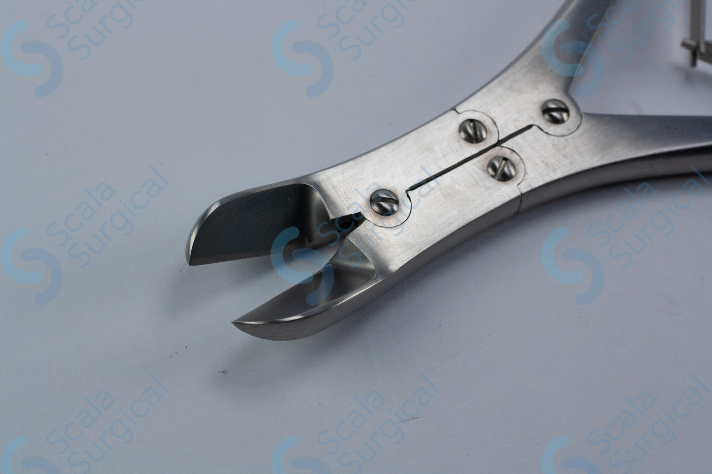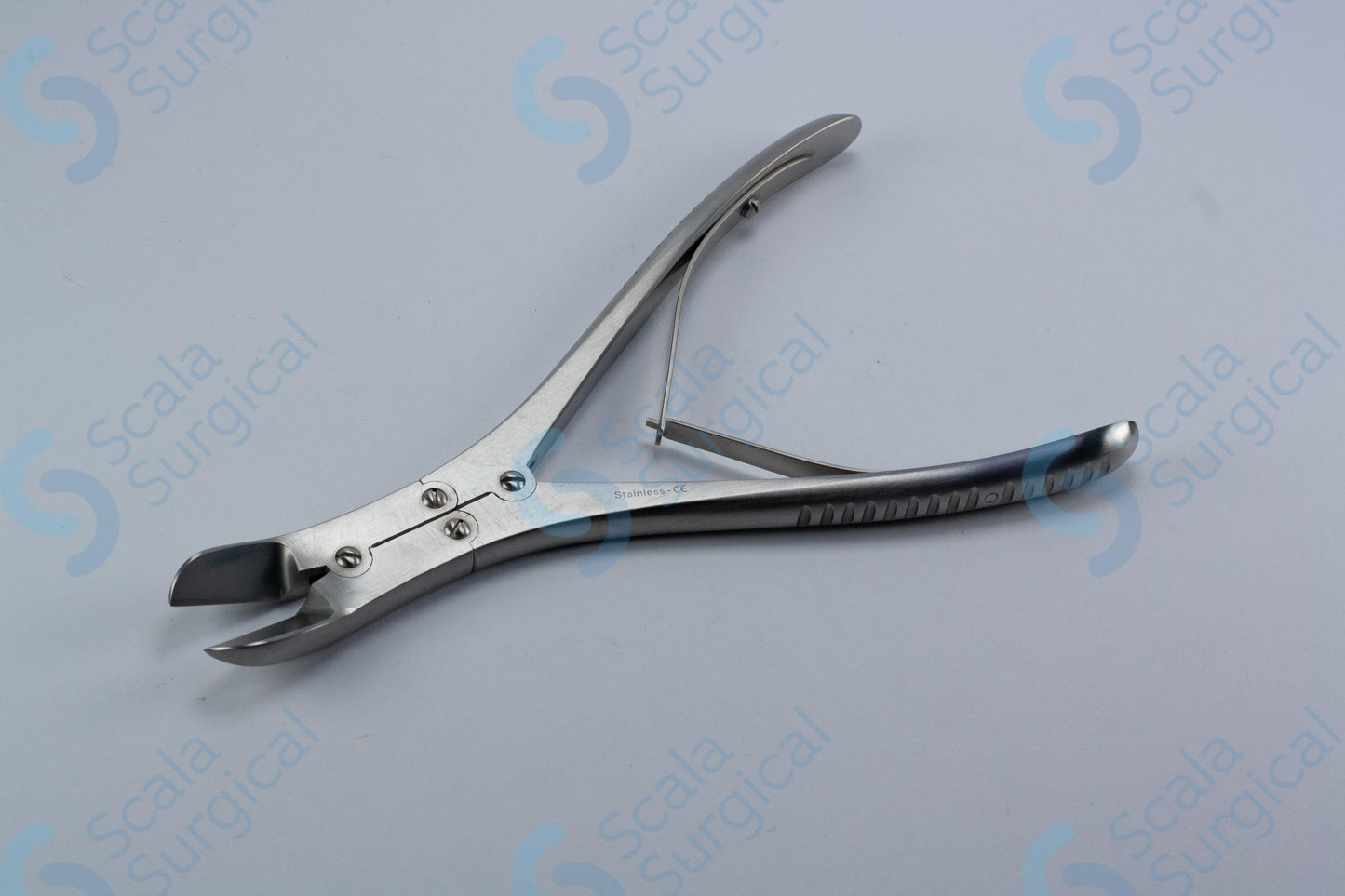 The Ruskin Liston Bone Cutting Forceps Compound Action Handle Curved (190mm) (7?inch) is a surgical instrument used to cut through bone during a surgical procedure. It is designed to provide a secure grip on the bone and to allow for precise cutting and manipulation.