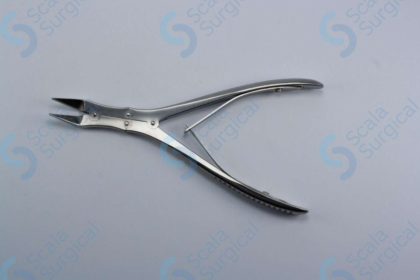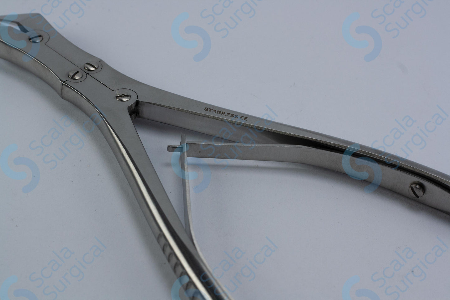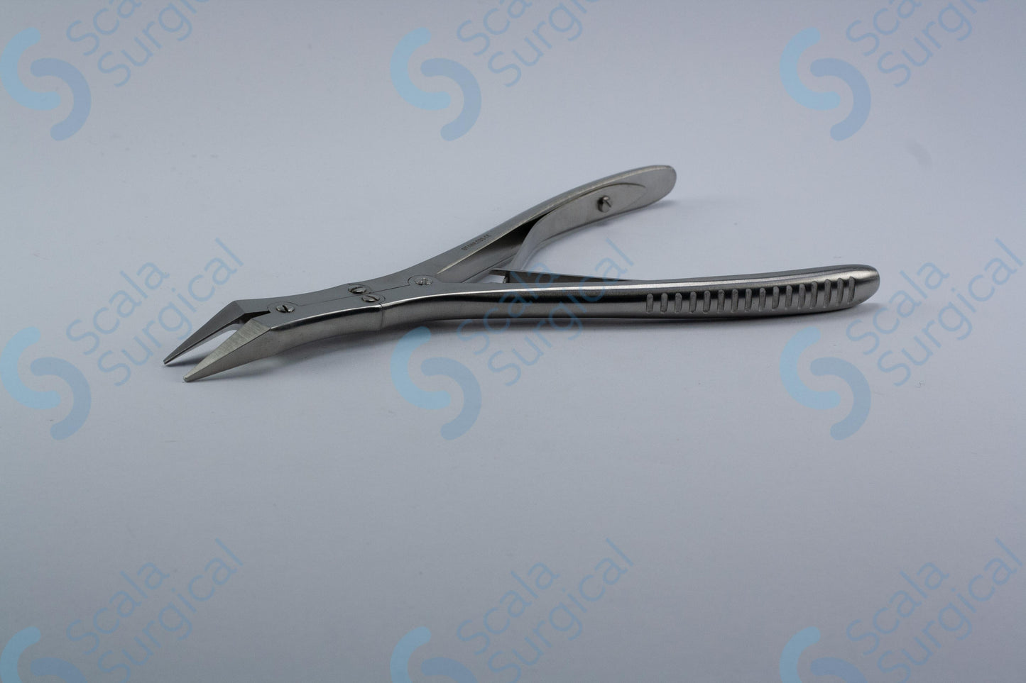 McIndoe Bone Cutting Forceps Compound Action Handle Angled on Flat (180mm) (7inch) is a surgical instrument used to cut through bone during surgical procedures. The angled handle and compound action design enables the user to cut through bone with precision and accuracy. The 180mm size (7 inch) provides a comfortable grip for the user.