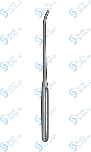 A Lane Bone Elevator with a solid handle and broad shaft with a slight curve is a surgical instrument used to lift and retract bone and tissue during surgery. It can be used to access deeper tissue and to aid in the removal of bone fragments during orthopedic procedures.