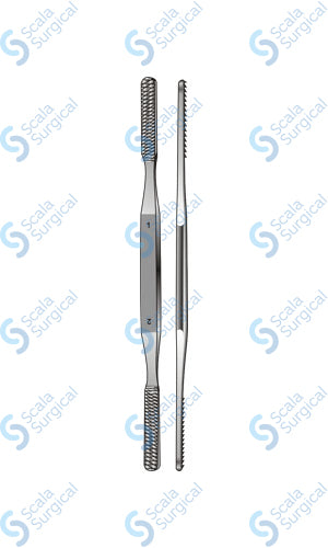 The Fomon Bone File Double Ended Tungsten Carbide File is a surgical instrument used to shape and smooth bone during orthopedic surgery. It has 52 and 64 teeth on each end, and is 203.2mm (8 inches) long. The file is used to contour and smooth bone surfaces, and is commonly used in joint replacement surgeries.