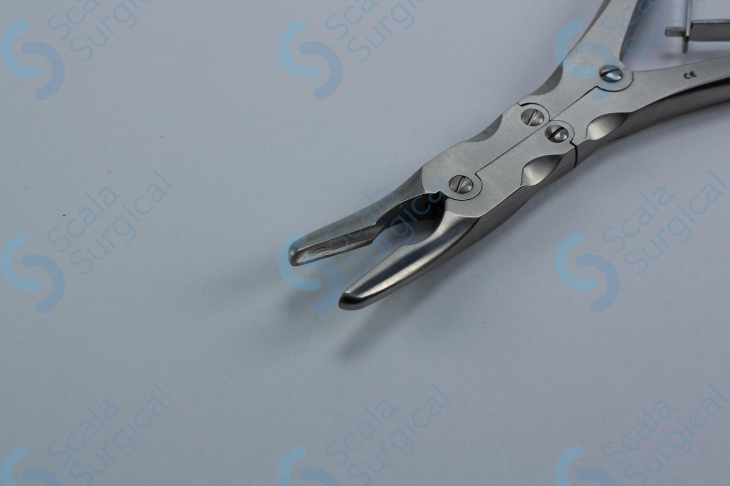 This item is a surgical instrument used to cut and remove bone during a surgical procedure. It has a compound action handle and curved blades that are 196.85mm (7? inch) long. It is commonly used for osteotomies, dissection, and removal of bone fragments.