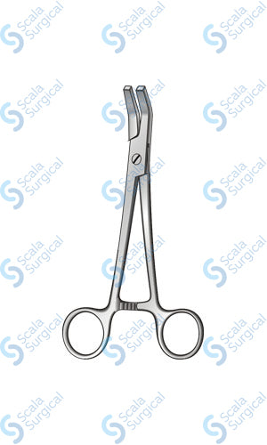 This tubing clamp is used to securely close off a section of tubing in a surgical setting. The angled flat screw joint and plain jaws allow for a secure and tight closure. The 152.4mm size is used to fit larger diameter tubing.