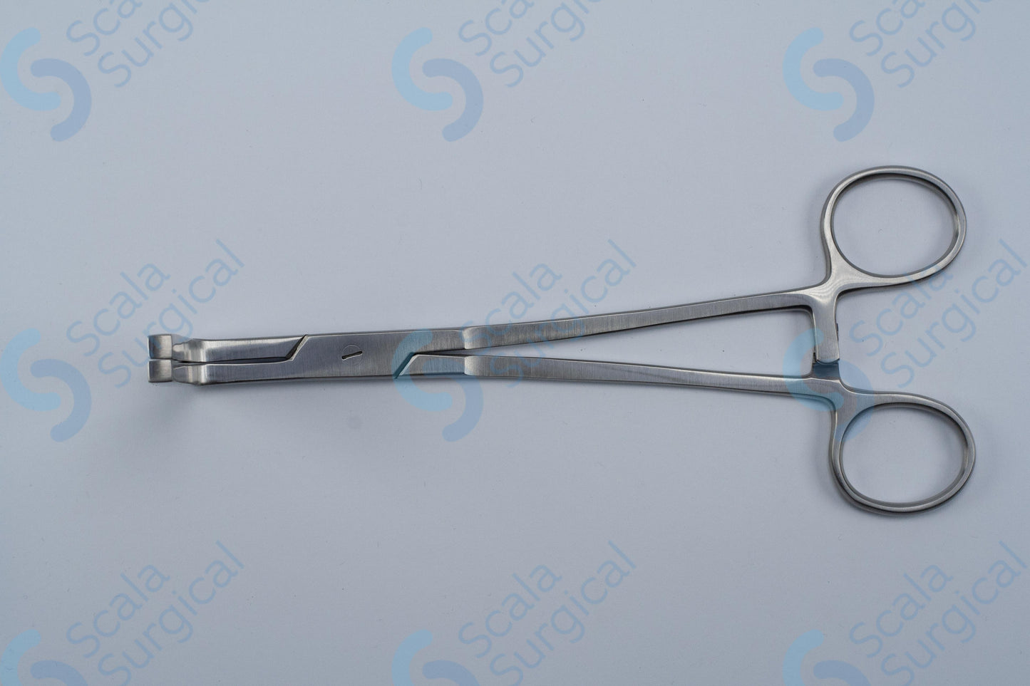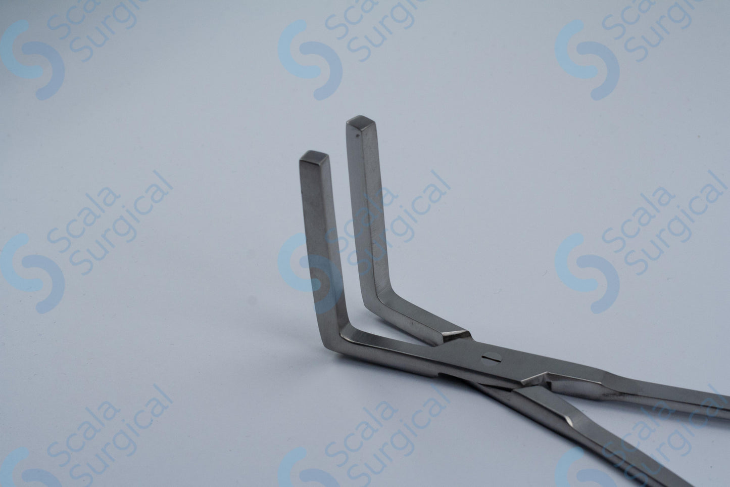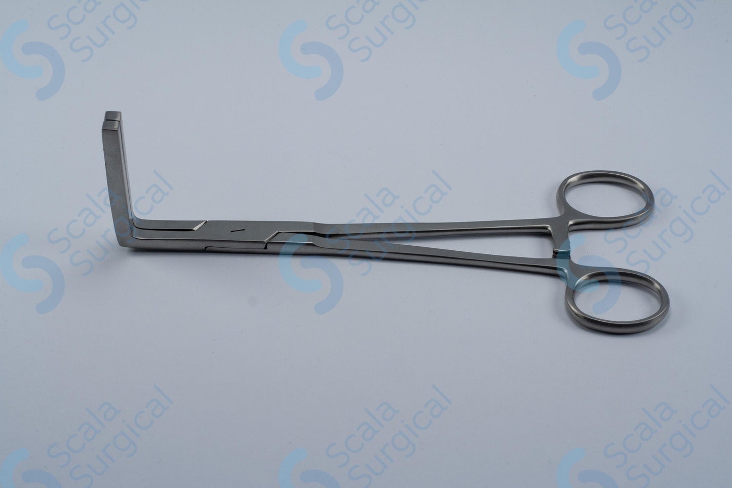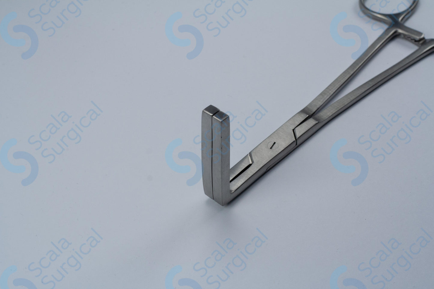 This tubing clamp is used to secure and control the flow of fluid or gas in a surgical setting. The angled flat screw joint allows for easy adjustment of the clamp while the plain jaws provide a secure fit. The 177.8mm size is designed to fit a variety of tubing sizes.