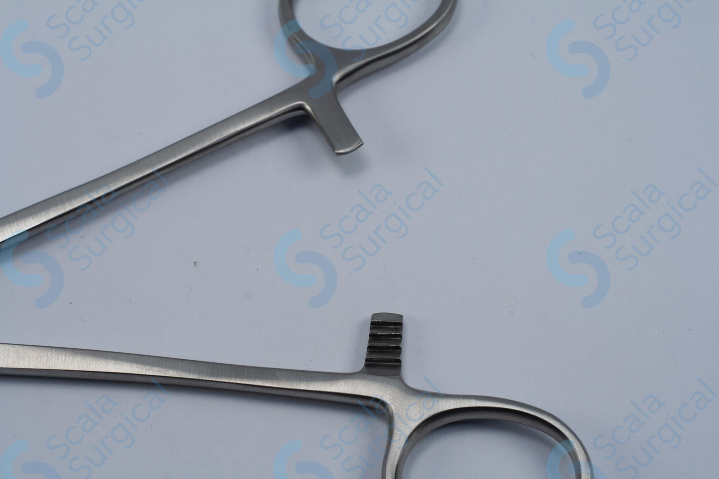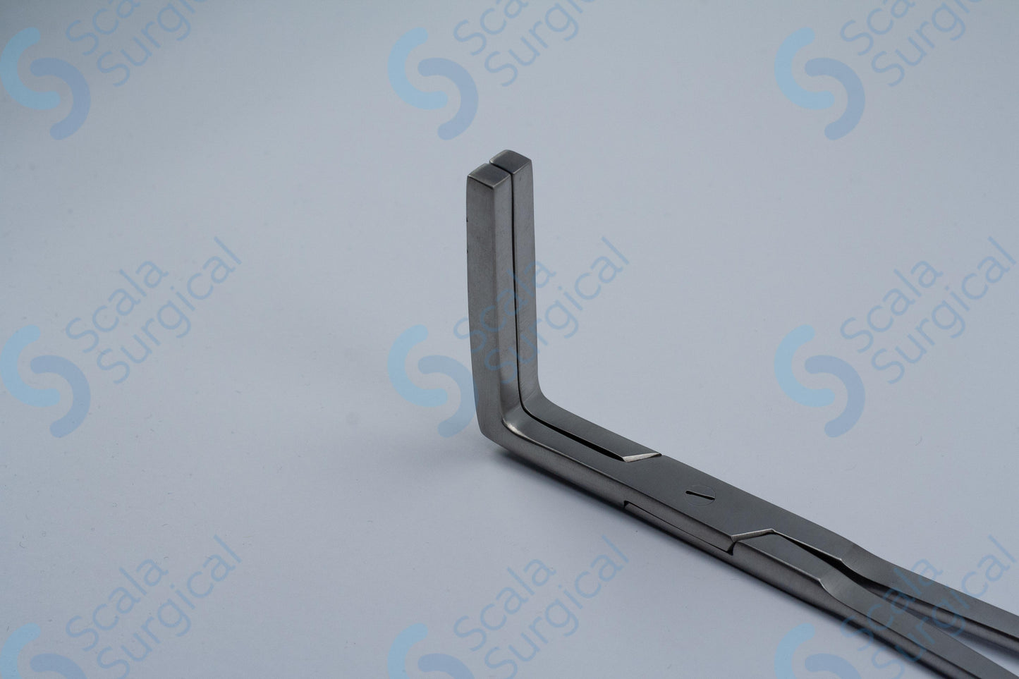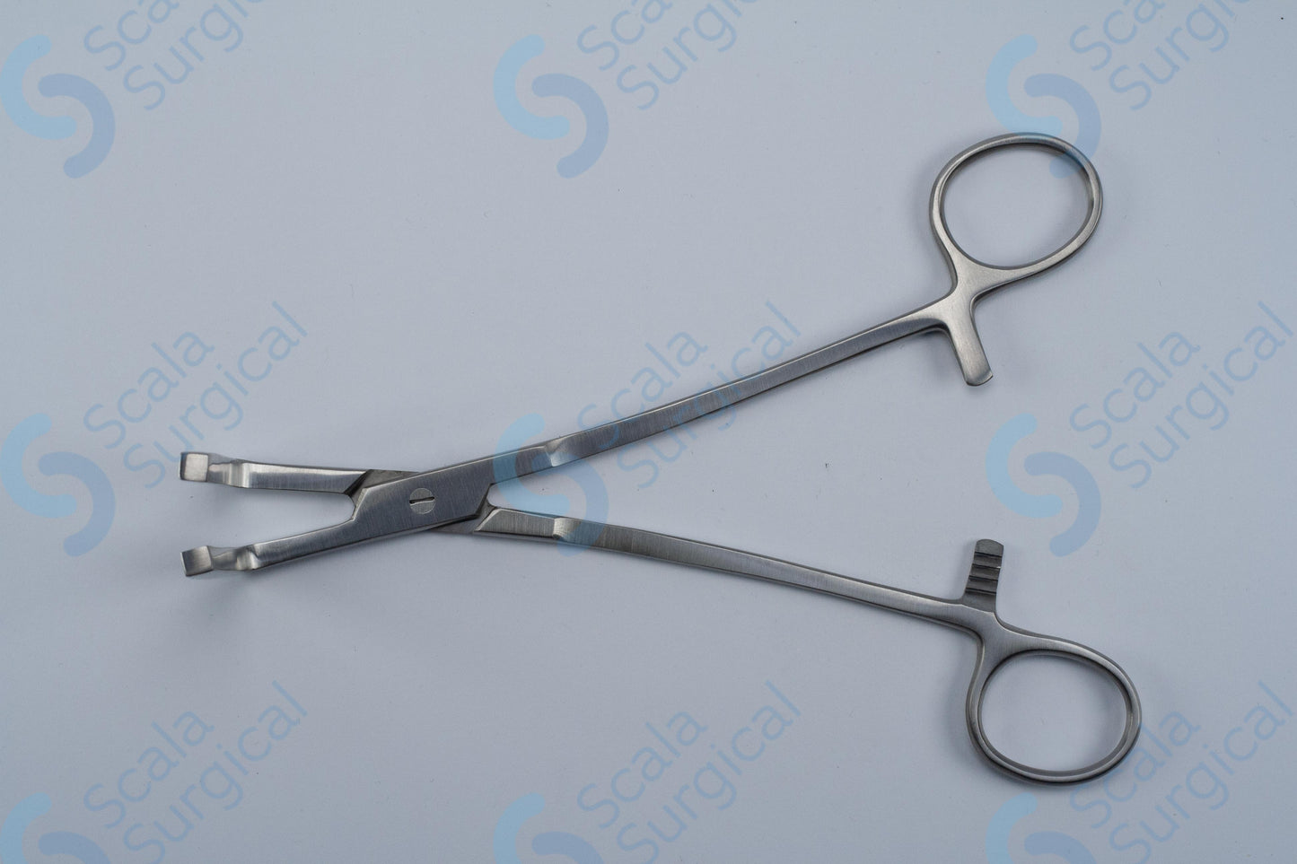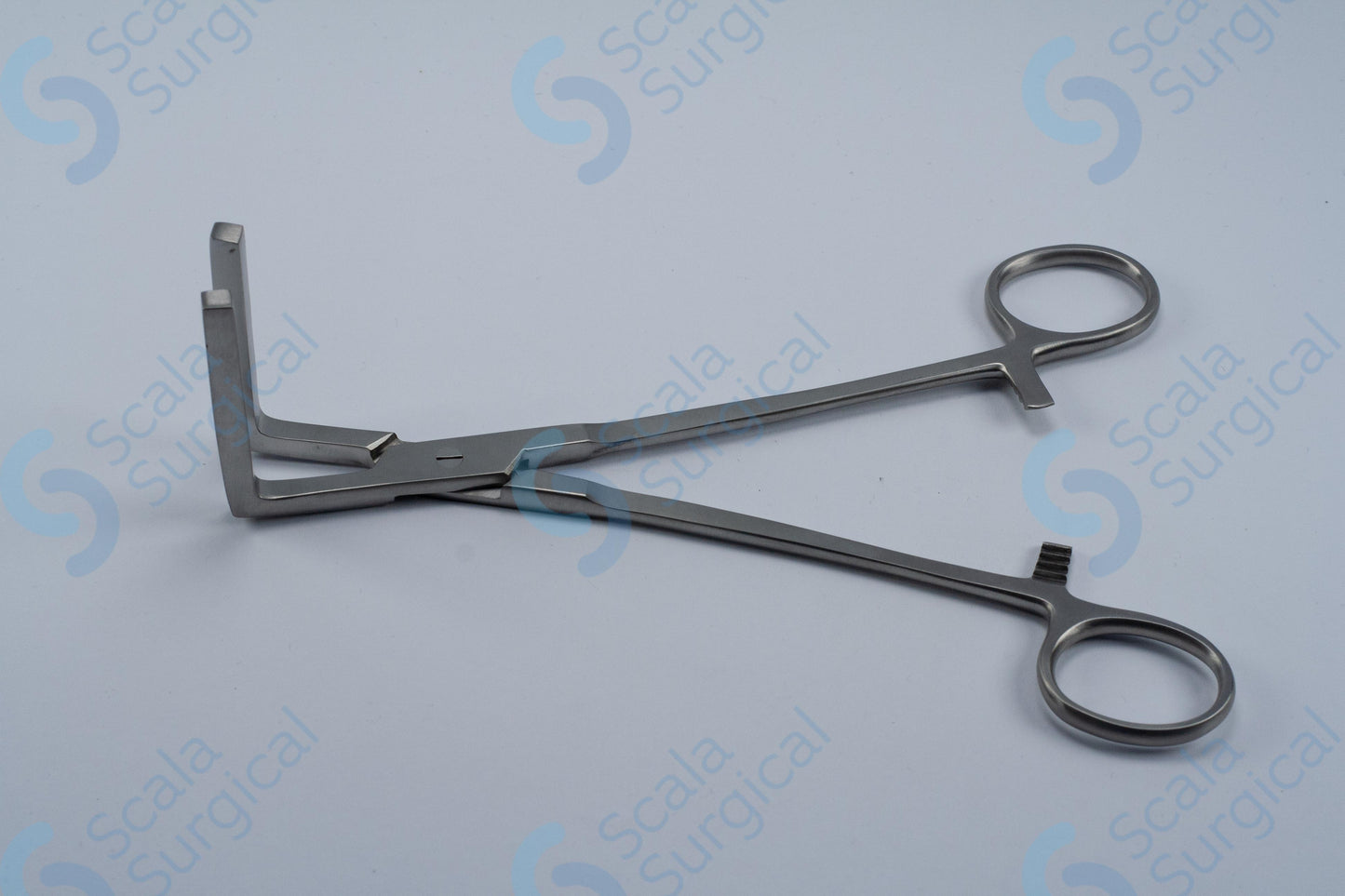 This tubing clamp is used to secure and control the flow of fluid or gas in a surgical setting. The angled flat screw joint allows for easy adjustment of the clamp while the plain jaws provide a secure fit. The 177.8mm size is designed to fit a variety of tubing sizes.