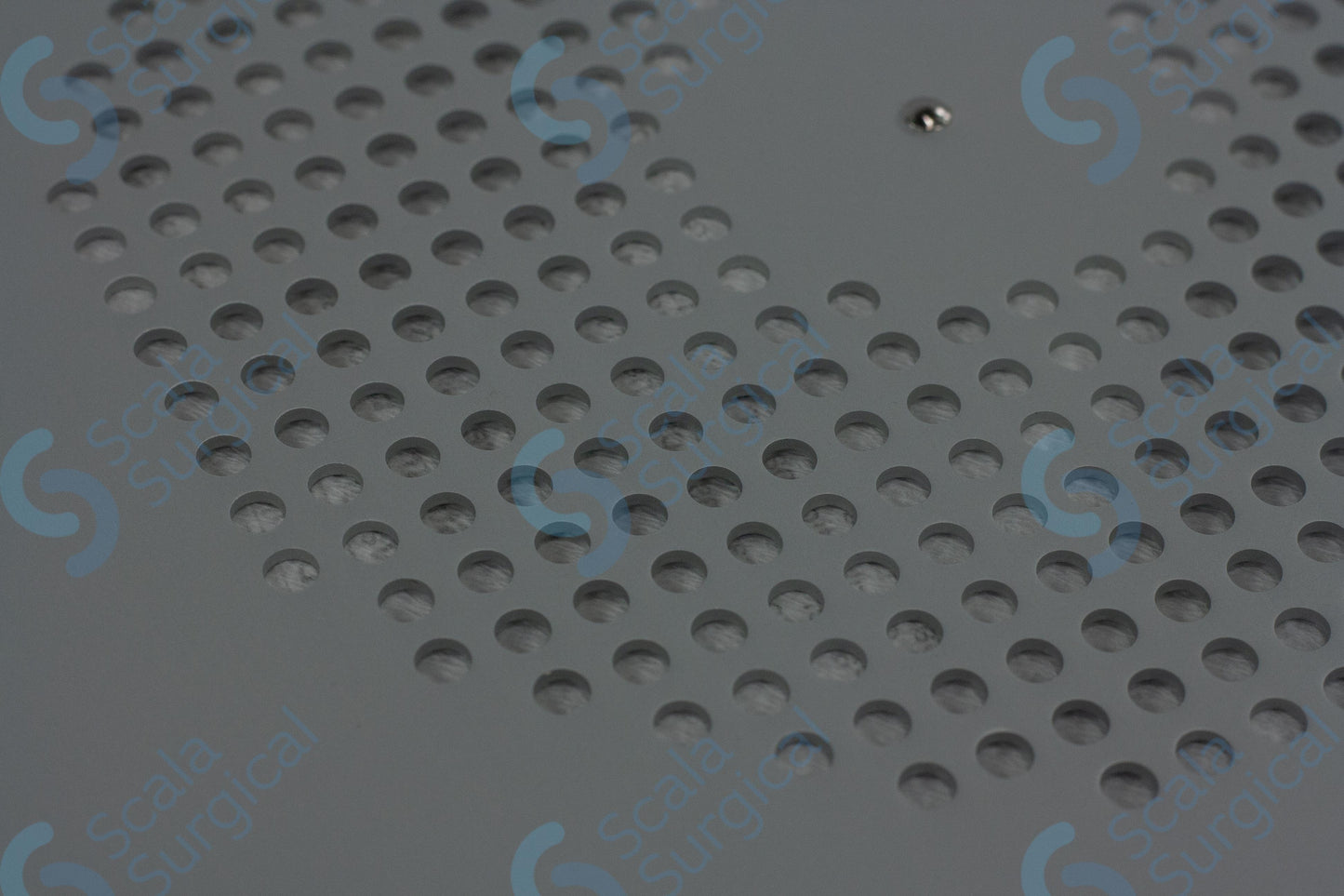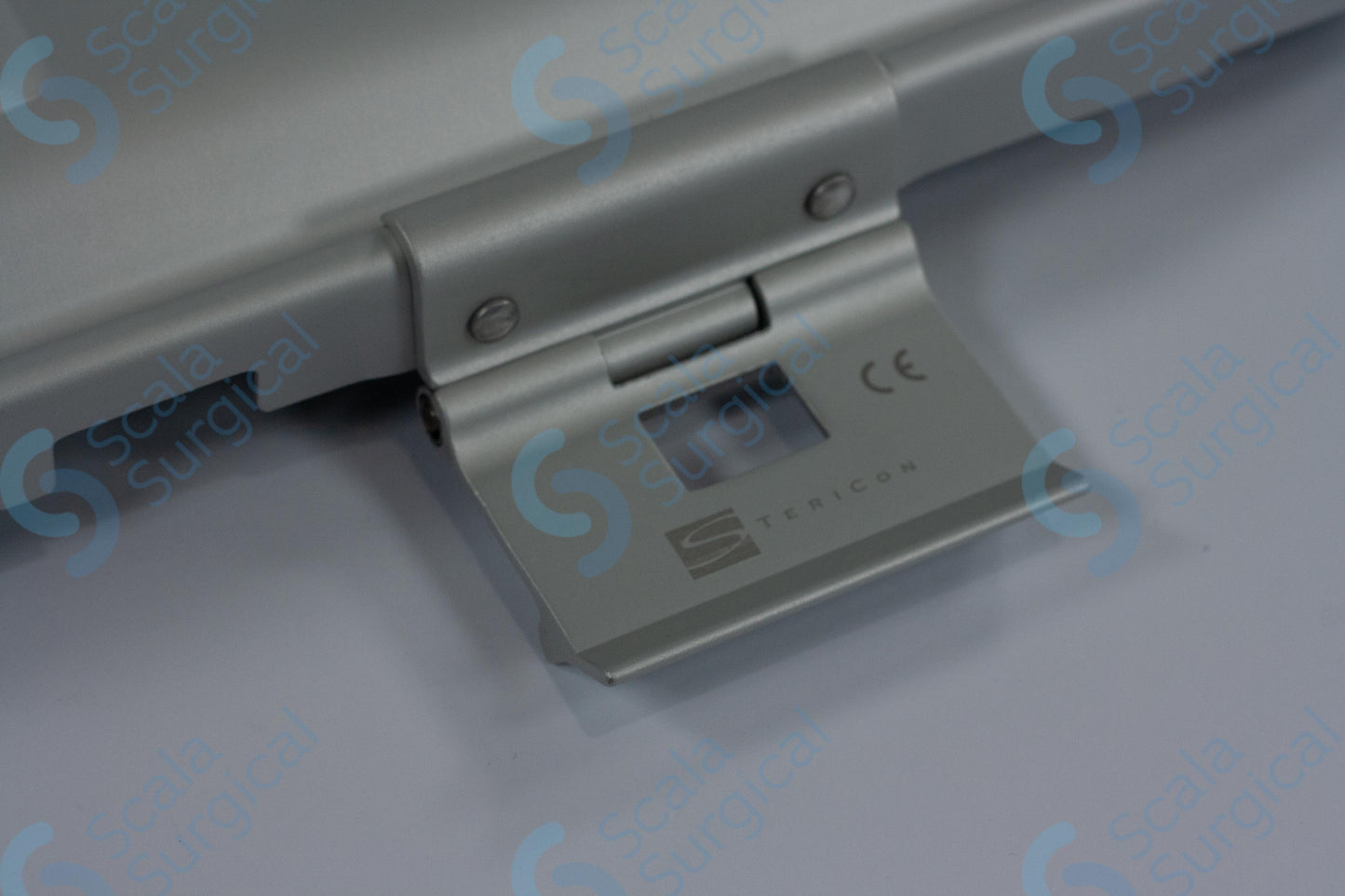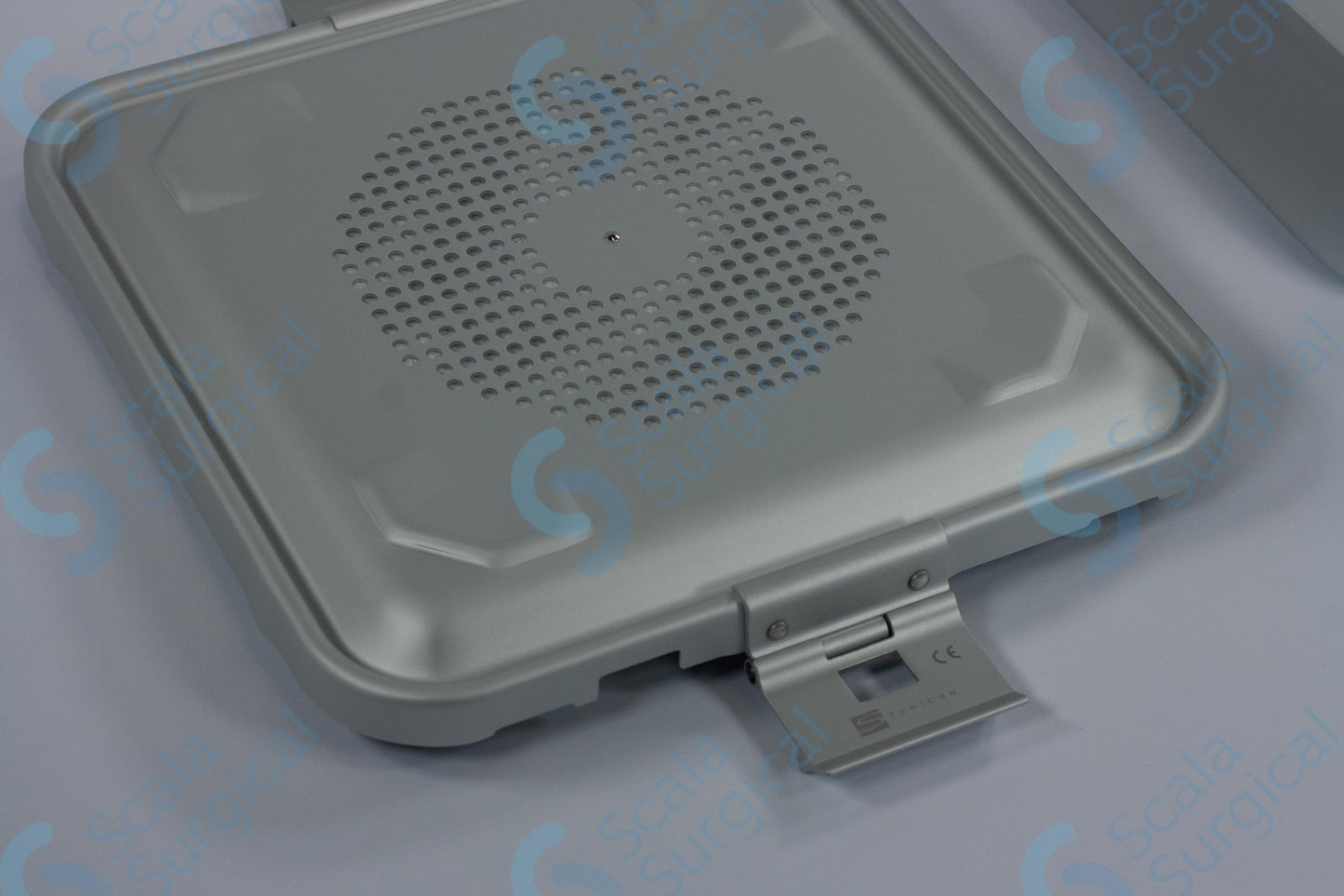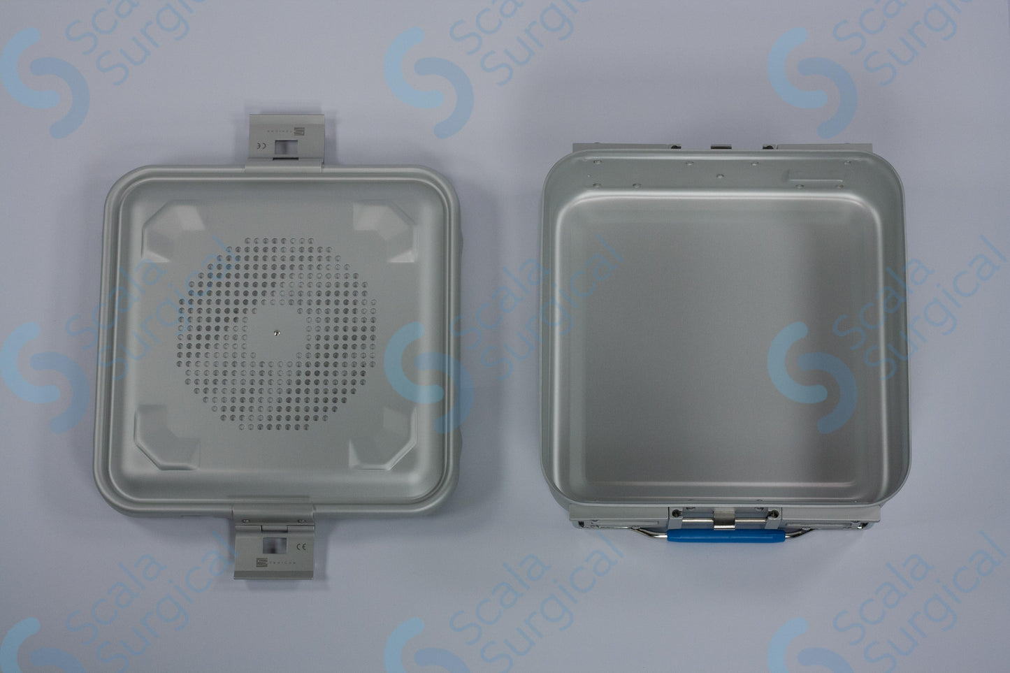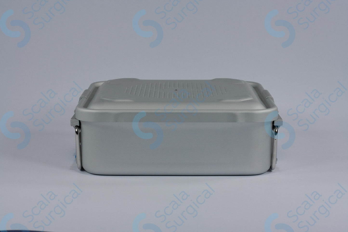 This container is used to store and transport medical instruments and supplies in the surgical field. It is typically used for transporting items from the operating room to the recovery room. The silver lid and solid base provide a secure seal and protection for the items inside. The size of the container allows for easy transport and storage.