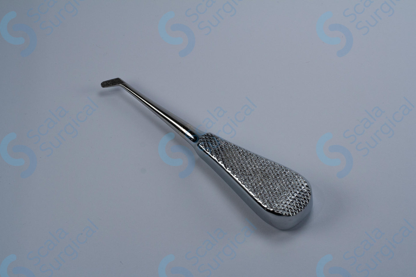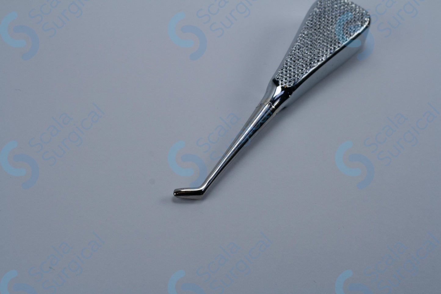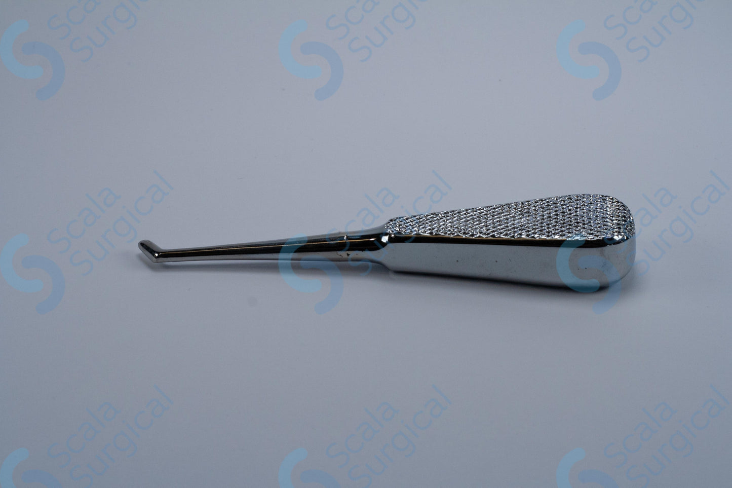 This item is a curved hospital elevator designed to be used in the surgical field. It is 139.7mm (5? inch) in size and is used to move patients, equipment, and supplies between floors of the hospital.