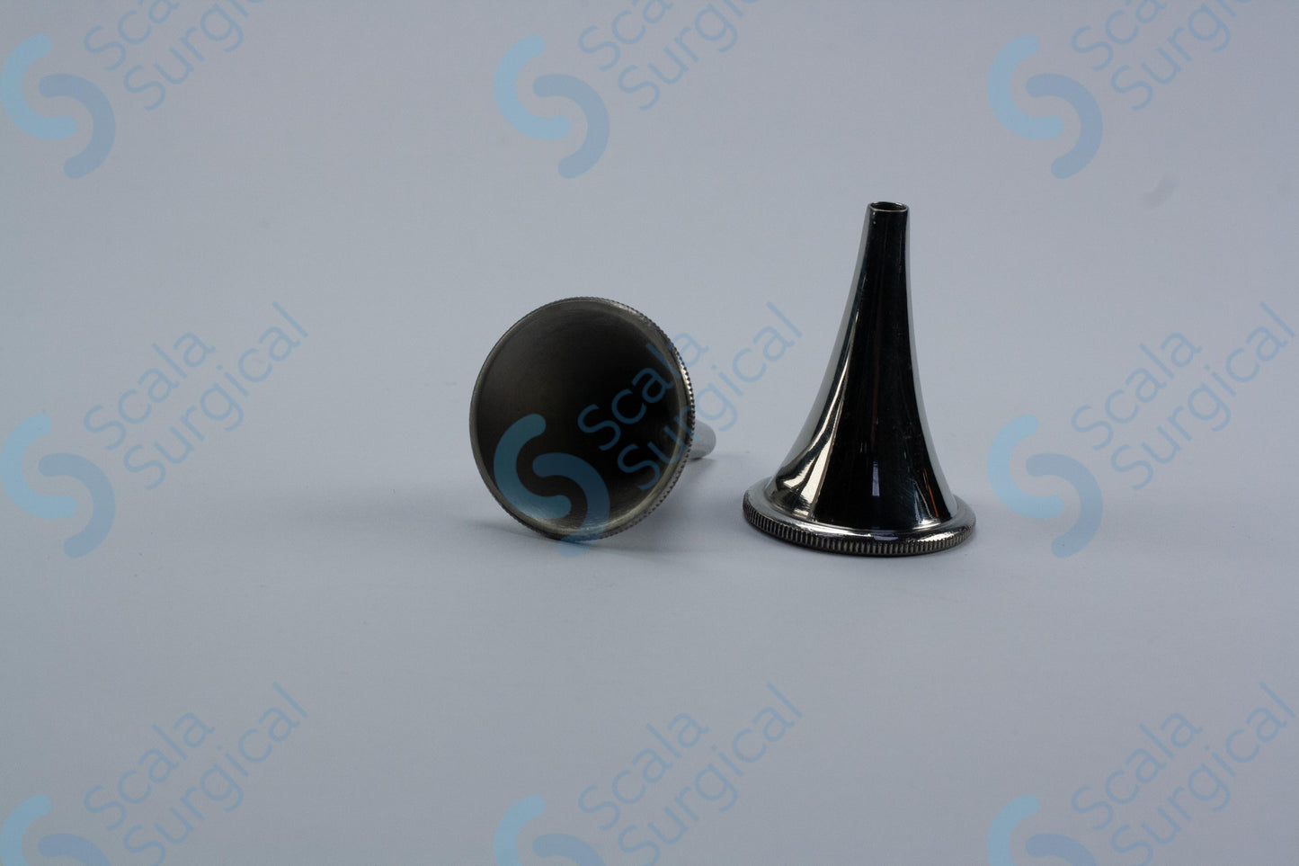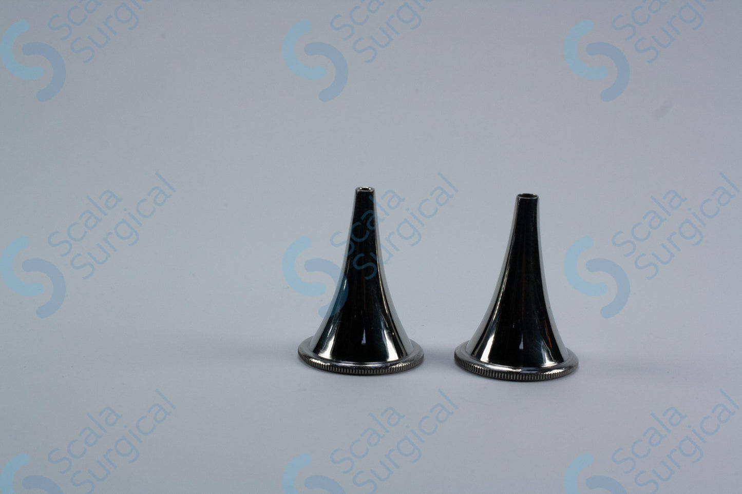 The Rosen Aural Speculum Oval End Black Plated is a tool used by surgeons to examine the ear canal. It is inserted into the ear canal to open the canal for inspection. The bore diameter and base diameter indicated in the description refer to the size of the speculum.