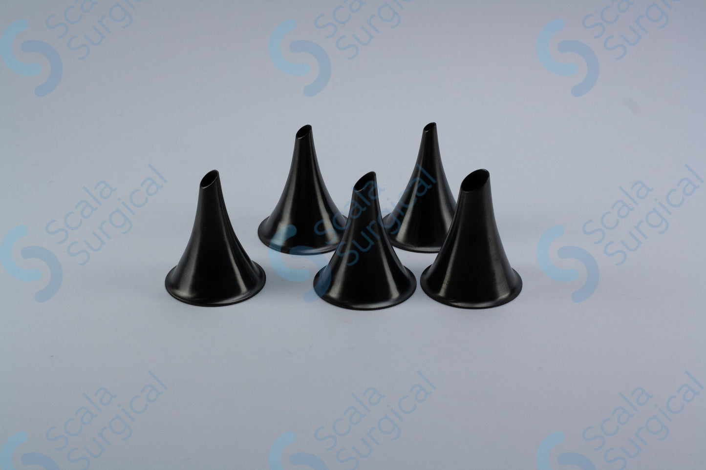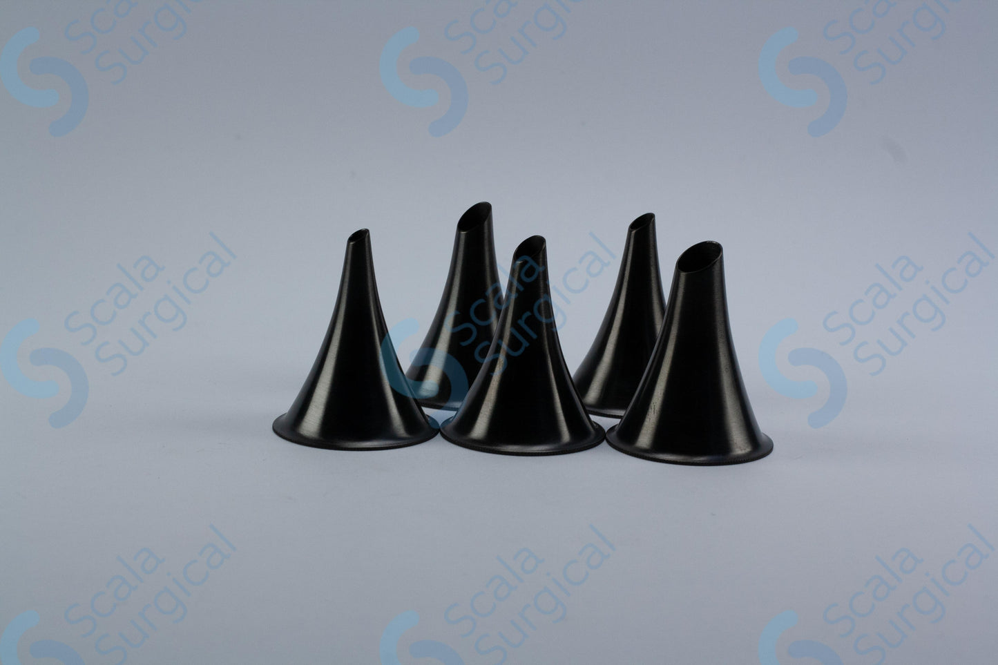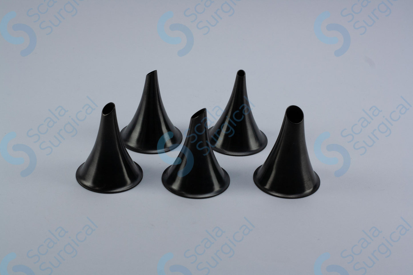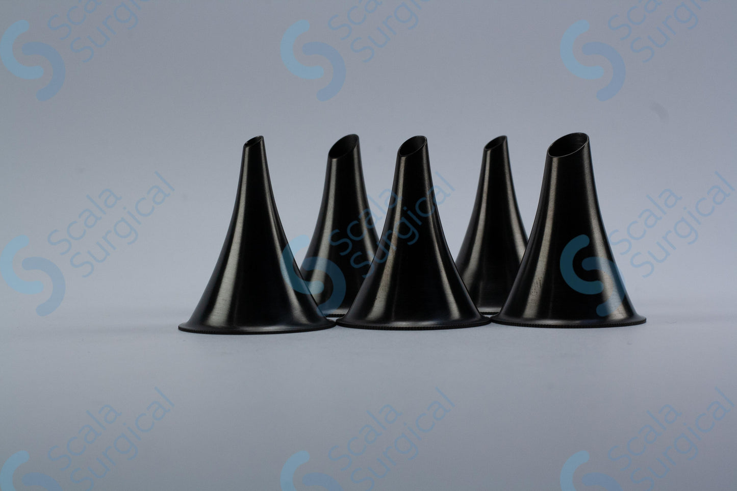 A shea aural speculum is a medical device used by ear, nose, and throat (ENT) specialists for examining the ear canal. The device is inserted into the ear canal and used to hold the ear open for better access and visualization. The black plated set of 5 includes five different sizes of speculums.