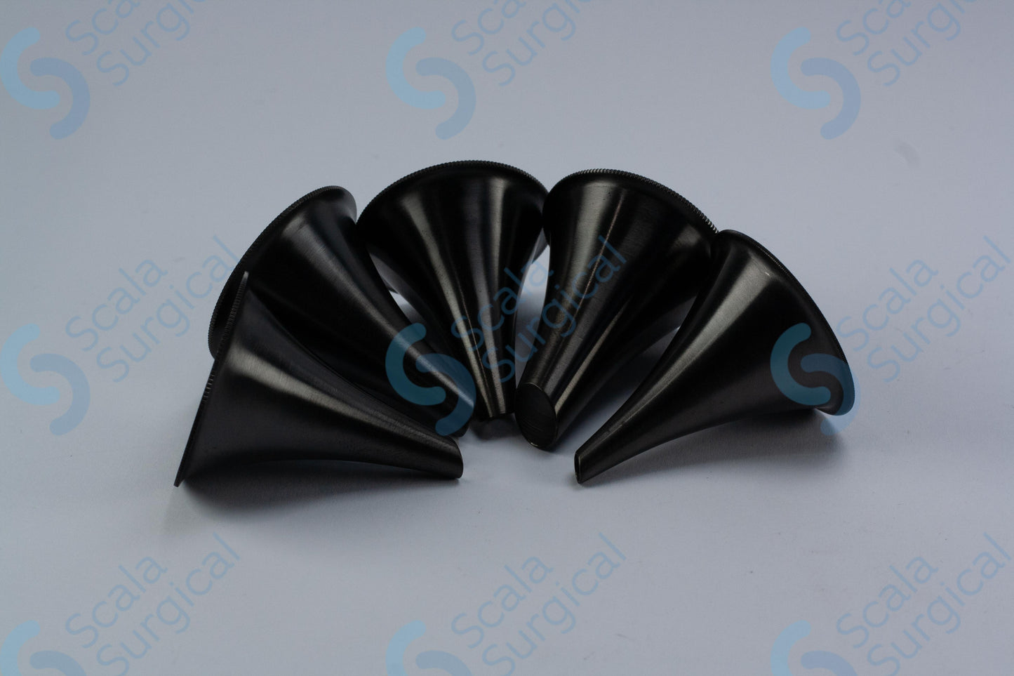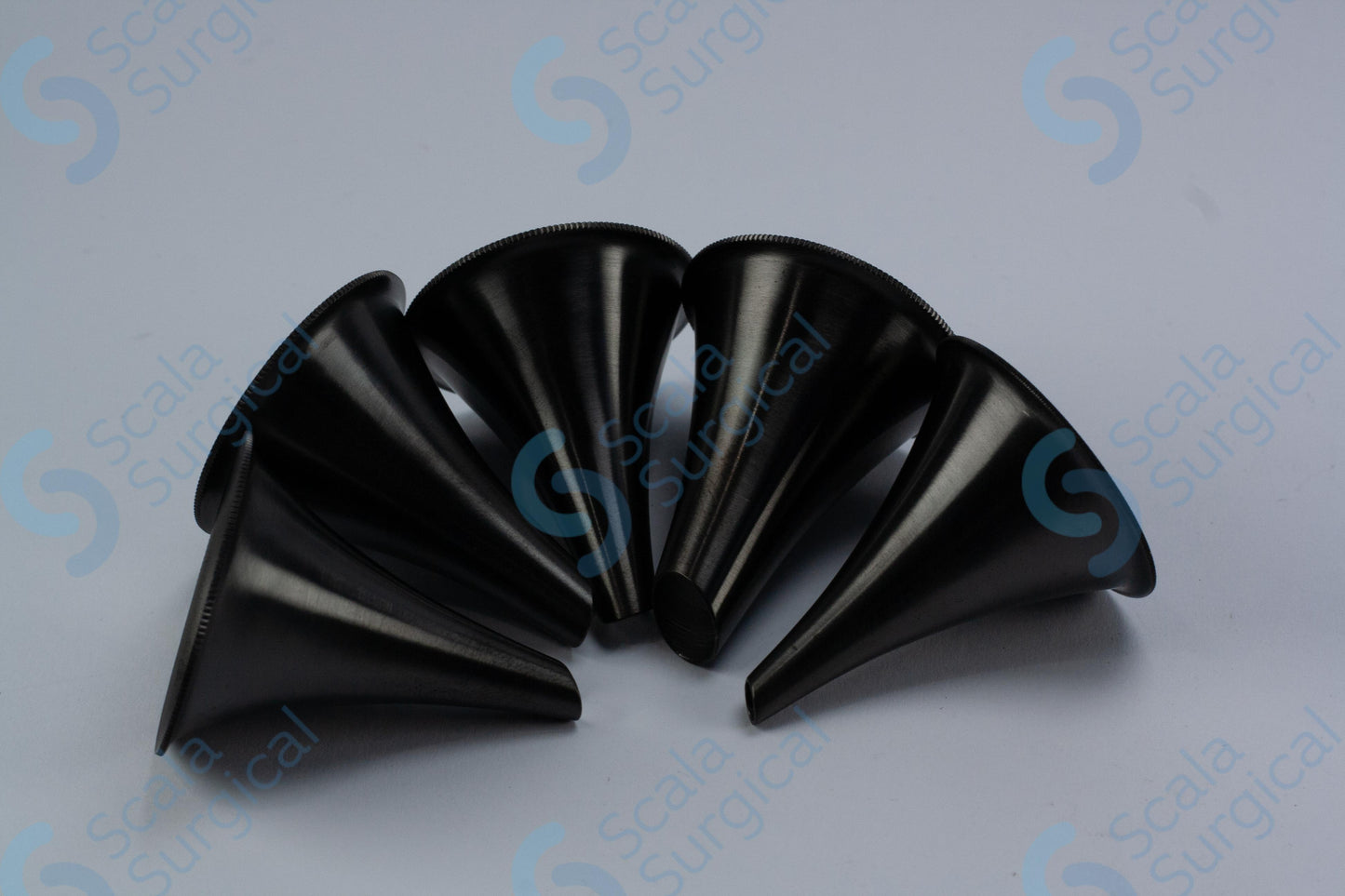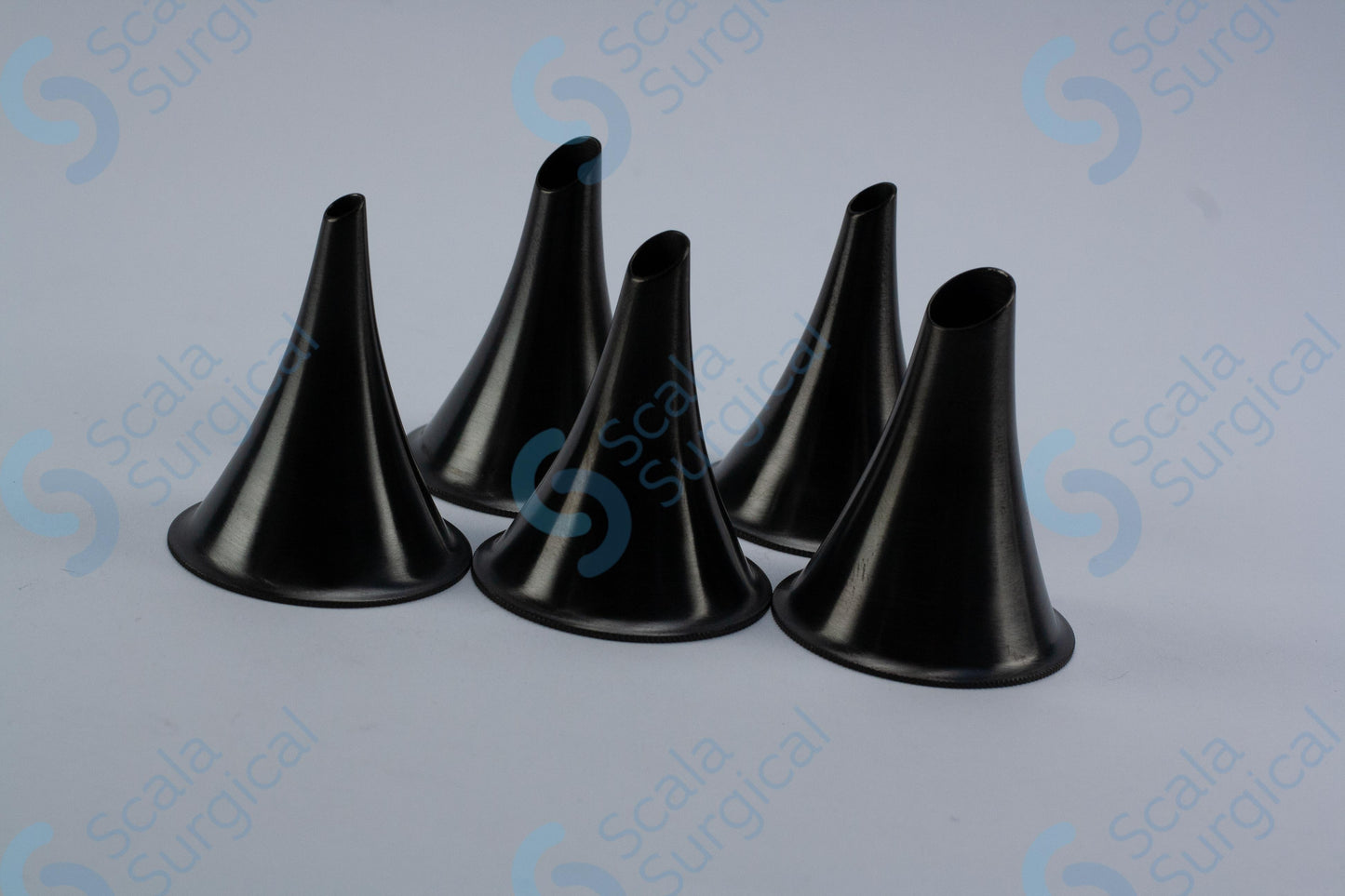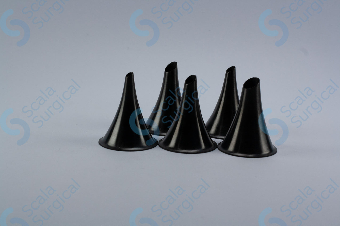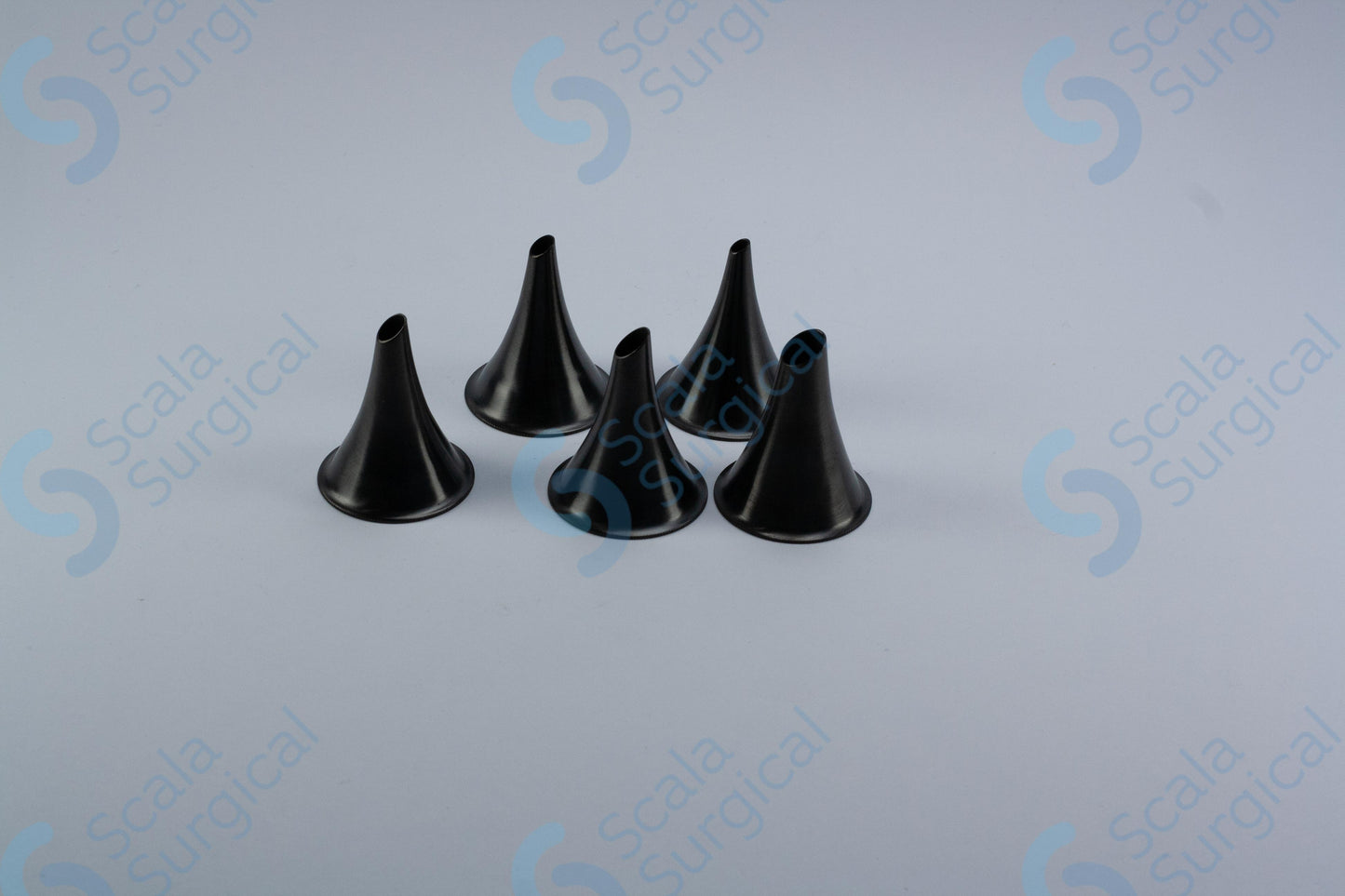 A shea aural speculum is a medical device used by ear, nose, and throat (ENT) specialists for examining the ear canal. The device is inserted into the ear canal and used to hold the ear open for better access and visualization. The black plated set of 5 includes five different sizes of speculums.