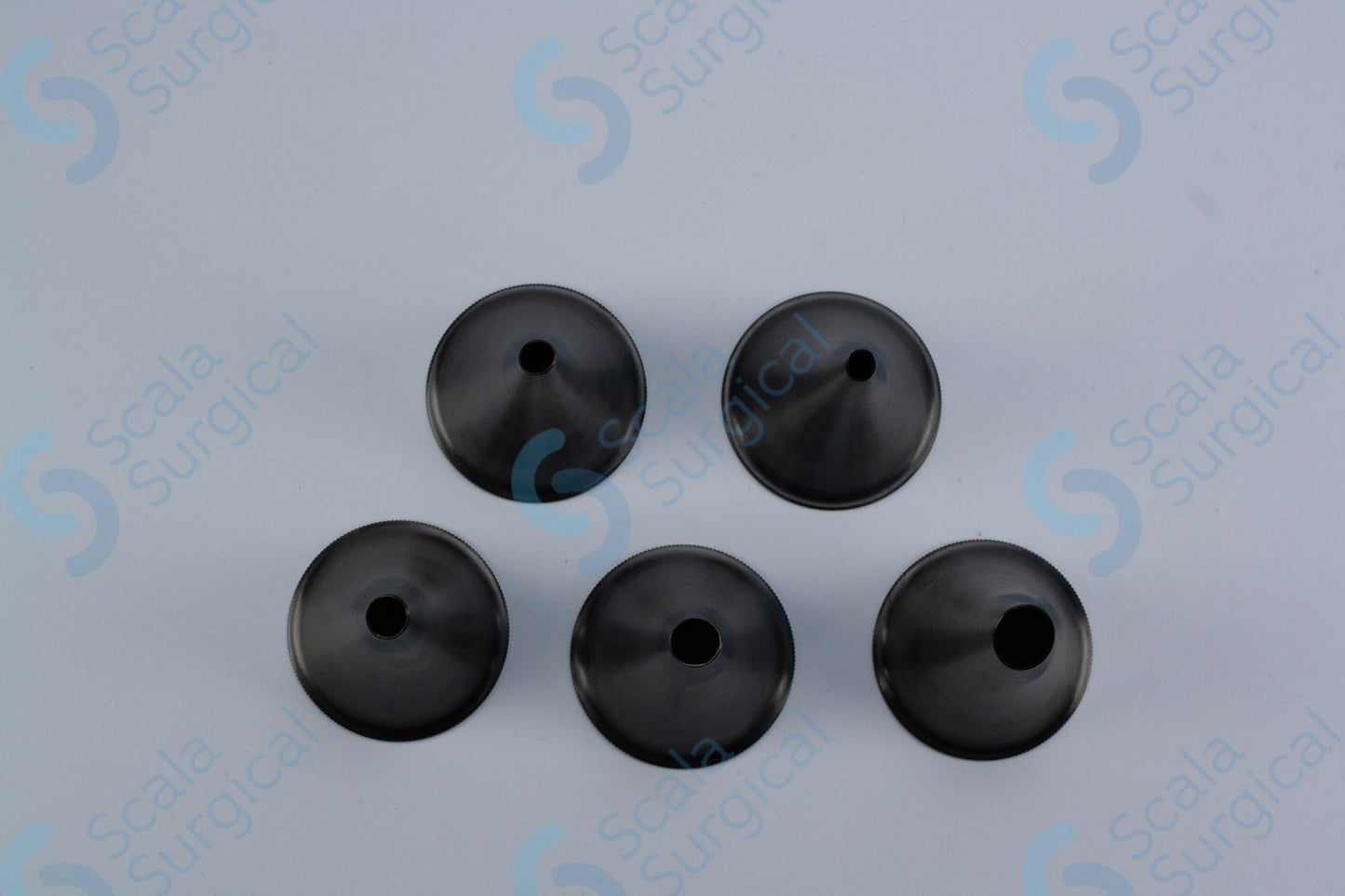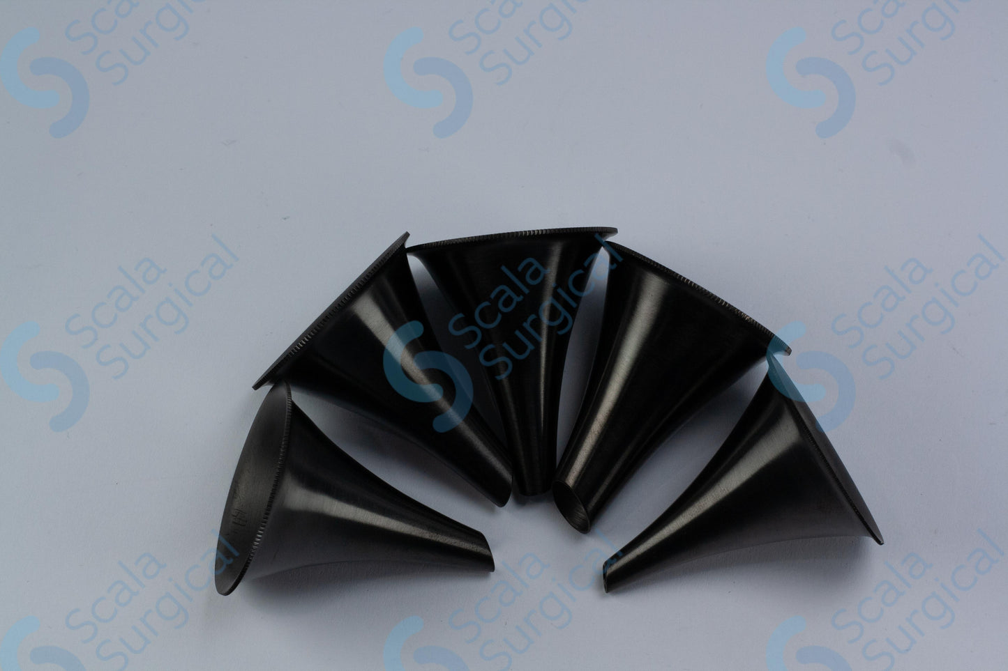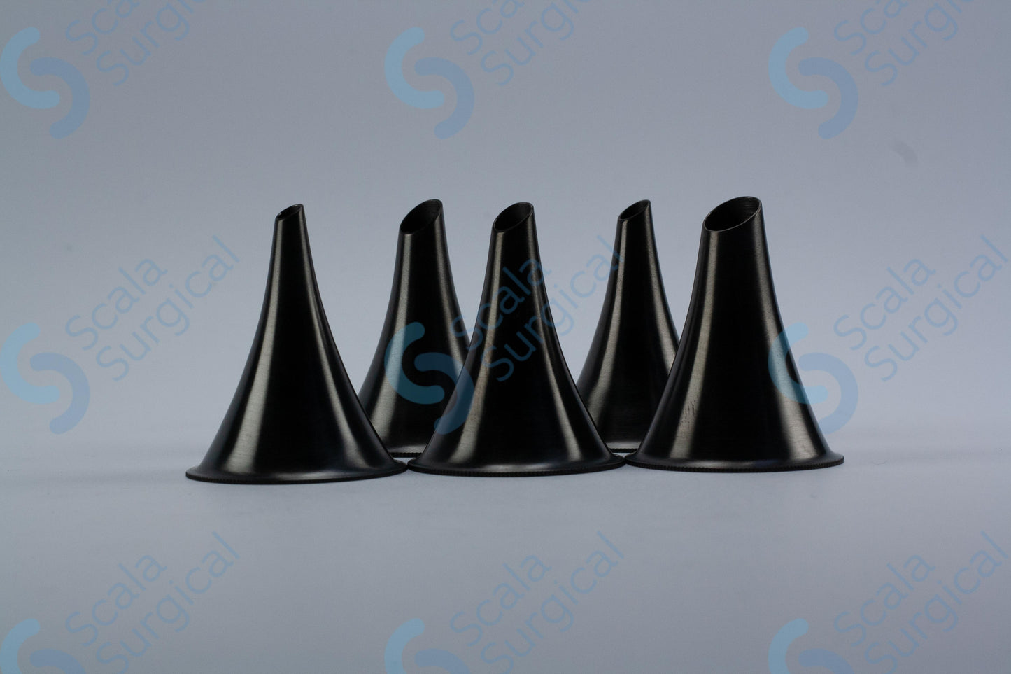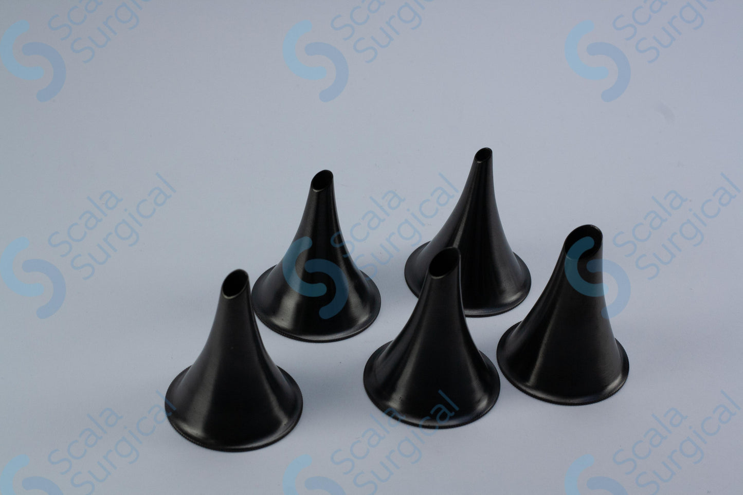 A shea aural speculum is a medical device used by ear, nose, and throat (ENT) specialists for examining the ear canal. The device is inserted into the ear canal and used to hold the ear open for better access and visualization. The black plated set of 5 includes five different sizes of speculums.