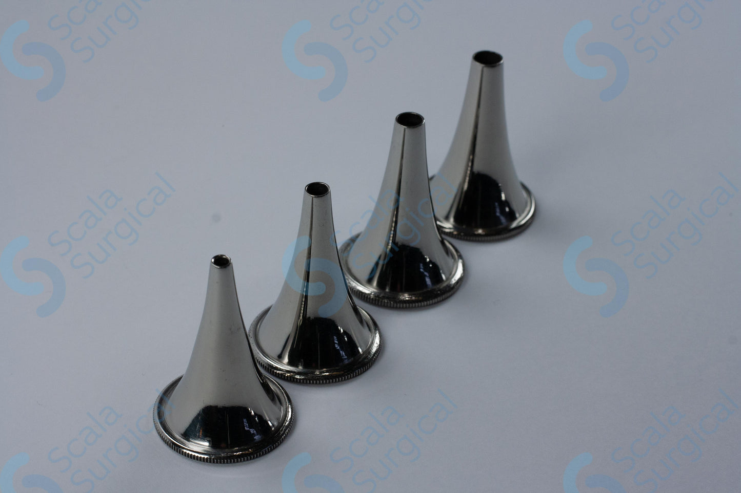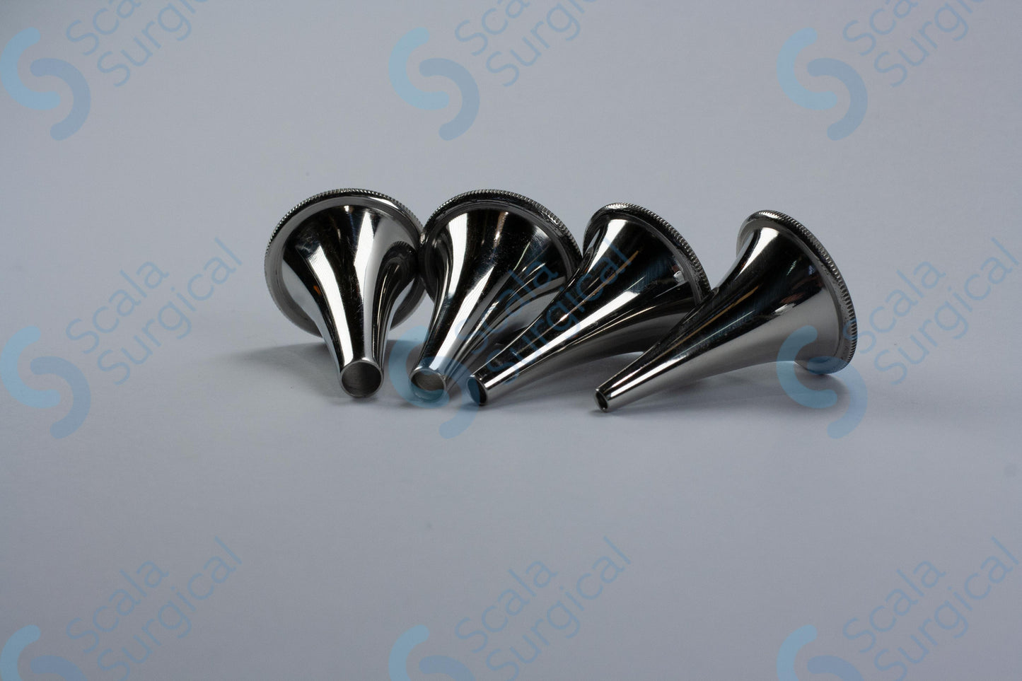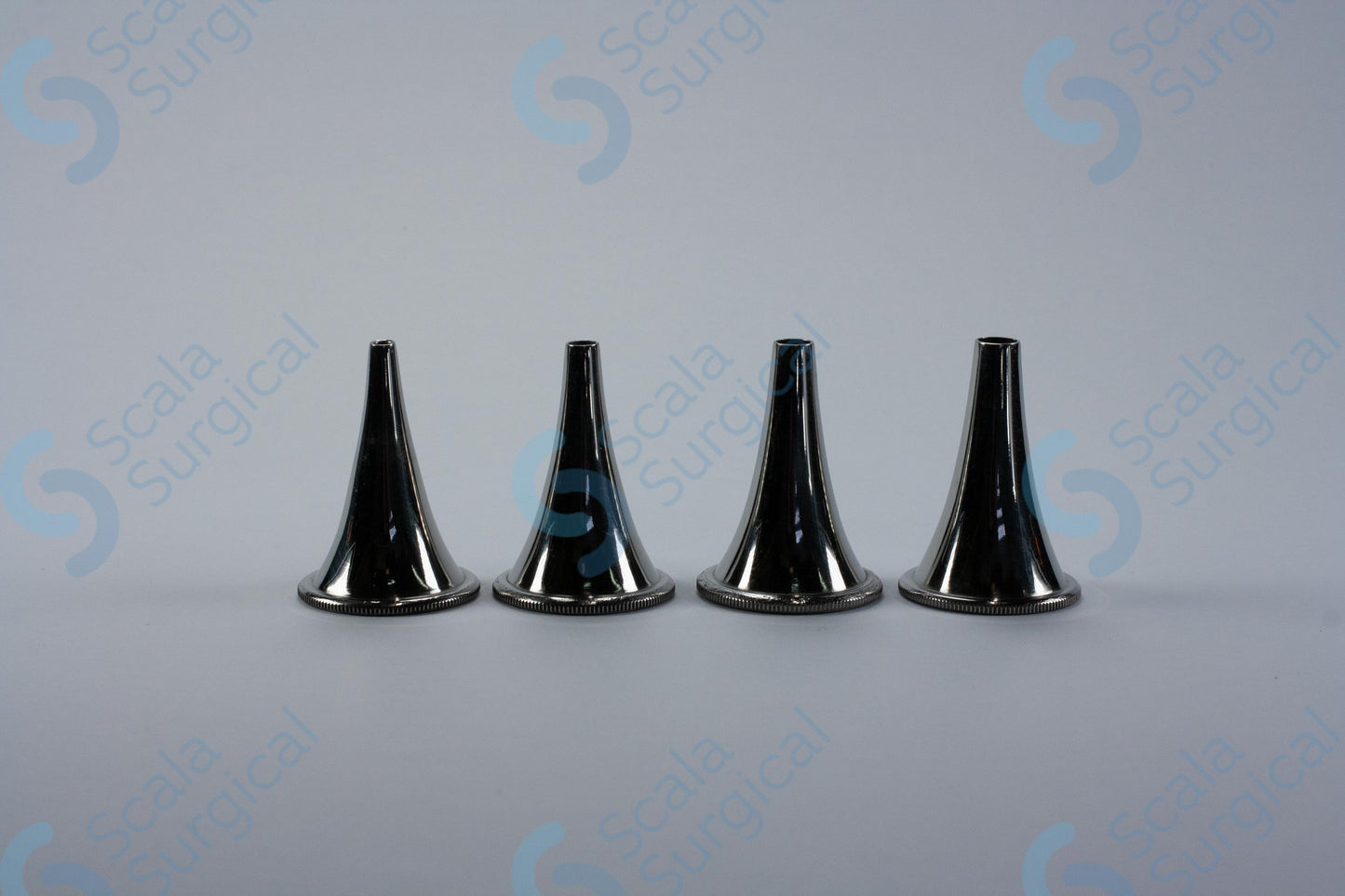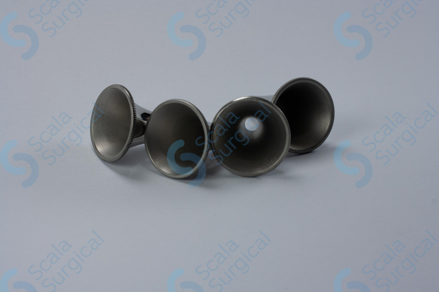 A Toynbee Aural Speculum Set of 4 is a set of four tools used in the surgical field to examine the ear canal. The set includes a Toynbee aural speculum, a pair of forceps, a pair of scissors, and a curette. The tools are used to inspect the ear canal, remove wax and debris, and take biopsies.