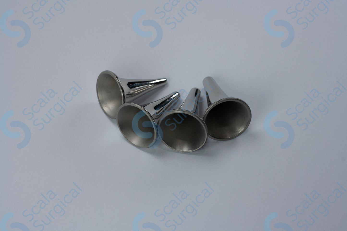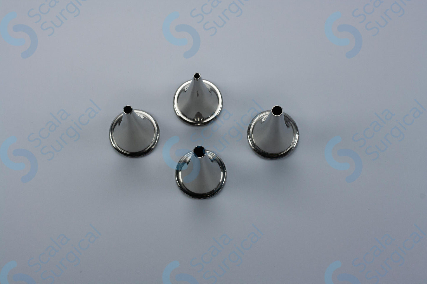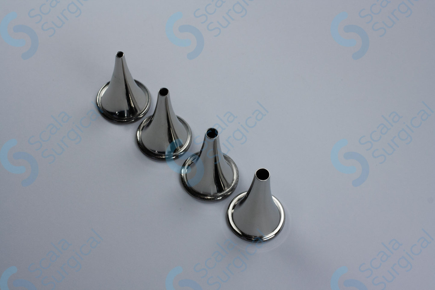 A Toynbee Aural Speculum Set of 4 is a set of four tools used in the surgical field to examine the ear canal. The set includes a Toynbee aural speculum, a pair of forceps, a pair of scissors, and a curette. The tools are used to inspect the ear canal, remove wax and debris, and take biopsies.