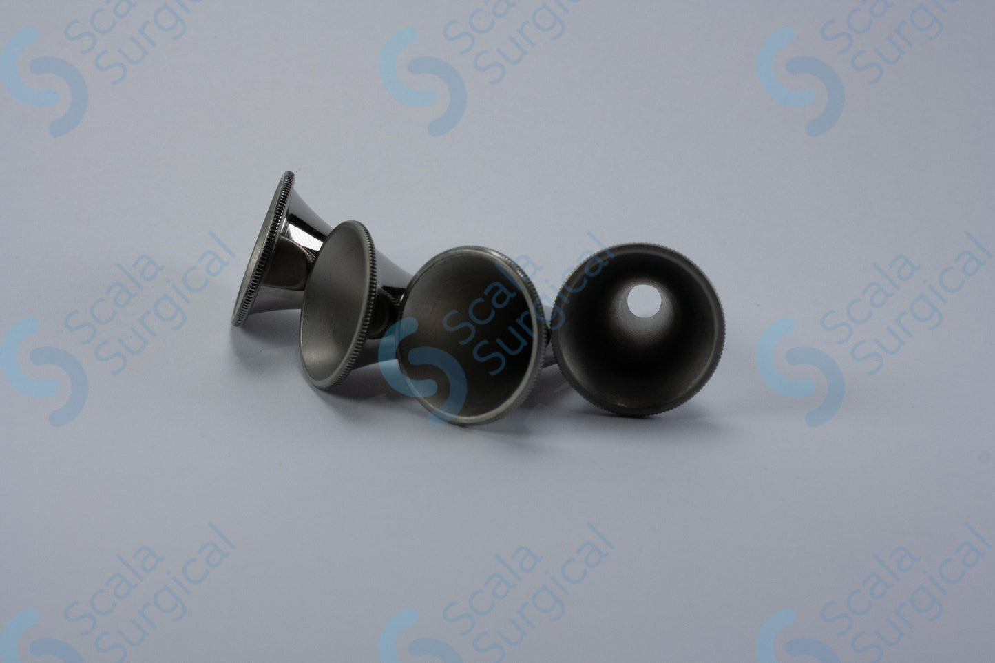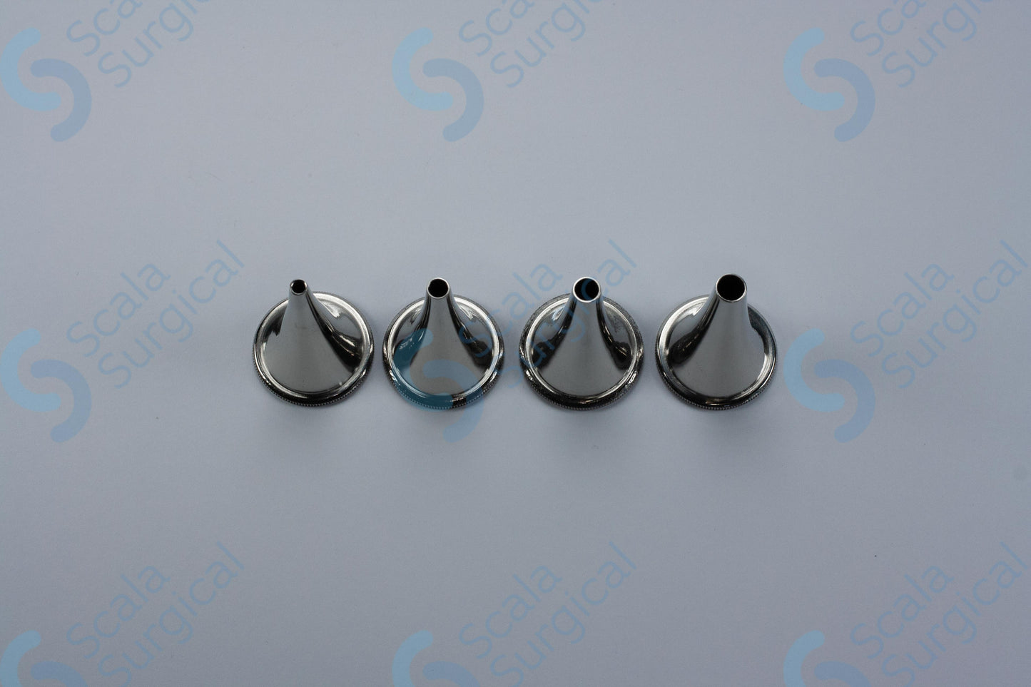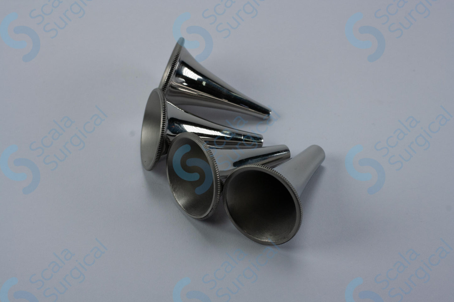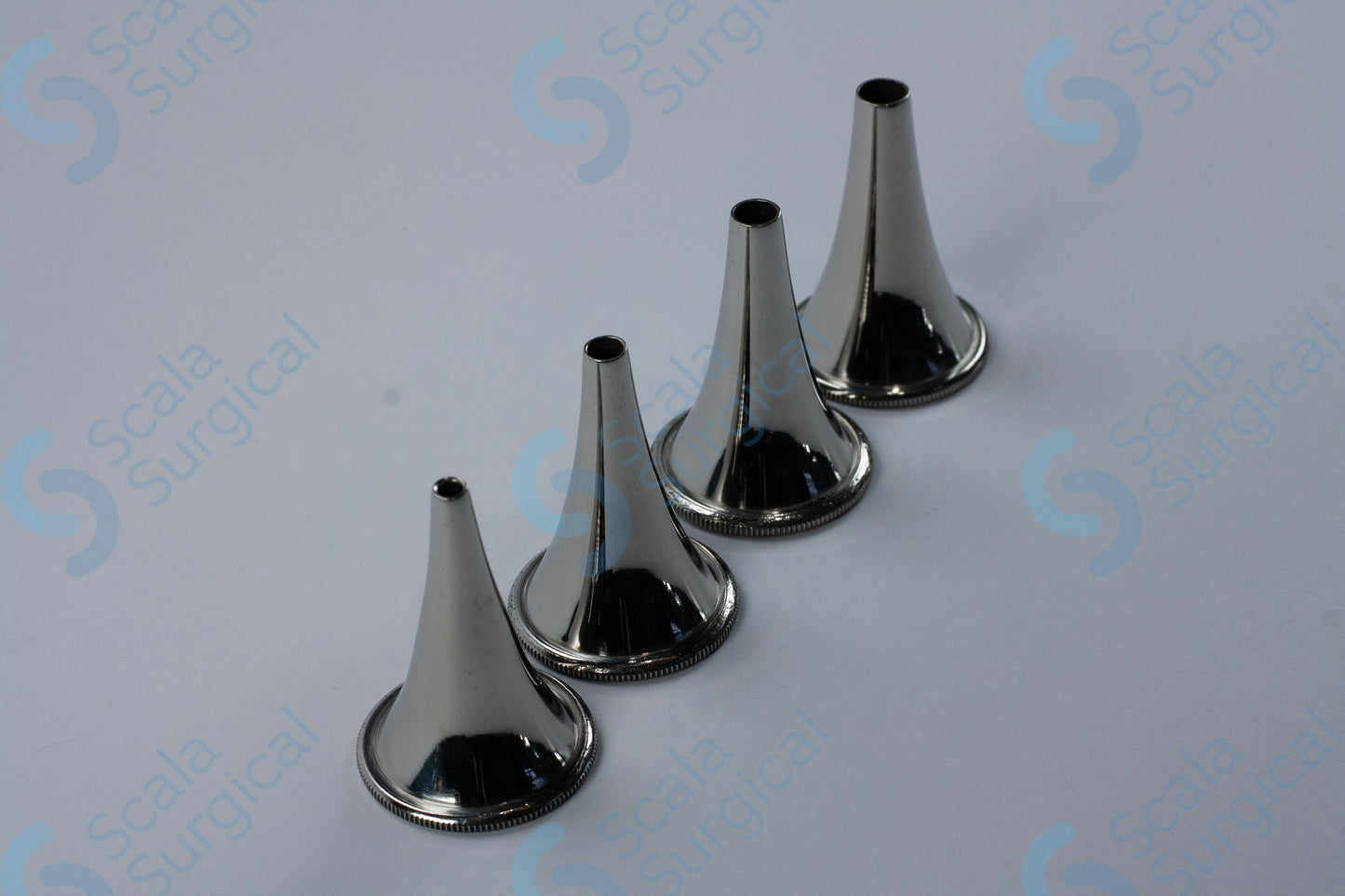 A Toynbee Aural Speculum Set of 4 is a set of four tools used in the surgical field to examine the ear canal. The set includes a Toynbee aural speculum, a pair of forceps, a pair of scissors, and a curette. The tools are used to inspect the ear canal, remove wax and debris, and take biopsies.
