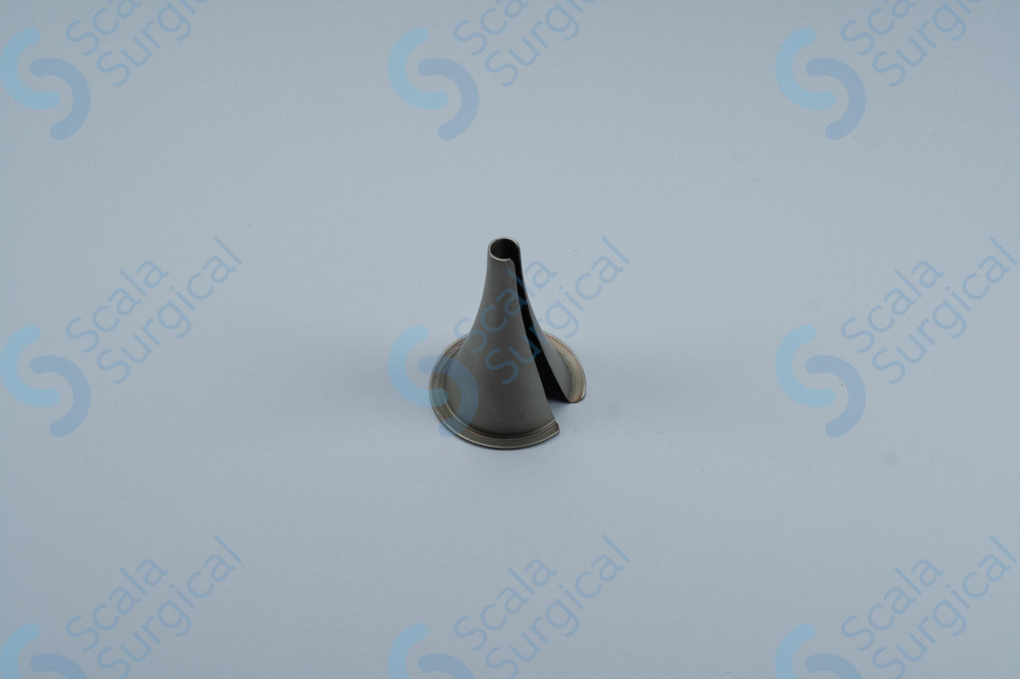 A Tumarkin Aural Speculum is a medical instrument used in otolaryngology (ear, nose, and throat) procedures. It is a metal device with two blades that open to form a spoon-like shape, which is inserted into the ear canal to allow the doctor to examine the ear. The polished 8.5mm size is used to examine and treat adults.