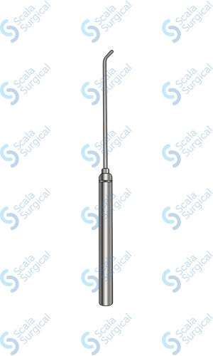 The Cawthorne Aural Wax Hook is a surgical instrument used to remove wax and other debris from the ear canal. It has a curved tip and a loop at the end, allowing the user to safely and effectively remove wax and other debris from the ear canal.