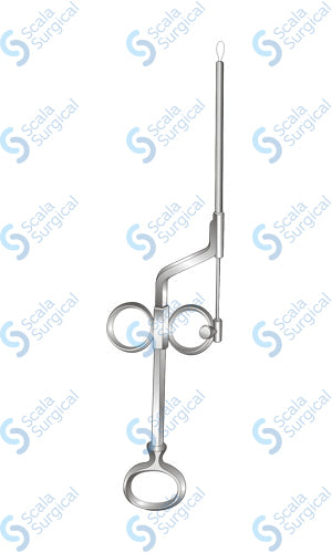The Negus Nasal Snare is a medical instrument used in the surgical field to remove polyps or other tissue from the nasal cavity. It is a long, thin wire loop with a handle at one end and a loop at the other. The loop is inserted into the nasal cavity and the handle is used to tighten the loop around the tissue, allowing it to be gently snared and removed.