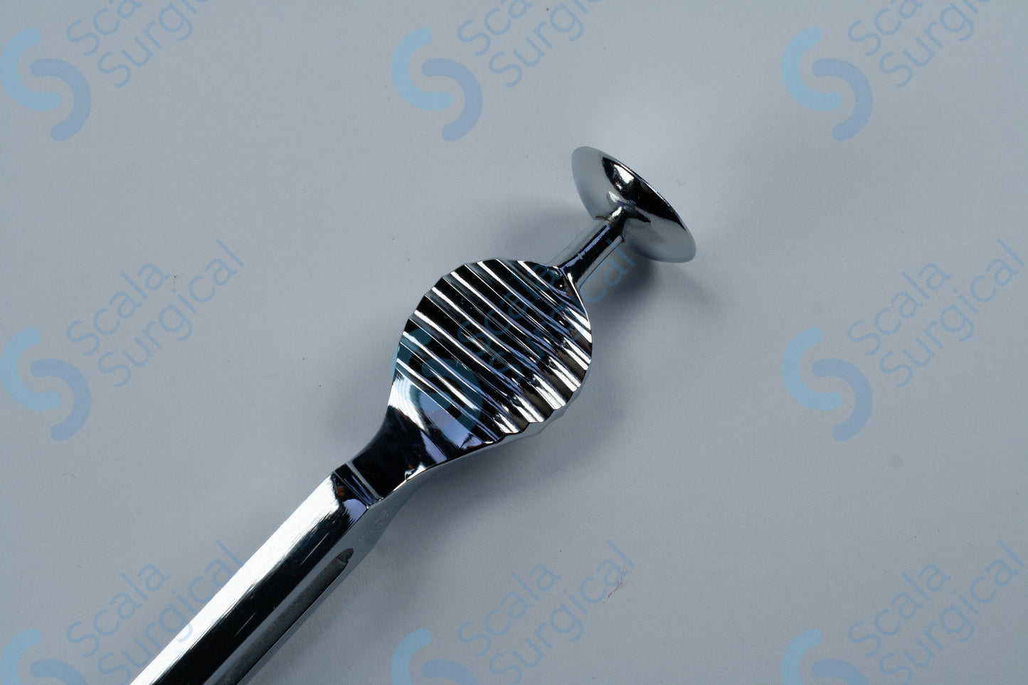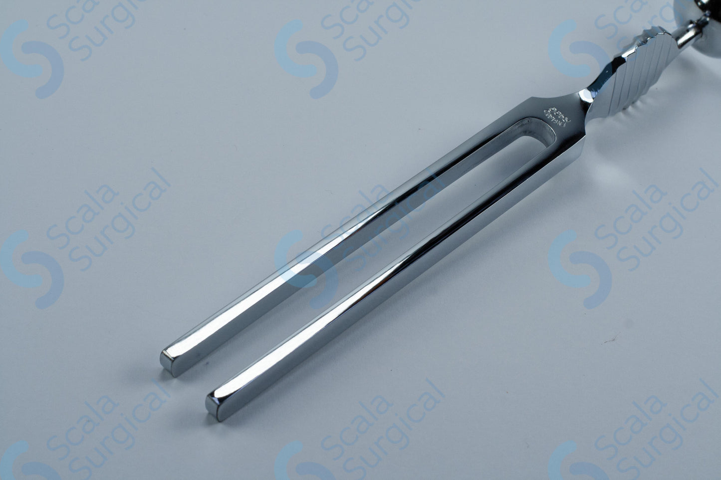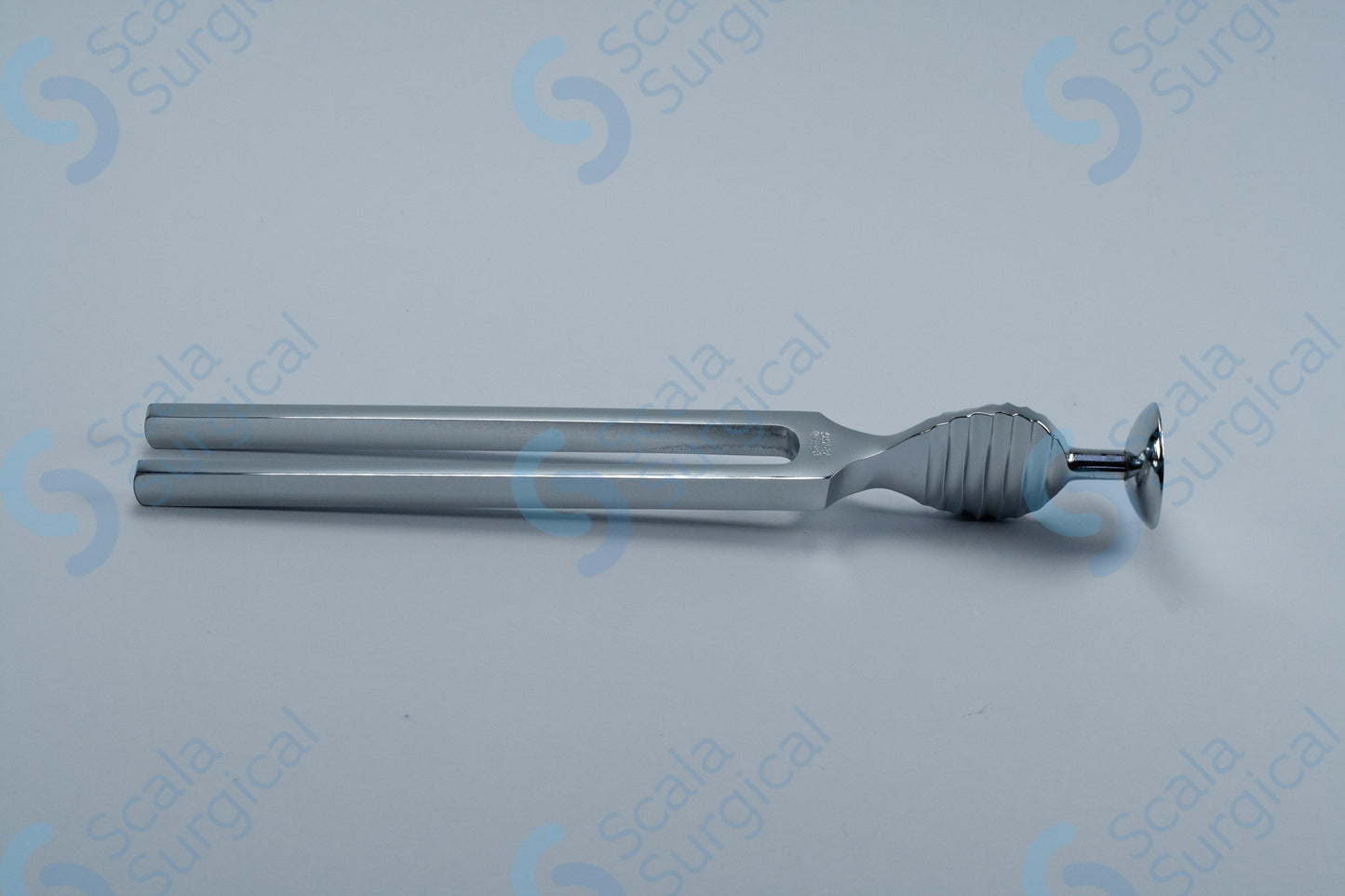 The Ragg Gardiner Brown Tuning Fork C 2 512 Hz is a surgical instrument used to test the hearing of patients. It is placed on the patient's mastoid bone behind the ear and vibrates to produce a sound. The patient is then asked to identify the sound and the medical professional can then determine if the patient has any hearing loss.