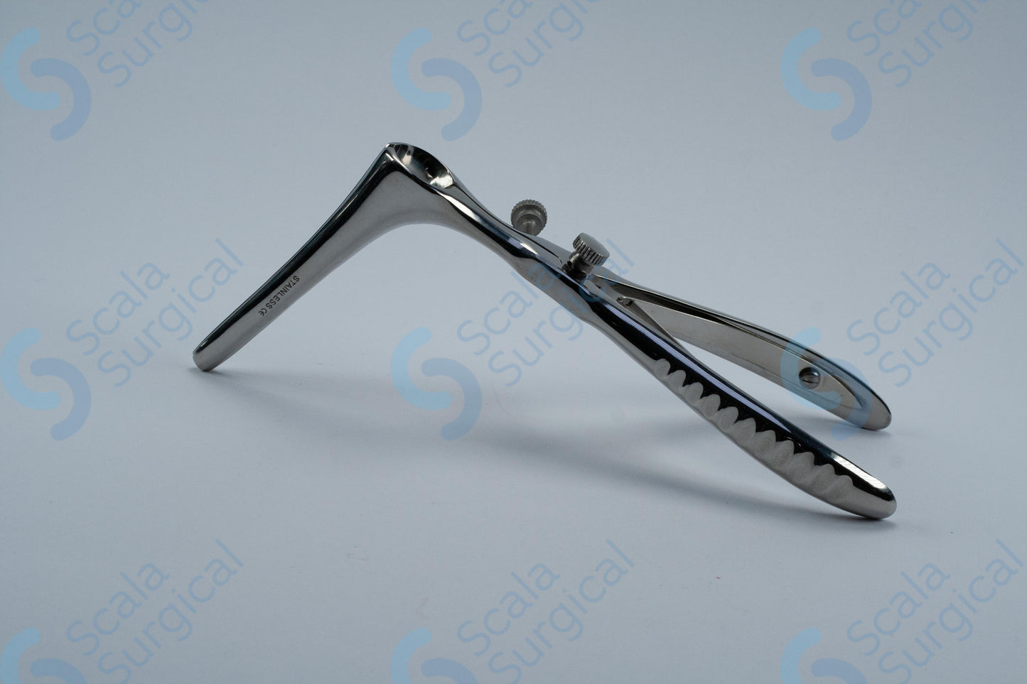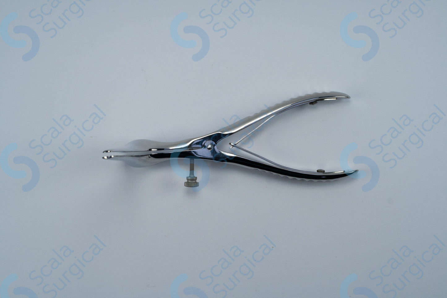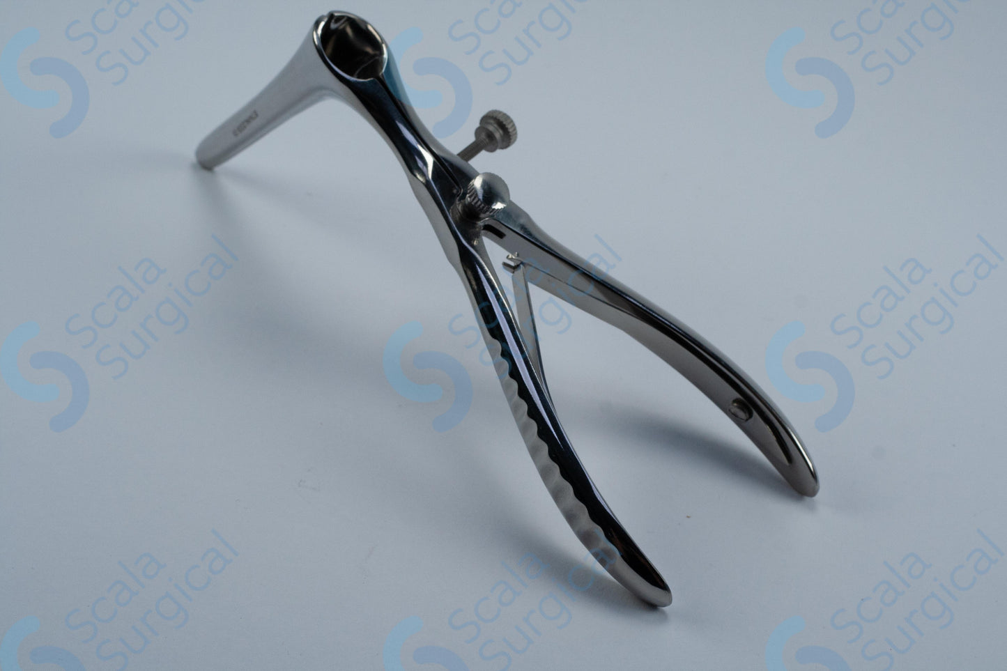 This item is used to hold the nostrils open during a nasal procedure. The screw adjustment allows the user to adjust the length of the blade to fit the patient's anatomy.