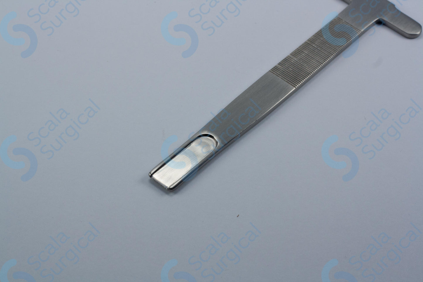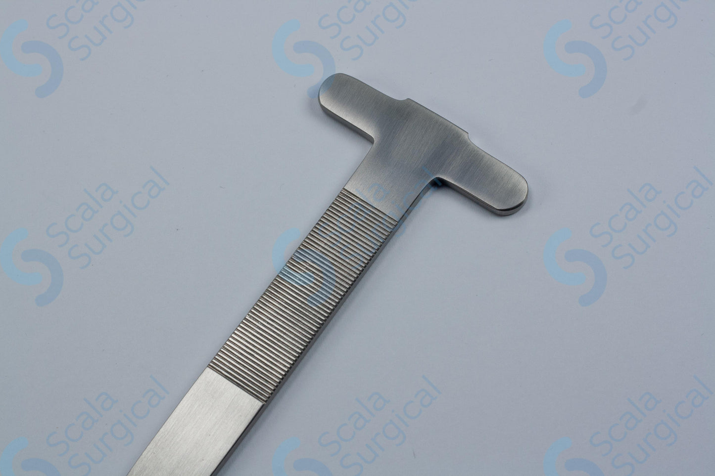 A Robin Nasal Chisel with a T-Shaped Handle Medium is a surgical instrument used for chiseling and sculpting the nasal bones during rhinoplasty surgery. The chisel width tapers from 10mm to 12mm.