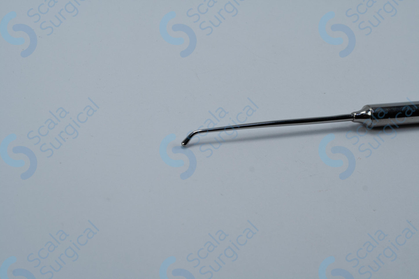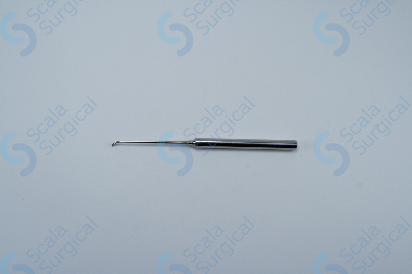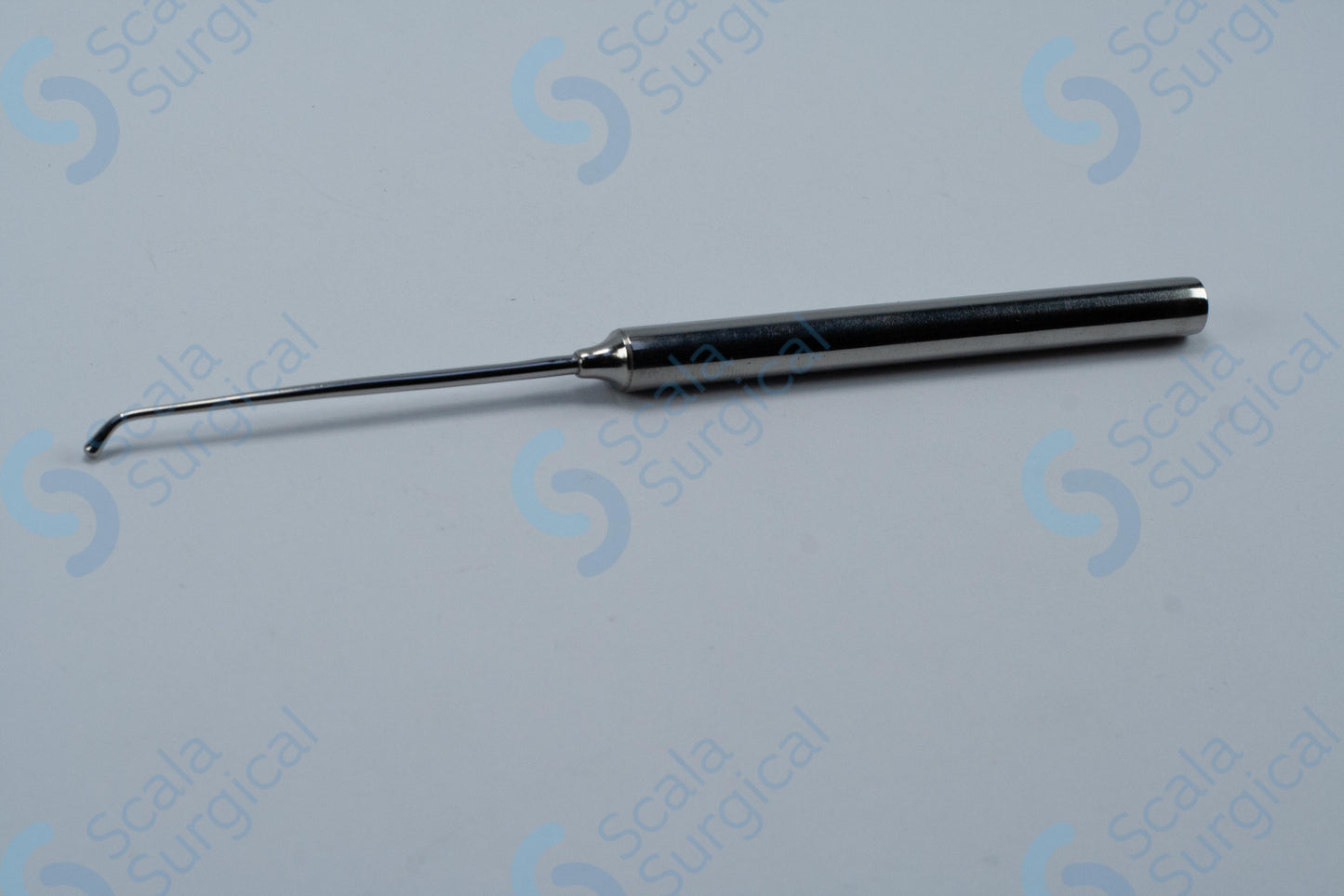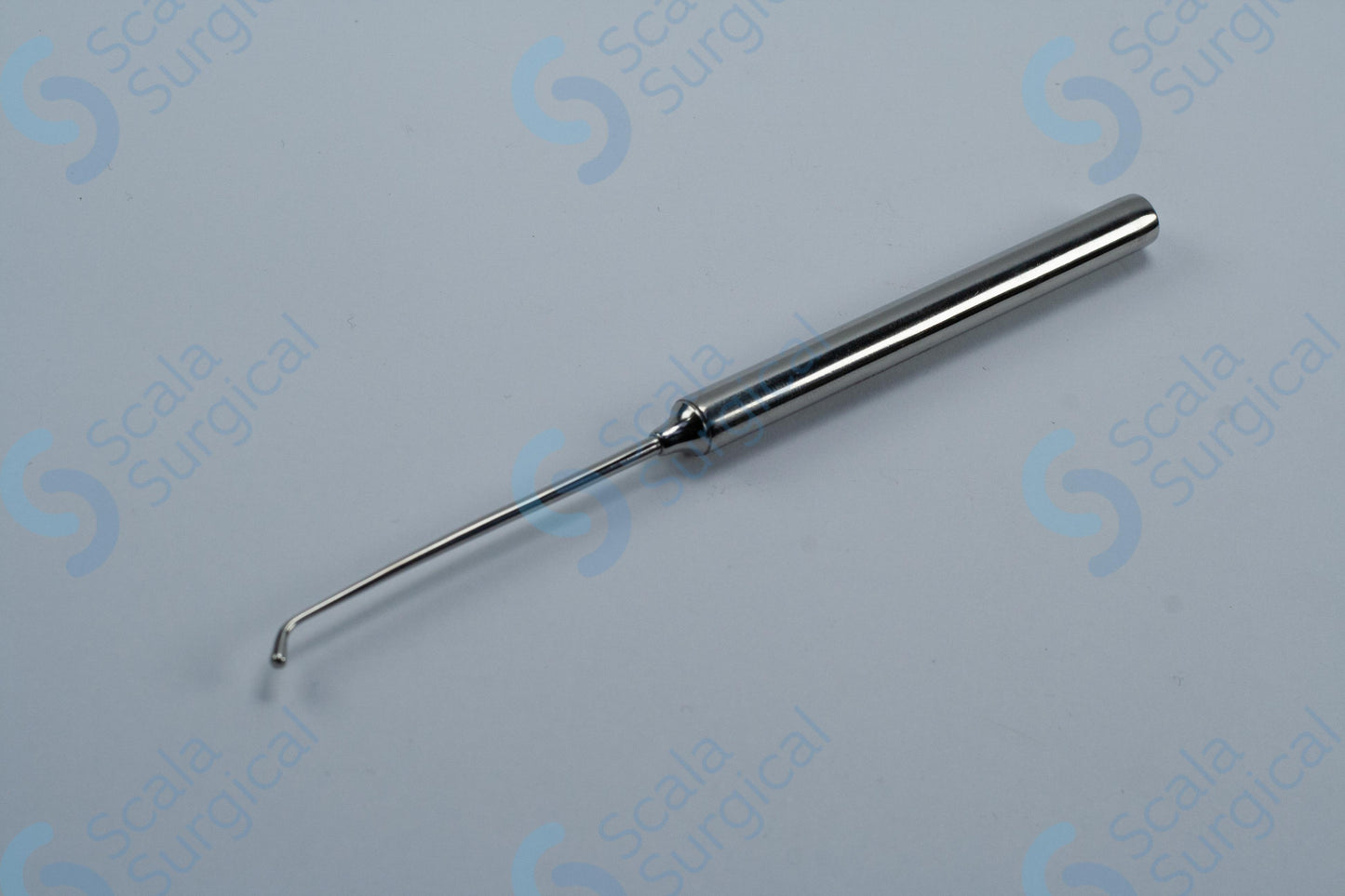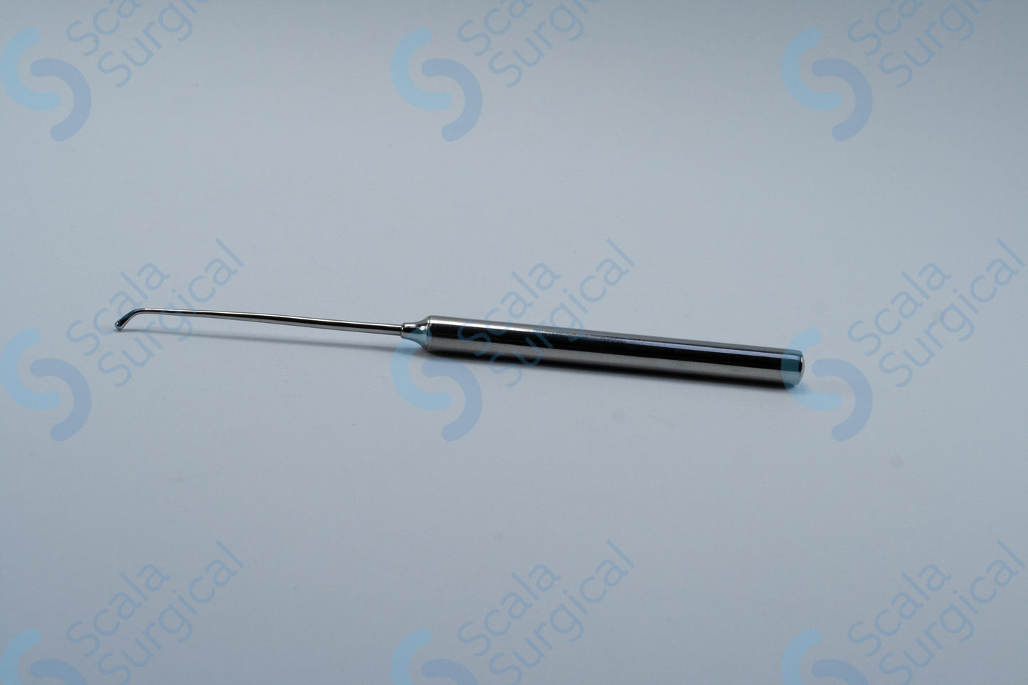 The Cawthorne Aural Wax Hook is a surgical instrument used to remove earwax from the ear canal. It is a curved metal hook with a blunt end that is inserted into the ear canal to grab and remove wax.