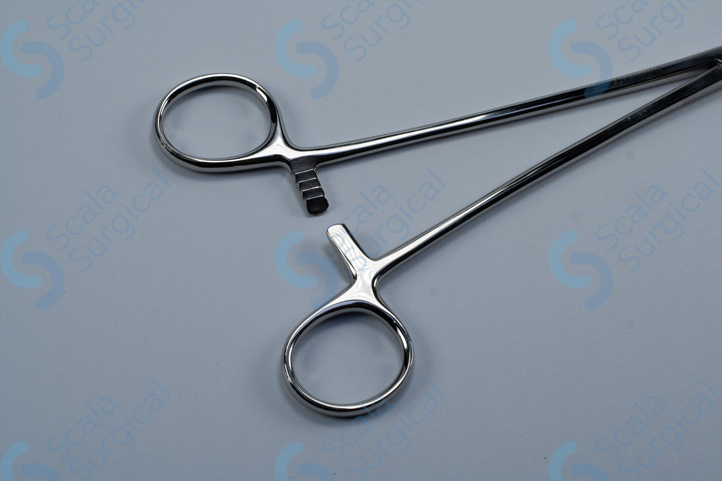 The Faure Hysterectomy Clamp is a surgical instrument used in hysterectomy procedures. It is designed to securely clamp and hold the uterus in place during the procedure. The 1 x 2 teeth and slight curve of the box joint helps to provide a secure grip and better control of the uterus during the hysterectomy.