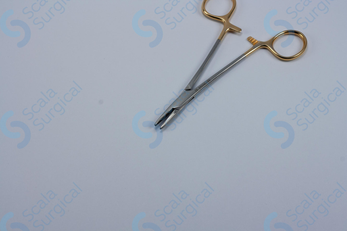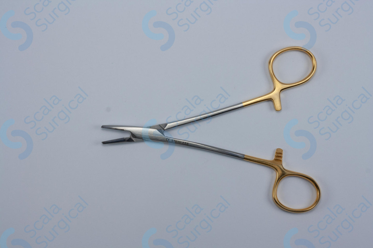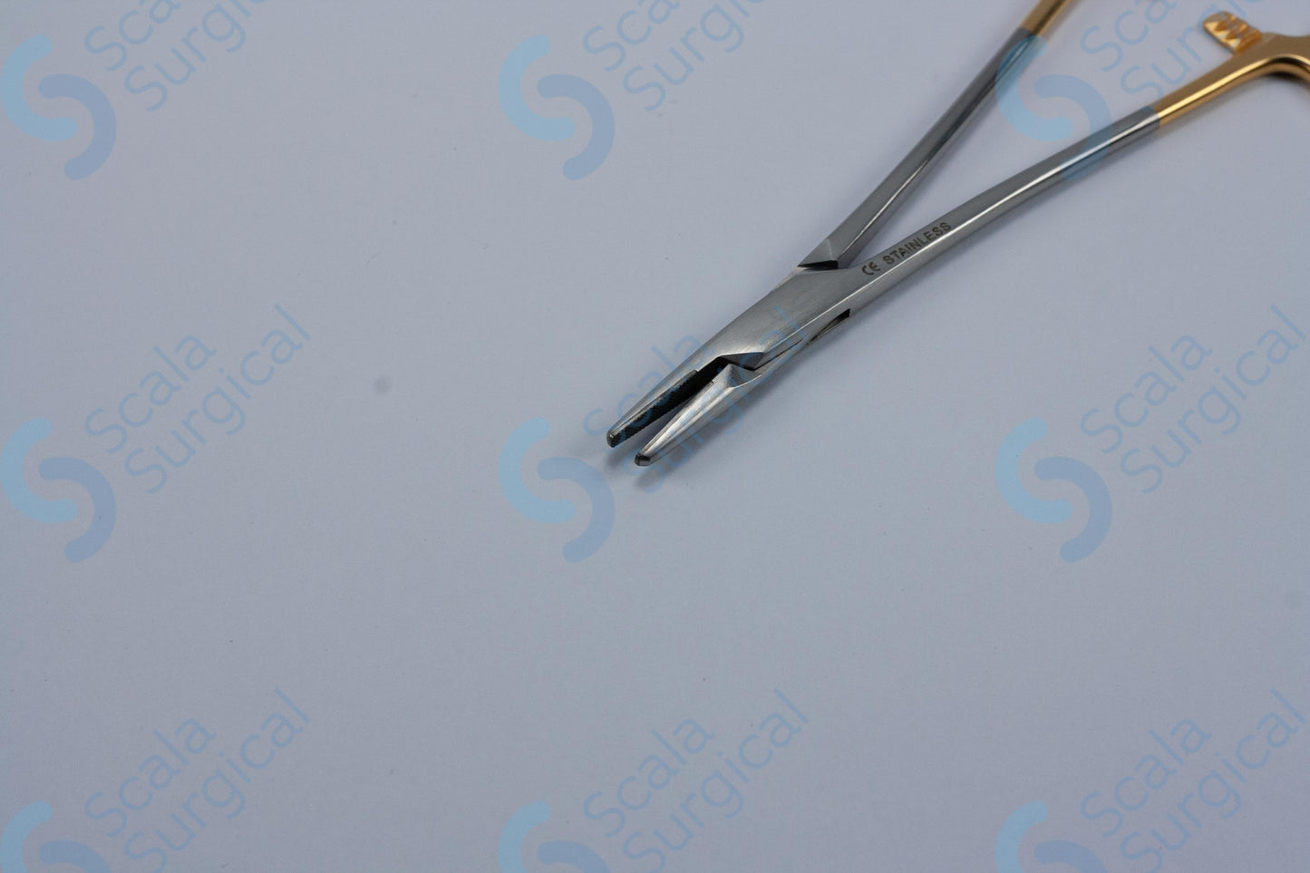 The Mayo Hegar Needle Holder Tungsten Carbide Jaws Box Joint (139.7mm) (5? inch) is a tool used in the surgical field to hold and manipulate suturing needles during surgical procedures. It is designed to provide a secure grip on the needle and help the surgeon with accuracy and precision when suturing.