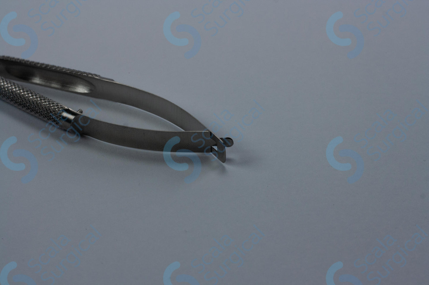 This is a tool used to hold a needle during ophthalmic surgery. It has a curved handle and no catch, making it easier to maneuver in tight spaces. The handle is spring-loaded, which helps to ensure a secure grip on the needle.
