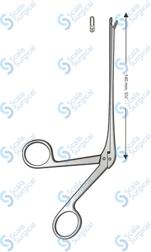This is a surgical instrument used for cutting and removing bone. It is typically used for spinal surgeries, such as for spinal fusion or for discectomy. The shaft length and bite size refer to the size of the instrument, which is 140mm long with a 2mm bite size. The 5? inch refers to the length of the handle.