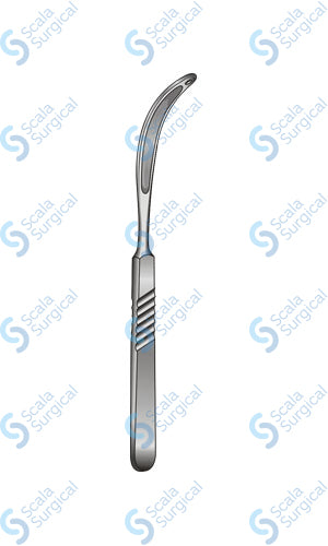 A Kocher Thyroid Dissector Full Curve With Eye is a surgical instrument used in thyroid surgery to separate the thyroid gland from the surrounding tissue. It is a curved, double-ended instrument with a hook-like tip and an eyelet at the end. The hook is used to grasp and hold tissue while the eyelet is used to pass sutures.