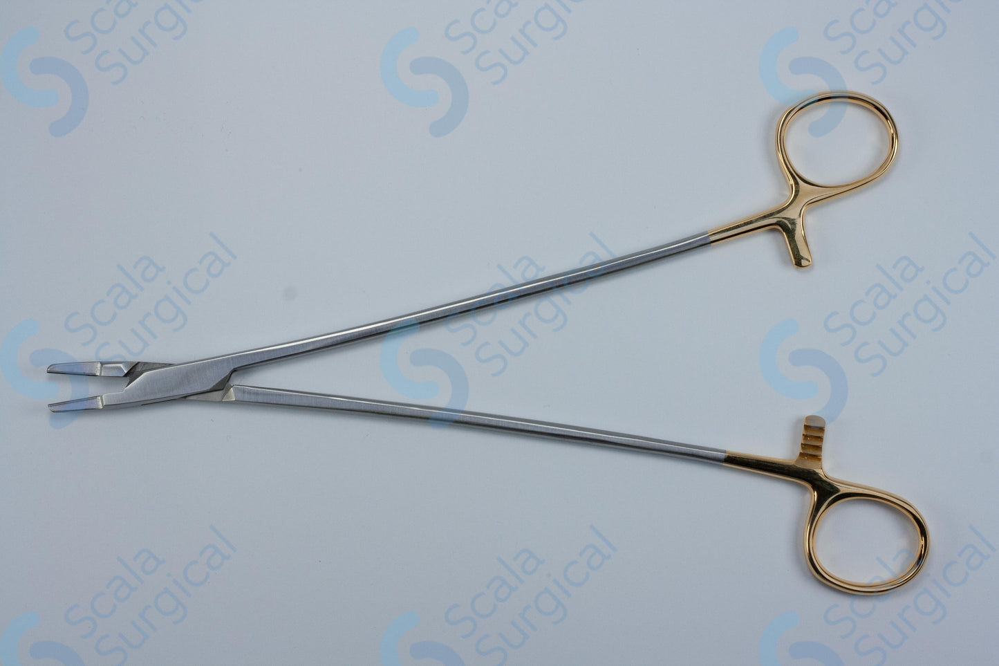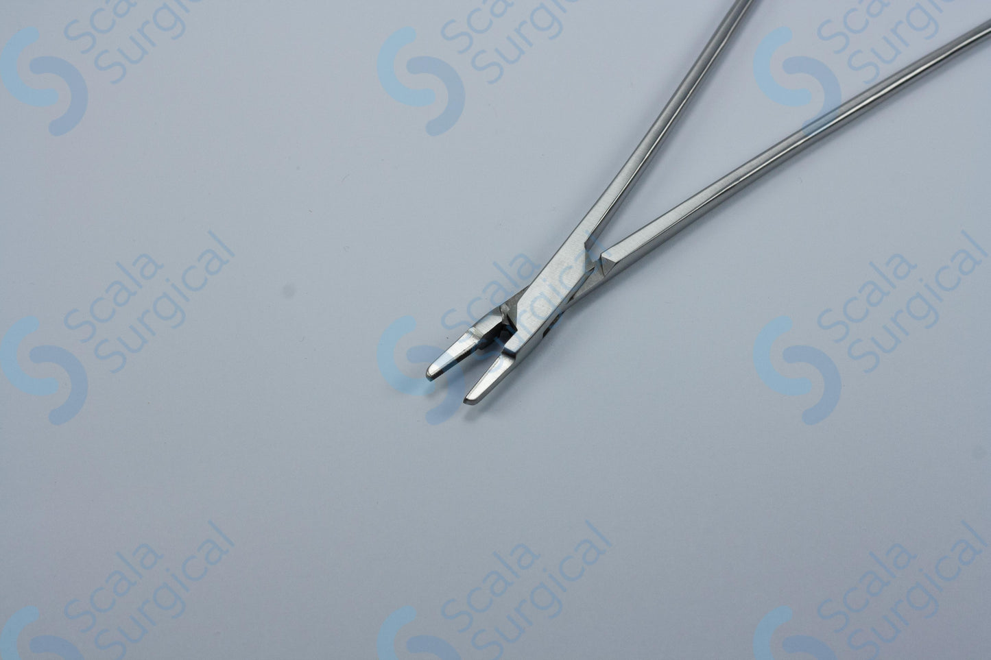 This item is a needle holder used for suturing during surgery. It has a box joint, a locking mechanism, and tungsten carbide jaws for a secure grip on the needle. The French eye allows for easy threading of the needle. The 255mm (10 inch) size is ideal for larger suturing tasks.