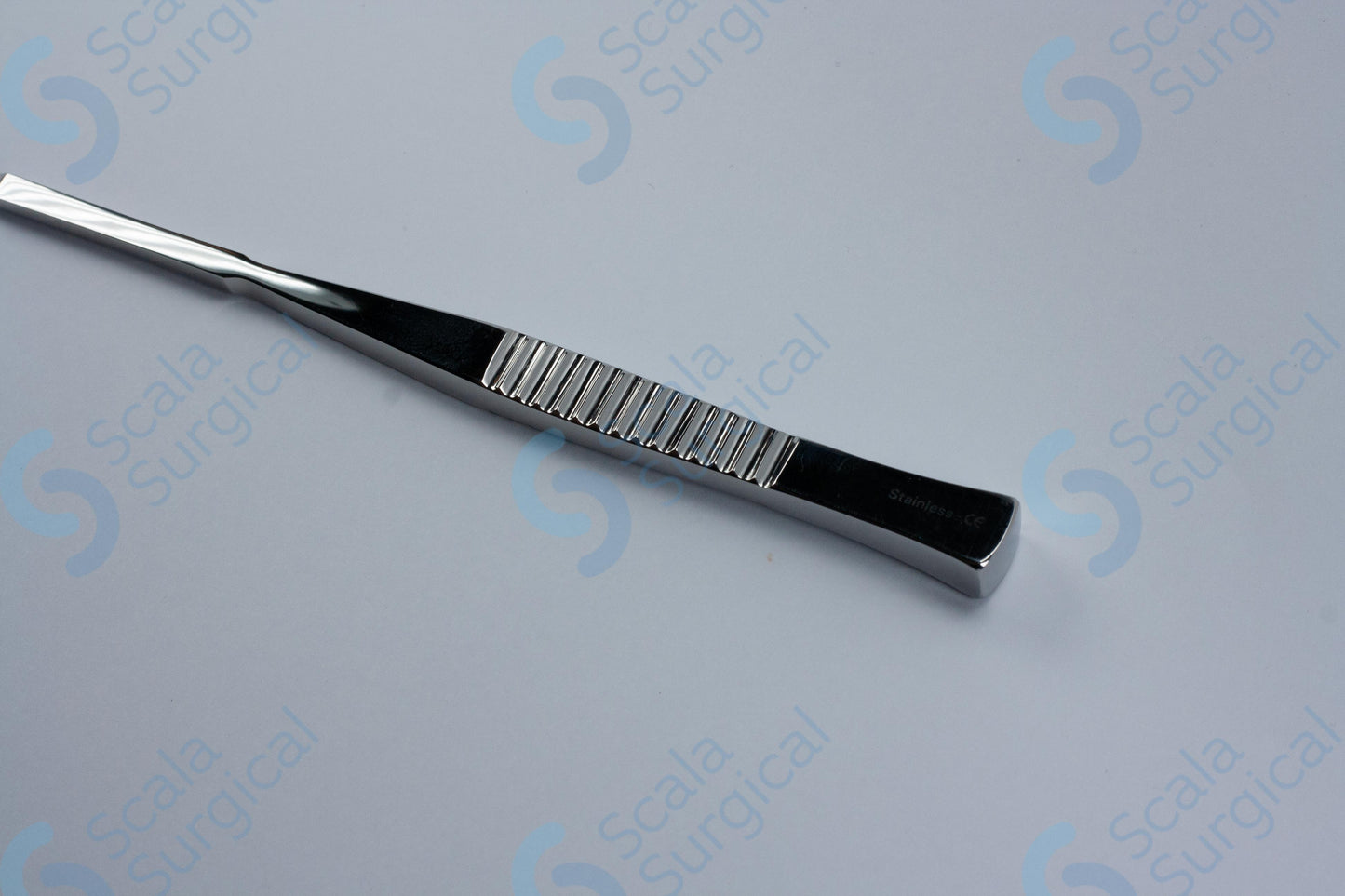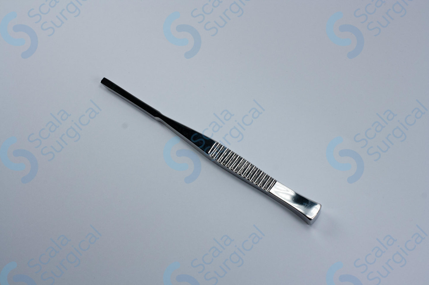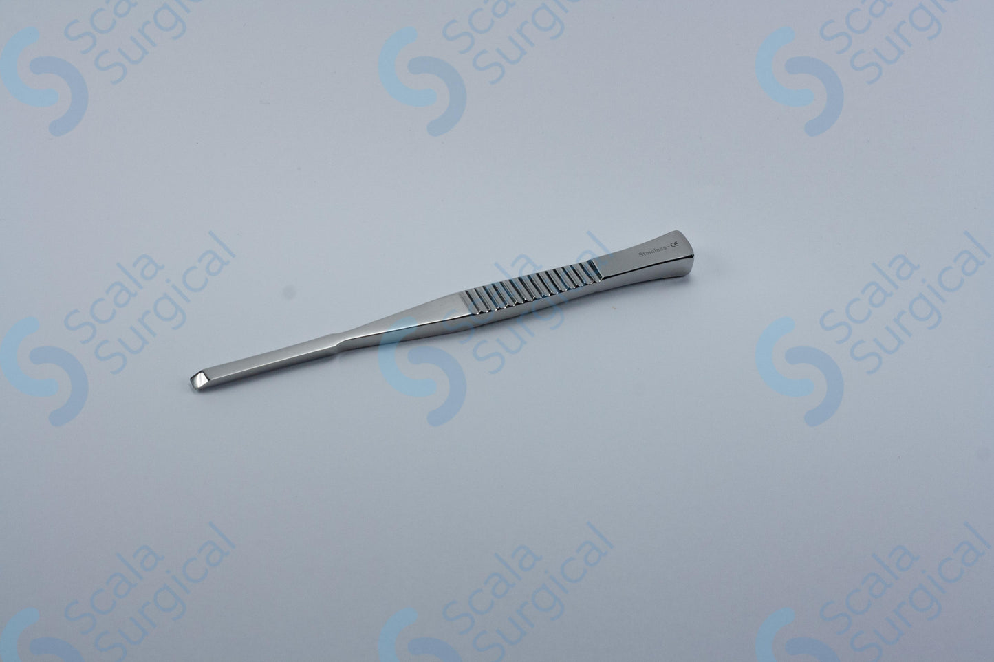 Bone chisels with a square grooved handle are used in the surgical field to cut through bone and other hard tissue. The chisel width of 4mm and the length of 139.7mm (5? inch) are important factors when selecting the right chisel for the job. They are often used in orthopedic and trauma surgeries to cut through bone and other hard tissue.