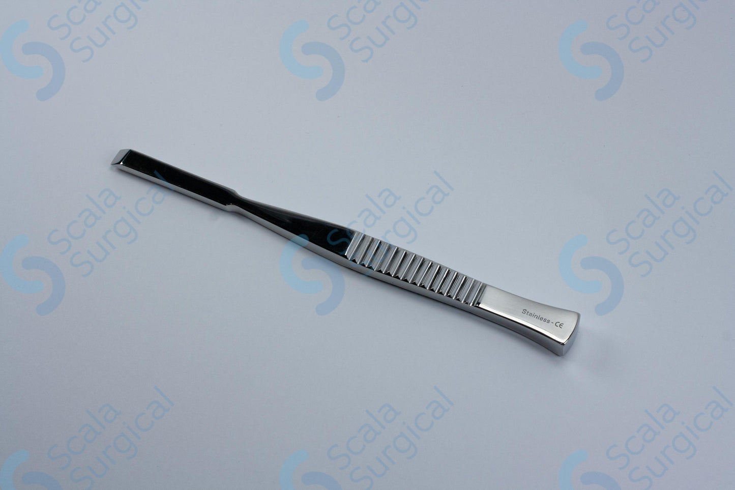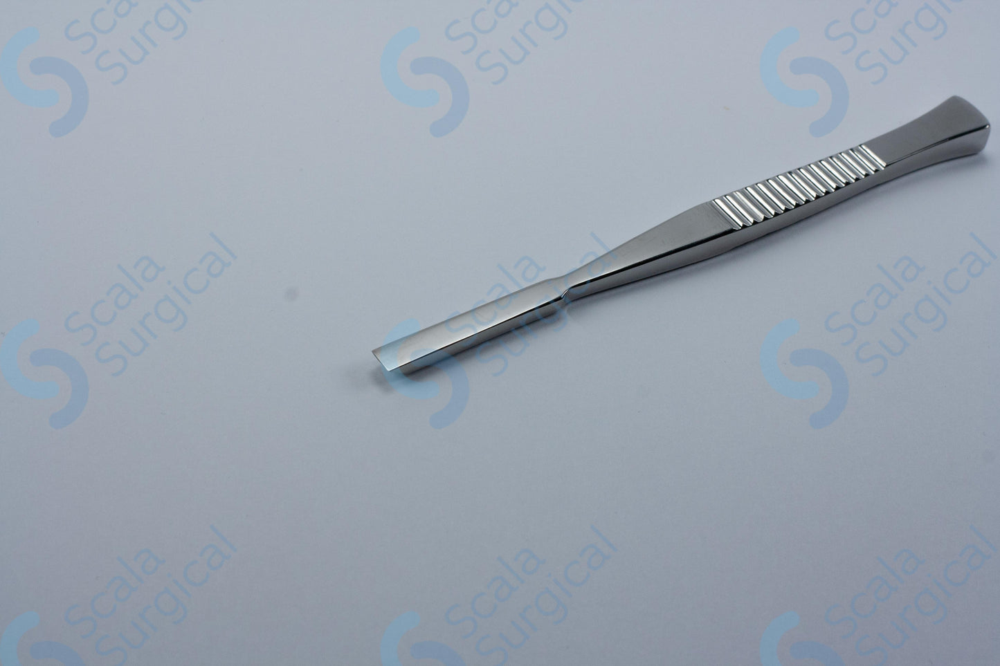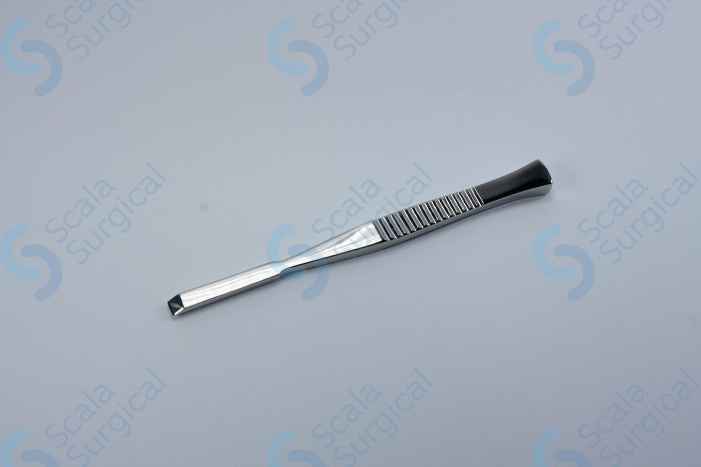 Bone chisels with a square grooved handle are used in orthopaedic surgery to cut, shape, and remove bone. They can be used to remove small amounts of bone, shape and smooth bones, and prepare surfaces for joint replacements. The size of the chisel (in this case 6mm) will determine the size of the cuts and the amount of bone that can be removed.