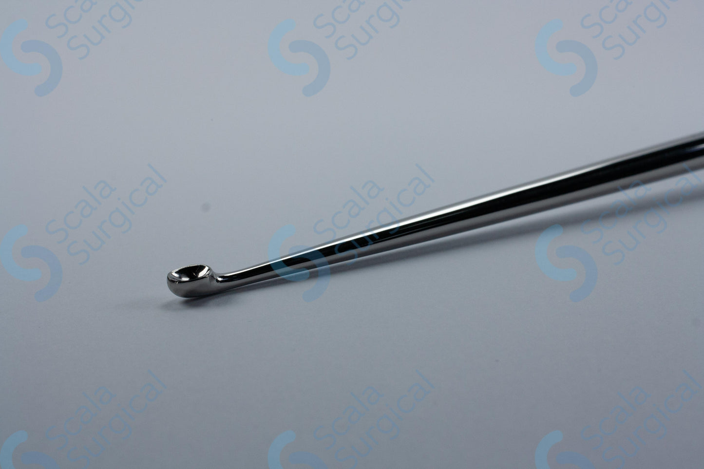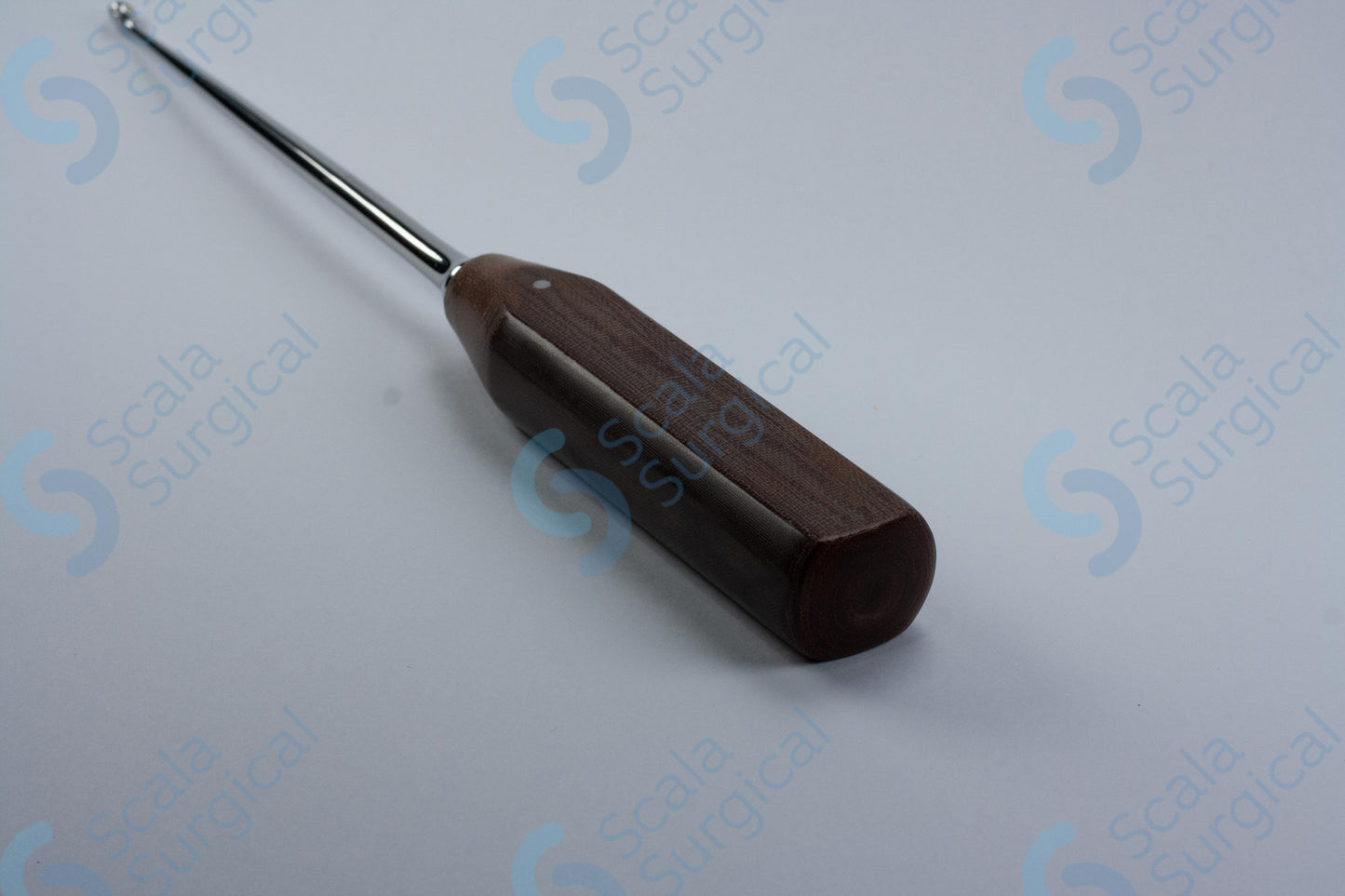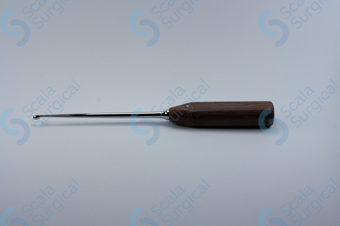 A bone currette with a Tufnol handle is a surgical instrument used to scrape and remove bone. It is commonly used in orthopedic and trauma surgeries. The size of the instrument refers to the diameter of the blade, in this case 4.4mm, and the length of the handle, 10? inches.