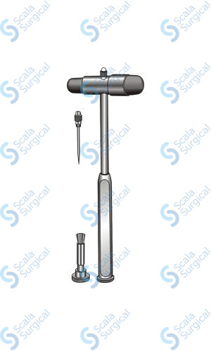 The Buck Percussion Hammer Pin and Brush inside Handle is a device used to assess the sensation of a patient's skin. The pin is used to test for sharp sensation, while the brush is used to test for dull sensation. This is a common tool used in neurological examinations.