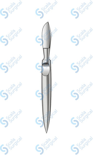 The Esmarch Plaster Knife Solid Handle (177.8mm) (7 inch) is a surgical instrument used to cut plaster casts and orthopedic bandages. It is designed to easily cut through the material without causing any damage to the underlying skin.