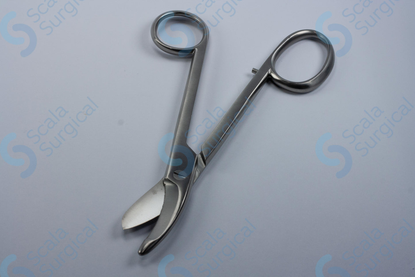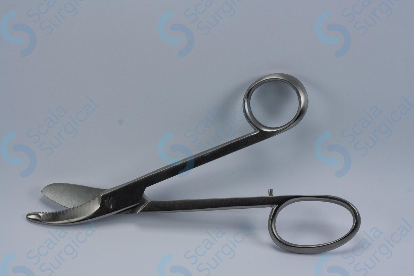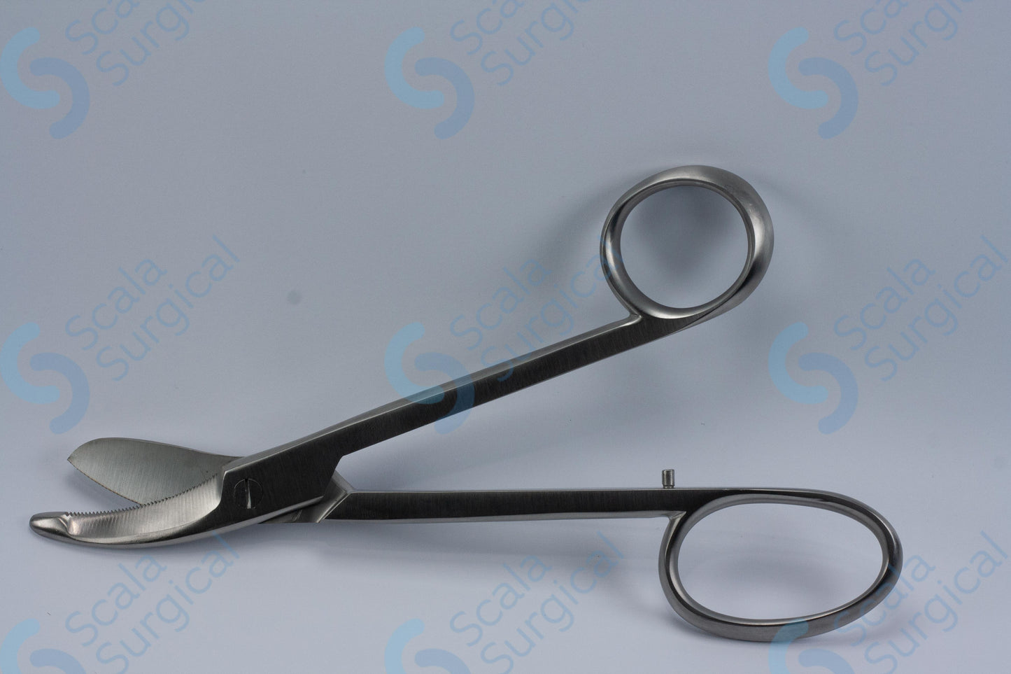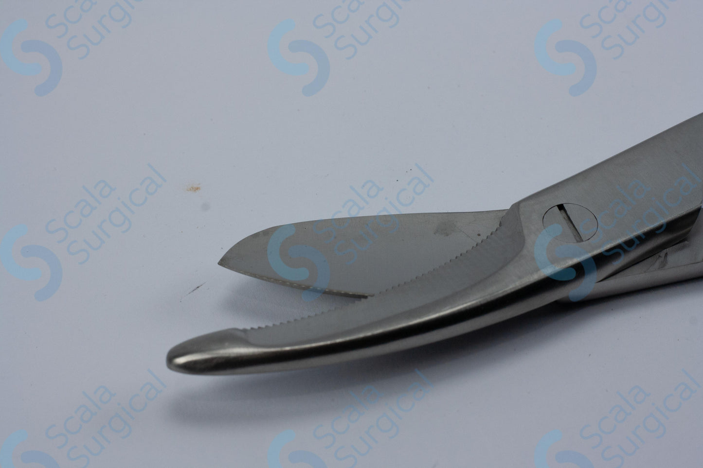 This item is used to cut plaster casts for medical purposes. The serrated lower blade is designed to be used with a handle to safely and efficiently cut through the plaster.