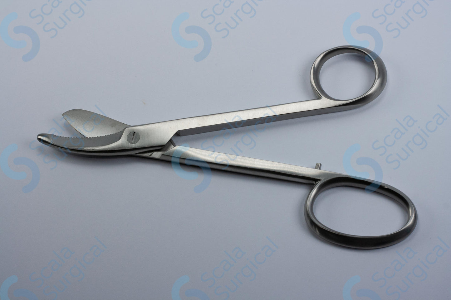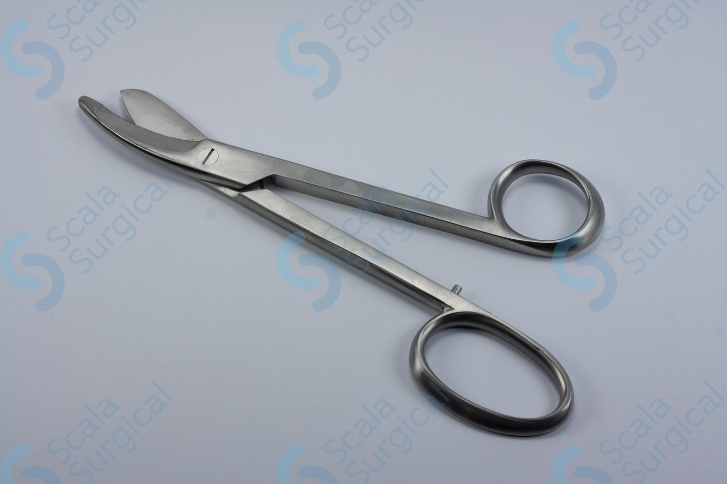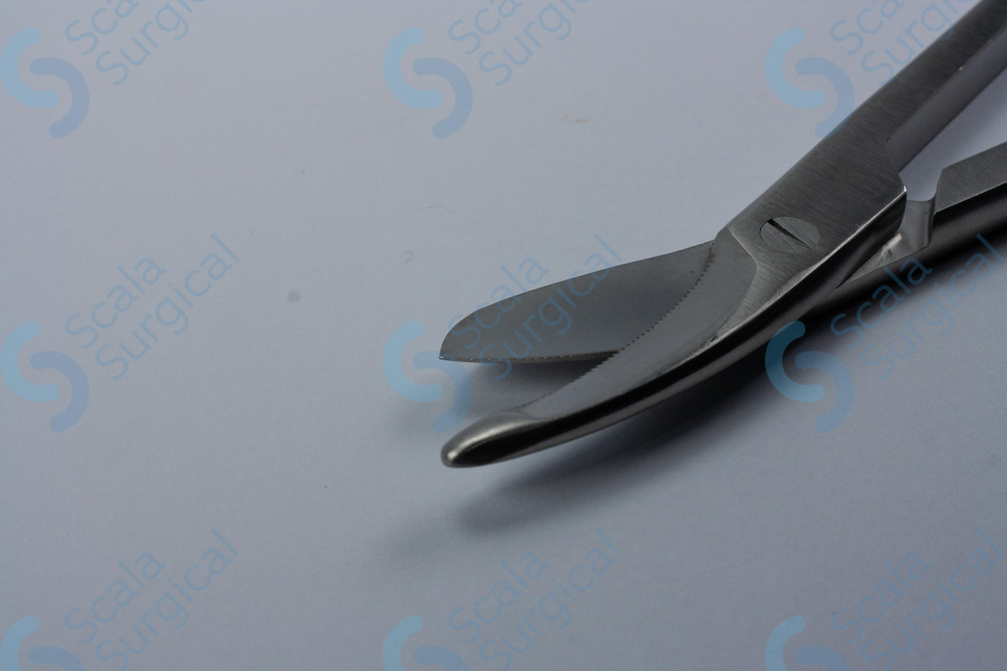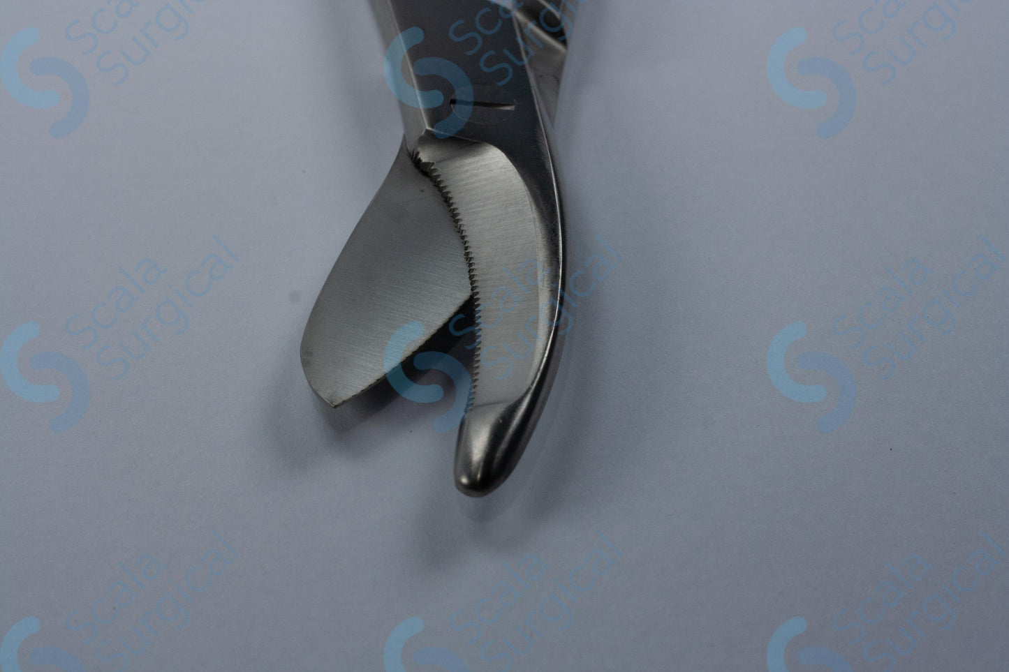 This item is used to cut plaster casts for medical purposes. The serrated lower blade is designed to be used with a handle to safely and efficiently cut through the plaster.